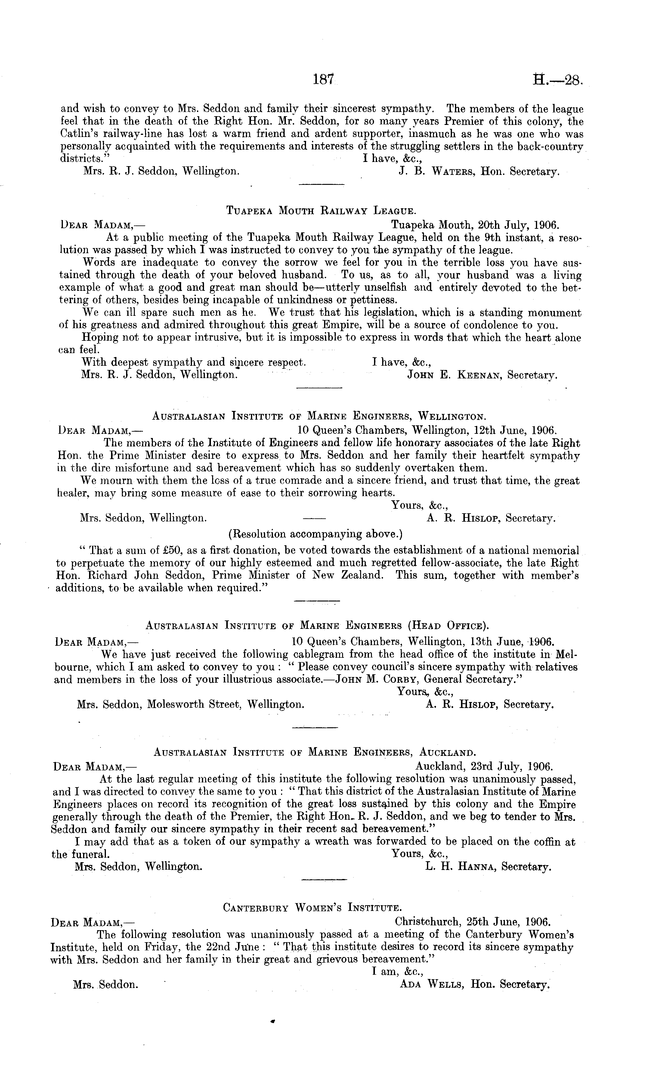and wish to convey to Mrs. Seddon and family their sincerest sympathy. The members of the league feel that in the death of the Right Hon. Mr. Seddon, for so many years Premier of this colony, the Catlin's railway-line has lost a warm friend and ardent supporter, inasmuch as he was one who was personally acquainted with the requirements and interests of the struggling settlers in the back-country districts." I have, &c, Mrs. R. J. Seddon, Wellington. J. B. Waters, Hon. Secretary. Tuapeka Mouth Railway League. Dear .Madam,— Tuapeka Mouth, 20th July, 1906. At a public meeting of the Tuapeka Mouth Railway League, held on the 9th instant, a resolution was passed by which I was instructed to convey to you the sympathy of the league. Words are inadequate to convey the sorrow we feel for you in the terrible loss you have sustained through the death of your beloved husband. To us, as to all, your husband was a living example of what a good and great man should be —utterly unselfish and entirely devoted to the bettering of others, besides being incapable of unkindness or pettiness. We can ill spare such men as he. We trust that his legislation, which is a standing monument of his greatness and admired throughout this great Empire, will be a source of condolence to you. Hoping not to appear intrusive, but it is impossible to express in words that which the heart alone can feel. With deepest sympathy and sincere respect. I have, &c, Mrs. R. J. Seddon, Wellington. John E. Keenan, Secretary. Australasian Institute of Marine Engineers, Wellington. Dear Madam, — 10 Queen's Chambers, Wellington, 12th June, 1906. The members of the Institute of Engineers and fellow life honorary associates of the late Right Hon. the Prime Minister desire to express to Mrs. Seddon and her family their heartfelt sympathy in the dire misfortune and sad bereavement which has so suddenly overtaken them. We mourn with them the loss of a true comrade and a sincere friend, and trust that time, the great healer, may bring some measure of ease to their sorrowing hearts. Yours, &c, Mrs. Seddon, Wellington. A. R. Hislop, Secretary. (Resolution accompanying above.) " That a sum of £50, as a first donation, be voted towards the establishment of a national memorial to perpetuate the memory of our highly esteemed and much regretted fellow-associate, the late Right Hon. Richard John Seddon, Prime Minister of New Zealand. This sum, together with member's additions, to be available when required." Australasian Institute of Marine Engineers (Head Office). Dear Madam, — 10 Queen's Chambers, Wellington, 13th June, 1906. We have just received the following cablegram from the head office of the institute in Melbourne, which I am asked to convey to you : " Please convey council's sincere sympathy with relatives and members in the loss of your illustrious associate. —John M. Corby, General Secretary." Yours, &c, Mrs. Seddon, Molesworth Street, Wellington. A. R. Hislop, Secretary. Australasian Institute of Marine Engineers, Auckland. Dear Madam, — Auckland, 23rd July, 1906. At the last regular meeting of this institute the following resolution was unanimously passed, and I was directed to convey the same to you : " That this district of the Australasian Institute of Marine Engineers places on record its recognition of the great loss sustained by this colony and the Empire generally through the death of the Premier, the Right Hon. R. J. Seddon, and we beg to tender to Mrs. Seddon and family our sincere sympathy in their recent sad bereavement." I may add that as a token of our sympathy a wreath was forwarded to be placed on the coffin at the funeral. Yours, (fee, Mrs. Seddon, Wellington. L. H. Hanna, Secretary. Canterbury Women's Institute. Dear Madam, — Christchurch, 25th June, 1906. The following resolution was unanimously passed at a meeting of the Canterbury Women's Institute, held on Friday, the 22nd June : " That this institute desires to record its sincere sympathy with Mrs. Seddon and her family in their great and grievous bereavement." I am, &c, Mrs. Seddon. Ada Wells, Hon. Secretary.