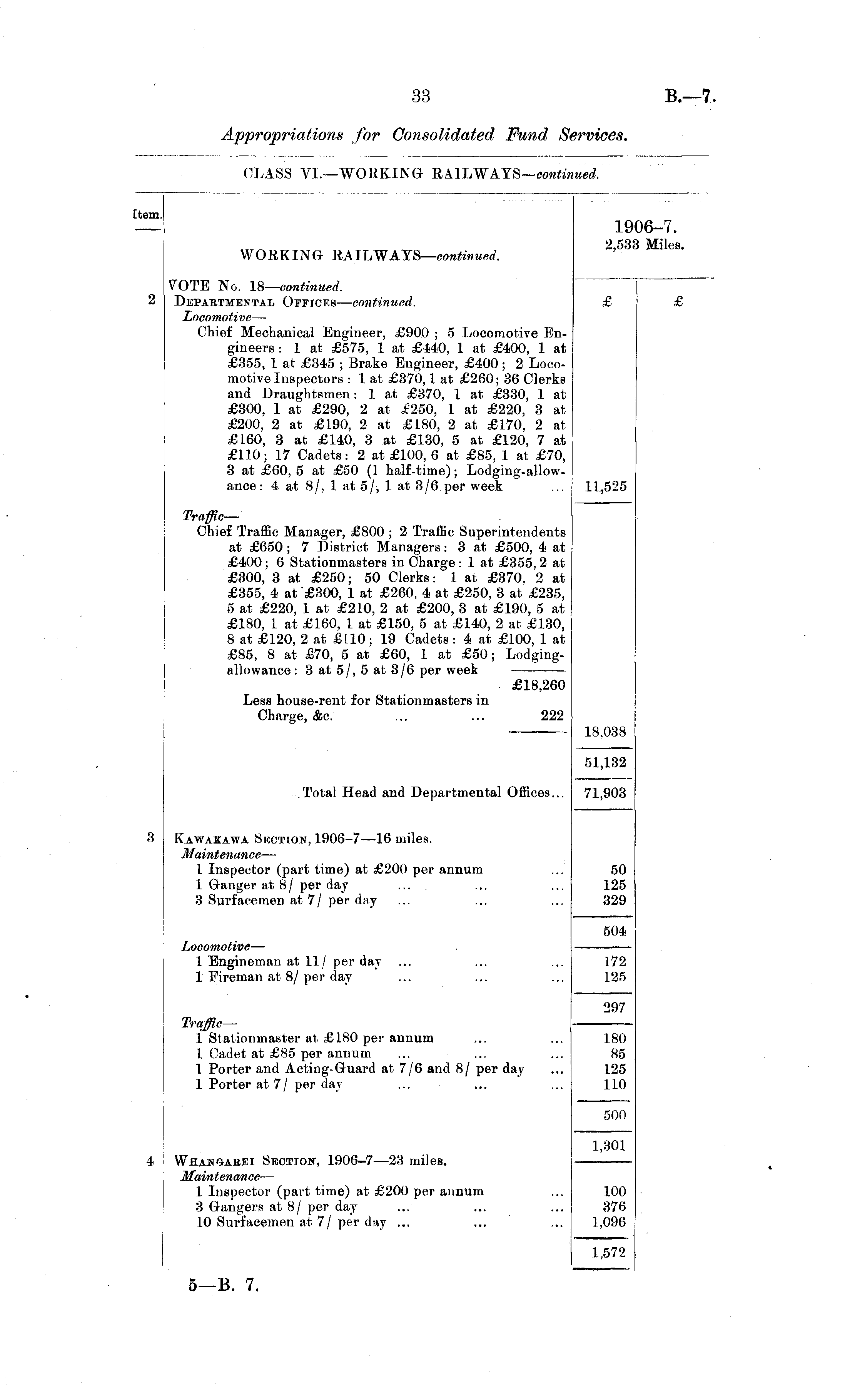 Item.! WORKING RAILWAYS—continued. 19 '6-7. Miles. 2,53; VOTE No. 18— continued. Departmental Offices— continued. Locomotive — Chief Mechanical Engineer, £900 ; 5 Locomotive Engineers : 1 at £575, 1 at £440, 1 at £400, 1 at £355, 1 at £345 ; Brake Engineer, £400; 2 Locomotive Inspectors : 1 at £370,1 at £260; 36 Clerks and Draughtsmen: 1 at £370, 1 at £330, 1 at £300, 1 at £290, 2 at £250, 1 at £220, 3 at £200, 2 at £190, 2 at £180, 2 at £170, 2 at £160, 3 at £140, 3 at £130, 5 at £120, 7 at £110; 17 Cadets: 2 at £100, 6 at £85, 1 at £70, 3 at £60,5 at £50 (1 half-time); Lodging-allow-ance: 4 at 8/, 1 at 5/, 1 at 3/6 per week 11,525 Traffic— Chief Traffic Manager, £800 ; 2 Traffic Superintendents at £650 ; 7 District Managers: 3 at £500, 4 at £400 ; 6 Stationmasters in Charge : 1 at £355, 2 at £300, 3 at £250; 50 Clerks: 1 at £370, 2 at £355, 4 at £300, 1 at £260, 4 at £250, 3 at £235, 5 at £220, 1 at £210, 2 at £200, 3 at £190, 5 at £180, 1 at £160, 1 at £150, 5 at £140, 2 at £130, 8 at £120, 2 at £110 ; 19 Cadets : 4 at £100, 1 at £85, 8 at £70, 5 at £60, 1 at £50; Lodgingallowance : 3 at 5/, 5 at 3/6 per week £18,260 Less house-rent for Stationmasters in Charge, &c. ... ... 222 18,038 Total Head and Departmental Offices... 51,132 71,903 3 Kawakawa Section, 1906-7—16 miles. Maintenan ce — I Inspector (part time) at £200 per annum 1 Ganger at 8/ per day 3 Surfacemen at 7/ per day 50 125 329 Locomotive — 1 Engineman at 11/ per day 1 Fireman at 8/per day 504 172 125 Traffic— 1 Stationmaster at £180 per annum 1 Cadet at £85 per annum 1 Porter and Acting-Guard at 7/6 and 8/ per day 1 Porter at 7/ per day 297 180 85 125 110 500 Whangarei Section, 1906-7—23 miles. Maintenance — 1 Inspector (part time) at £200 per annum 3 Gangers at 8/ per day 10 Surfacemen at 7/ per day ... 1,301 100 376 1,096 1,572