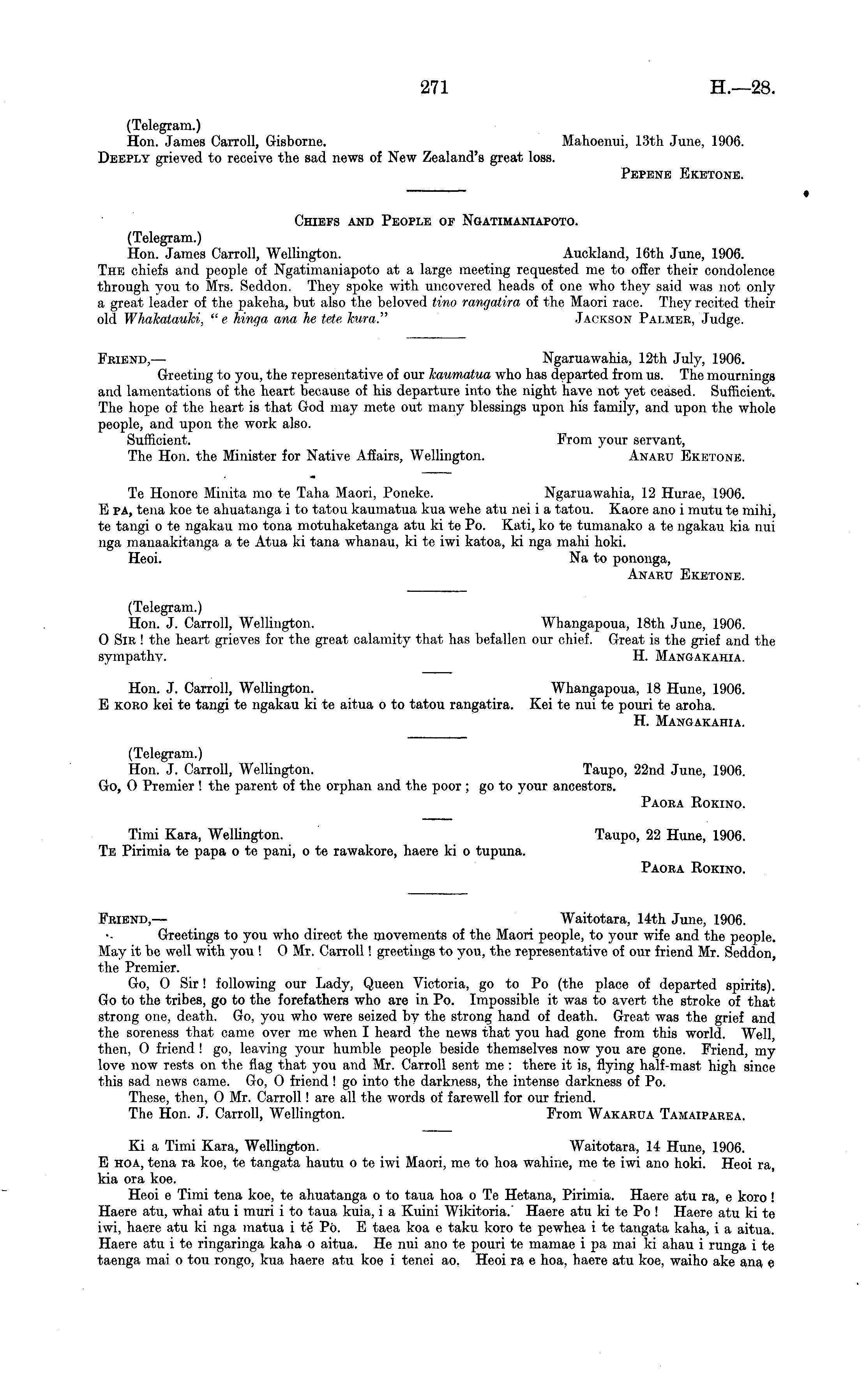 (Telegram.) Hon. James Carroll, Gisborne. Mahoenui, 13th June, 1906. Deeply grieved to receive the sad news of New Zealand's great loss. Pepene Eketone. Chiefs and People of Ngatimaniapoto. (Telegram.) Hon. James Carroll, Wellington. Auckland, 16th June, 1906. The chiefs and people of Ngatimaniapoto at a large meeting requested me to offer their condolence through you to Mrs. Seddon. They spoke with uncovered heads of one who they said was not only a great leader of the pakeha, but also the beloved tino rangatira of the Maori race. They recited their old Whakatauki, " c hinga ana he tete kura." Jackson Palmer, Judge. Friend, — Ngaruawahia, 12th July, 1906. Greeting to you, the representative of our kaumatua who has departed from us. The mournings and lamentations of the heart because of his departure into the night have not yet ceased. Sufficient. The hope of the heart is that God may mete out many blessings upon his family, and upon the whole people, and upon the work also. Sufficient. From your servant, The Hon. the Minister for Native Affairs, Wellington. Anaru Eketone. Te Honore Minita mo te Taha Maori, Poneke. Ngaruawahia, 12 Hurae, 1906. E pa, tena koe te ahuatanga ito tatou kaumatua kua wehe atu nei i a tatou. Kaore ano i mutu te mihi, te tangi ote ngakau mo tona motuhaketanga atu kite Po. Kati, ko te tumanako ate ngakau kia nui nga manaakitanga ate Atua ki tana whanau, kite iwi katoa, ki nga mahi hoki. Heoi. Na to pononga, Anaru Eketone. (Telegram.) Hon. J. Carroll, Wellington. Whangapoua, 18th June, 1906. O Sir ! the heart grieves for the great calamity that has befallen our chief. Great is the grief and the sympathy. H. Mangakahia. Hon. J. Carroll, Wellington. Whangapoua, 18 Hune, 1906. E koro kei te tangi te ngakau kite aitua oto tatou rangatira. Kei te nui te pouri te aroha. H. Mangakahia. (Telegram.) Hon. J. Carroll, Wellington. Taupo, 22nd June, 1906. Go, O Premier ! the parent of the orphan and the poor ; go to your ancestors. Paora Rokino. Timi Kara, Wellington. Taupo, 22 Hune, 1906. Te Pirimia te papa o te pani, o te rawakore, haere ki o tupuna. Paora Rokino. Friend, — Waitotara, 14th June, 1906. Greetings to you who direct the movements of the Maori people, to your wife and the people. May it be well with you ! O Mr. Carroll! greetings to you, the representative of our friend Mr. Seddon, the Premier. Go, O Sir! following our Lady, Queen Victoria, go to Po (the place of departed spirits). Go to the tribes, go to the forefathers who are in Po. Impossible it was to avert the stroke of that strong one, death. Go, you who were seized by the strong hand of death. Great was the grief and the soreness that came over me when I heard the news that you had gone from this world. Well, then, O friend ! go, leaving your humble people beside themselves now you are gone. Friend, my love now rests on the flag that you and Mr. Carroll sent me : there it is, flying half-mast high since this sad news came. Go, O friend! go into the darkness, the intense darkness of Po. These, then, O Mr. Carroll! are all the words of farewell for our friend. The Hon. J. Carroll, Wellington. From Wakarua Tamaiparea. Xi a Timi Kara, Wellington. Waitotara, 14 Hune, 1906. E hoa, tena ra koe, te tangata hautu ote iwi Maori, me to hoa wahine, me te iwi ano hoki. Heoi ra, kia ora koe. Heoi c Timi tena koe, te ahuatanga oto taua hoa oTe Hetana, Pirimia. Haere atu ra, c koro! Haere atu, whai atu i muri ito taua kuia, i a Kuini Wikitoria. Haere atu kite Po ! Haere atu kite iwi, haere atu ki nga matua ite Po. E taea koa c taku koro te pewhea ite tangata kaha, i a aitua. Haere atu ite ringaringa kaha o aitua. He nui ano te pouri te mamae ipa mai ki ahau i runga ite taenga mai o tou rongo, kua haere atu koe i tenei ao. Heoi ra c hoa, haere atu koe, waiho ake ana c