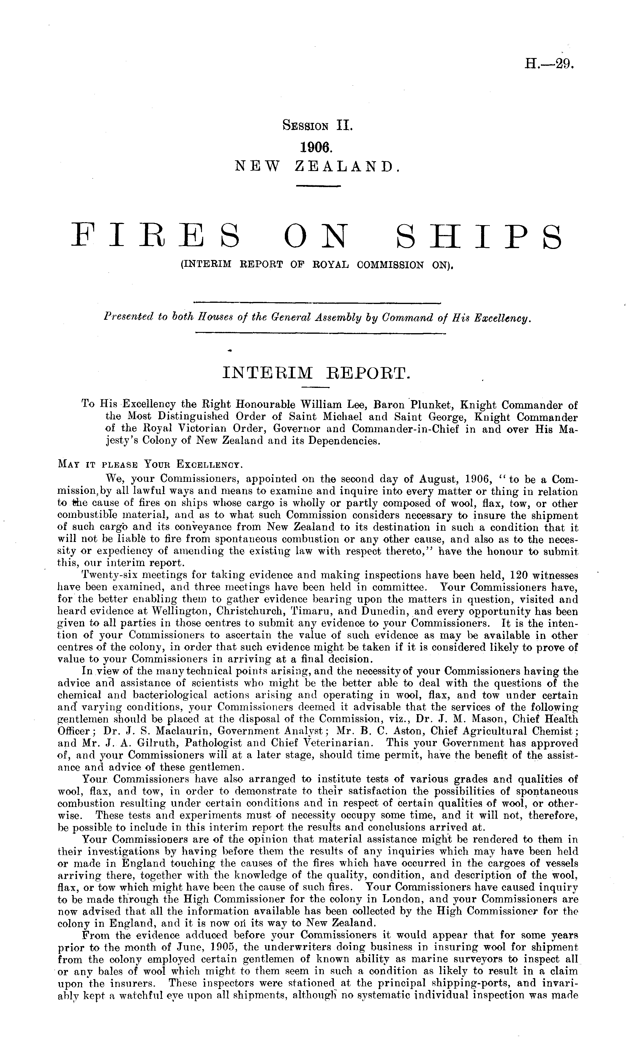 INTERIM EEPORT. To His Excellency the Right Honourable William Lee, Baron Plunket, Knight Commander of the Most Distinguished Order of Saint Michael and Saint George, Knight Commander of the Royal Victorian Order, Governor and Commander-in-Chief in and over His Majesty's Colony of New Zealand and its Dependencies. Mat it please Your Excellency. We, your Commissioners, appointed on the second day of August, 1906, "to be a Commissionby ( all lawful ways and means to examine and inquire into every matter or thing in relation to the cause of fires on ships whose cargo is wholly or partly composed of wool, flax, tow, or other combustible material, and as to what such Commission considers necessary to insure the shipment of such cargo and its conveyance from New Zealand to its destination in such a condition that it will not be liable to fire from spontaneous combustion or any other cause, and also as to the necessity or expediency of amending the existing law with respect thereto," have the honour to submit this, our interim report. Twenty-six meetings for taking evidence and making inspections have been held, 120 witnesses have been examined, and three meetings have been held in committee. Your Commissioners have, for the better enabling them to gather evidence bearing upon the matters in question, visited and heard evidence at Wellington, Christchurch, Timaru, and Dunedin, and every opportunity has been given to all parties in these centres to submit any evidence to your Commissioners. It is the intention of your Commissioners to ascertain the value of such evidence as may be available in other centres of the colony, in order that such evidence might be taken if it is considered likely to prove of value to your Commissioners in arriving at a final decision. In view of the many technical points arising, and the necessity of your Commissioners having the advice and assistance of scientists who might be the better able to deal with the questions of the chemical and bacteriological actions arising and operating in wool, flax, and tow under certain and* varying conditions, your Commissioners deemed it advisable that the services of the following gentlemen should be placed at the disposal of the Commission, viz., Dr. J. M. Mason, Chief Health Officer; Dr. J. S. Maclaurin, Government Analyst; Mr. B. C. Aston, Chief Agricultural Chemist; and Mr. J. A. Gilruth, Pathologist and Chief Veterinarian. This your Government has approved of, and your Commissioners will at a later stage, should time permit, have the benefit of the assistance and advice of these gentlemen. Your Commissioners have also arranged to institute tests of various grades and qualities of wool, flax, and tow, in order to demonstrate to their satisfaction the possibilities of spontaneous combustion resulting under certain conditions and in respect of certain qualities of wool, or otherwise. These tests and experiments must of necessity occupy some time, and it will not, therefore, be possible to include in this interim report the results and conclusions arrived at. Your Commissioners are of the opinion that material assistance might be rendered to them in their investigations by having before them the results of any inquiries which may have been held or made in England touching the causes of the fires which have occurred in the cargoes of vessels arriving there, together with the knowledge of the quality, condition, and description of the wool, flax, or tow which might have been the cause of such fires. Your Commissioners have caused inquiry to be made through the High Commissioner for the colony in London, and your Commissioners are now advised that all the information available has been collected by the High Commissioner for the colony in England, and it is now on its way to New Zealand. From the evidence adduced before your Commissioners it would appear that for some years prior to the month of June, 1905, the underwriters doing business in insuring wool for shipment from the colony employed certain gentlemen of known ability as marine surveyors to inspect all or any bales of wool which might to them seem in such a condition as likely to result in a claim upon the insurers. These inspectors were stationed at the principal shipping-ports, and invariably kept a watchful eye upon all shipments, although no systematic individual inspection was made