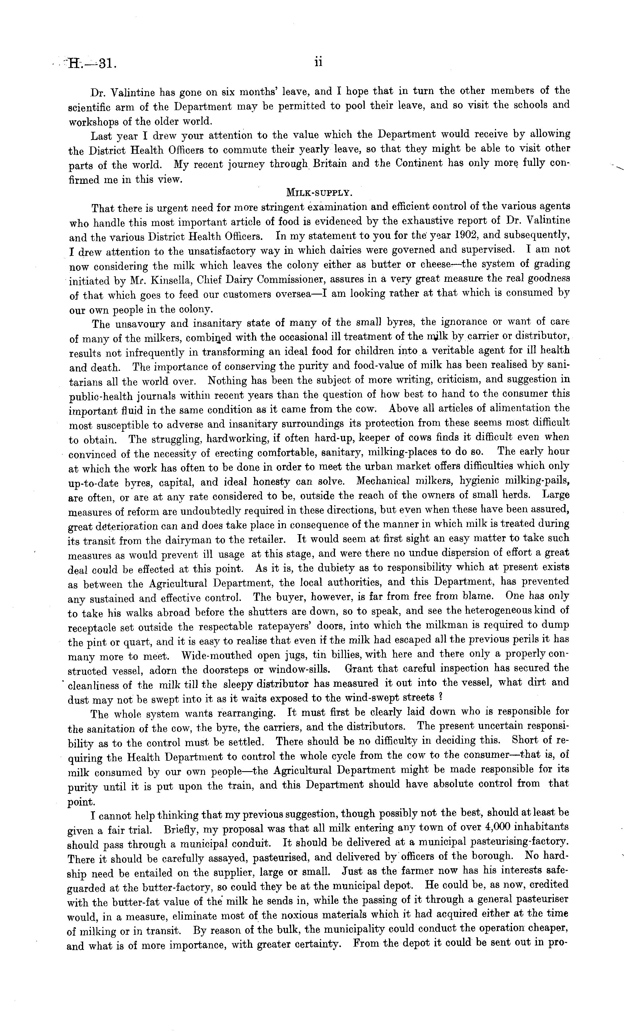 Dr. Valintine has gone on six months' leave, and I hope that in turn the other members of the scientific arm of the Department may be permitted to pool their leave, and so visit the schools and workshops of the older world. Last year I drew your attention to the value which the Department would receive by allowing the District Health Officers to commute their yearly leave, so that they might be able to visit other parts of the world. My recent journey through Britain and the Continent has only more fully confirmed me in this view. Milk-supply. That there is urgent need for more stringent examination and efficient control of the various agents who handle this most important article of food is evidenced by the exhaustive report of Dr. Valintine and the various District Health Officers. In my statement to you for the year 1902, and subsequently, I drew attention to the unsatisfactory way in which dairies were governed and supervised. lam not now considering the milk which leaves the colony either as butter or cheese —the system of grading initiated by Mr. Kinsella, Chief Dairy Commissioner, assures in a very great measure the real goodness of that which goes to feed our customers oversea —I am looking rather at that which is consumed by our own people in the colony. The unsavoury and insanitary state of many of the small byres, the ignorance or want of care of many of the milkers, combined with the occasional ill treatment of the mjlk by carrier or distributor, results not infrequently in transforming an ideal food for children into a veritable agent for ill health and death. The importance of conserving the purity and food-value of milk has been realised by sanitarians all the world over. Nothing has been the subject of more writing, criticism, and suggestion in public-health journals within recent years than the question of how best to hand to the consumer this important fluid in the same condition as it came from the cow. Above all articles of alimentation the most susceptible to adverse and insanitary surroundings its protection from these seems most difficult to obtain. The struggling, hardworking, if often hard-up, keeper of cows finds it difficult even when convinced of the necessity of erecting comfortable, sanitary, milking-places to do so. The early hour at which the work has often to be done in order to meet the urban market offers difficulties which only up-to-date byres, capital, and ideal honesty can solve. Mechanical milkers, hygienic milking-pails, are often, or are at any rate considered to be, outside the reach of the owners of small herds. Large measures of reform are undoubtedly required in these directions, but even when these have been assured, great deterioration can and does take place in consequence of the manner in which milk is treated during its transit from the dairyman to the retailer. It would seem at first sight an easy matter to take such measures as would prevent ill usage at this stage, and were there no undue dispersion of effort a great deal could be effected at this point. As it is, the dubiety as to responsibility which at present exists as between the Agricultural Department, the local authorities, and this Department, has prevented any sustained and effective control. The buyer, however, is far from free from blame. One has only to take his walks abroad before the shutters are down, so to speak, and see the heterogeneous kind of receptacle set outside the respectable ratepayers' doors, into which the milkman is required to dump the pint or quart, and it is easy to realise that even if the milk had escaped all the previous perils it has many more to meet. Wide-mouthed open jugs, tin billies, with here and there only a properly constructed vessel, adorn the doorsteps or window-sills. Grant that careful inspection has secured the cleanliness of the milk till the sleepy distributor has measured it out into the vessel, what dirt and dust may not be swept into it as it waits exposed to the wind-swept streets ? The whole system wants rearranging. It must first be clearly laid down who is responsible for the sanitation of the cow, the byre, the carriers, and the distributors. The present uncertain responsibility as to the control must be settled. There should be no difficulty in deciding this. Short of requiring the Health Department to control the whole cycle from the cow to the consumer—that is, of milk consumed by our own people—the Agricultural Department might be made responsible for its purity until it is put upon the train, and this Department should have absolute control from that point. I cannot help thinking that my previous suggestion, though possibly not the best, should at least be given a fair trial. Briefly, my proposal was that all milk entering any town of over 4,000 inhabitants should pass through a municipal conduit. It should be delivered at a municipal pasteurising-factory. There it should be carefully assayed, pasteurised, and delivered by officers of the borough. No hardship need be entailed on the supplier, large or small. Just as the farmer now has his interests safeguarded at the butter-factory, so could they be at the municipal depot. He could be, as now, credited with the butter-fat value of the milk he sends in, while the passing of it through a general pasteuriser would, in a measure, eliminate most of the noxious materials which it had acquired either at the time of milking or in transit. By reason of the bulk, the municipality could conduct the operation cheaper, and what is of more importance, with greater certainty. From the depot it could be sent out in pro-