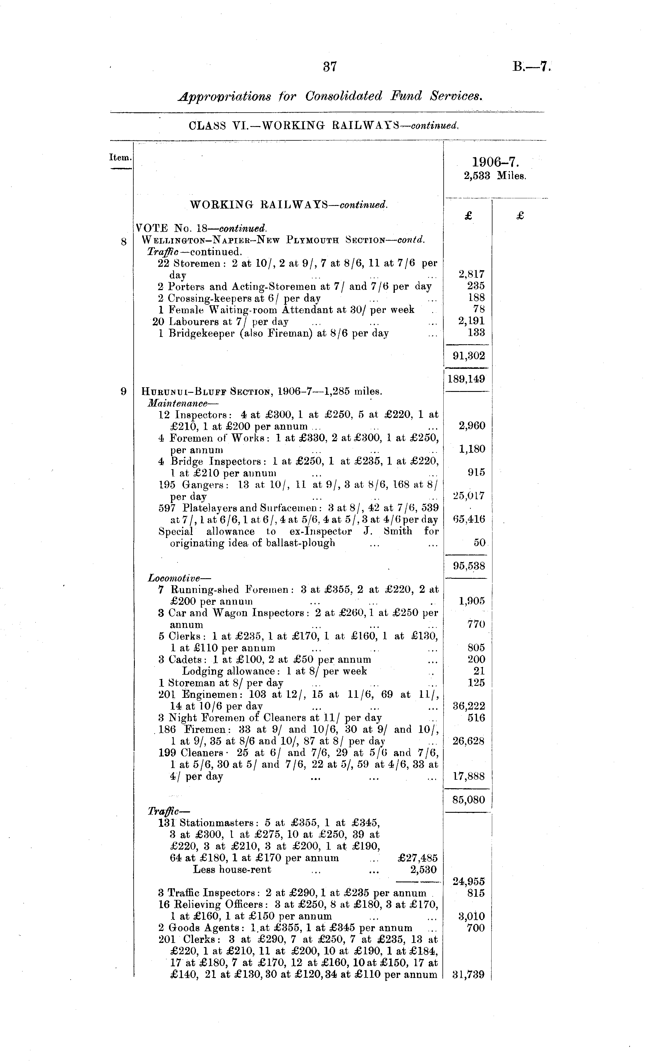 Item. 1906-7. 2,533 Miles. WORKING RAILWAYS— continued. £ £ 8 VOTE No. 18— continued. Wellington-Napier-New Plymouth Section— contd. Traffic— continued. 22 Storemen : 2 at 10/, 2 at 9/, 7 at 8/6, 11 at 7/6 per day 2 Porters and Acting-Storemen at 7/ and 7/6 per day 2 Crossing-keepers at 6/ per day 1 Female Waiting-room Attendant at 30/ per week 20 Labourers at 7/ per day 1 Bridgekeeper (also Fireman) at 8/6 per day 2,817 235 188 78 2,191 133 91,302 Hurunui-Bluff Section, 1906-7 —1,285 miles. Maintenance — 12 Inspectors: 4 at £300, 1 at £250, 5 at £220, 1 at £210, 1 at £200 per annum . 4 Foremen of Works : 1 at £330, 2 at £300, 1 at £250, 189,149 2,960 per annum 4 Bridge Inspectors: 1 at £250, 1 at £235, 1 at £220, 1 at £210 per annum 195 Gangers: 13 at 10/, 11 at 9/, 3 at 8/6, 168 at 8/ per day 597 Platelayers and Surfacemen: 3 at 8/, 42 at 7/6, 539 at 7/, I at 6/6,1 at 6/, 4 at 5/6, 4 at 5/, 3 at 4/6perday Special allowance to ex-Inspector J. Smith for originating idea of ballast-plough 1,180 915 25,017 65,416 50 95,538 Locomotive — 7 Running-shed Foremen : 3 at £355, 2 at £220, 2 at £200 per annum ... ... 3 Car and Wagon Inspectors: 2 at £260,1 at £250 per 1,905 annum 5 Clerks : 1 at £235, 1 at £170, 1 at £160, 1 at £130, 1 at £110 per annum 3 Cadets: 1 at £100, 2 at £50 per annum Lodging allowance: 1 at 8/ per week 1 Storeman at 8/ per day 201 Enginemen: 103 at 12/, 15 at 11/6, 69 at 11/, 14 at 10/6 per day 3 Night Foremen of Cleaners at 11/ per day . 186 Firemen: 33 at 9/ and 10/6, 30 at 9/ and 10/, 1 at 9/, 35 at 8/6 and 10/, 87 at 8/ per day 199 Cleaners- 25 at 6/ and 7/6, 29 at 5/6 and 7/6, 1 at 5/6, 30 at 5/ and 7/6, 22 at 5/, 59 at 4/6, 33 at 4/ per day 770 805 200 21 125 36,222 516 26,628 17,888 Traffic— 131 Stationmasters: 5 at £355, 1 at £345, 3 at £300, 1 at £275, 10 at £250, 39 at £220, 3 at £210, 3 at £200, 1 at £190, 64 at £180, 1 at £170 per annum ... £27,485 Less house-rent ... ... 2,530 85,080 3 Traffic Inspectors: 2 at £290,1 at £235 per annum 16 Relieving Officers: 3 at £250, 8 at £180, 3 at £170, 1 at £160, 1 at £150 per annum 2 Goods Agents: l.at £355, 1 at £345 per annum 201 Clerks: 3 at £290, 7 at £250, 7 at £235, 13 at £220, 1 at £210, 11 at £200, 10 at £190, 1 at £184, 17 at £180, 7 at £170, 12 at £160,10 at £150, 17 at £140, 21 at £130, 30 at £120,34 at £110 per annum 24,955 815 3,0i0 700 31,739