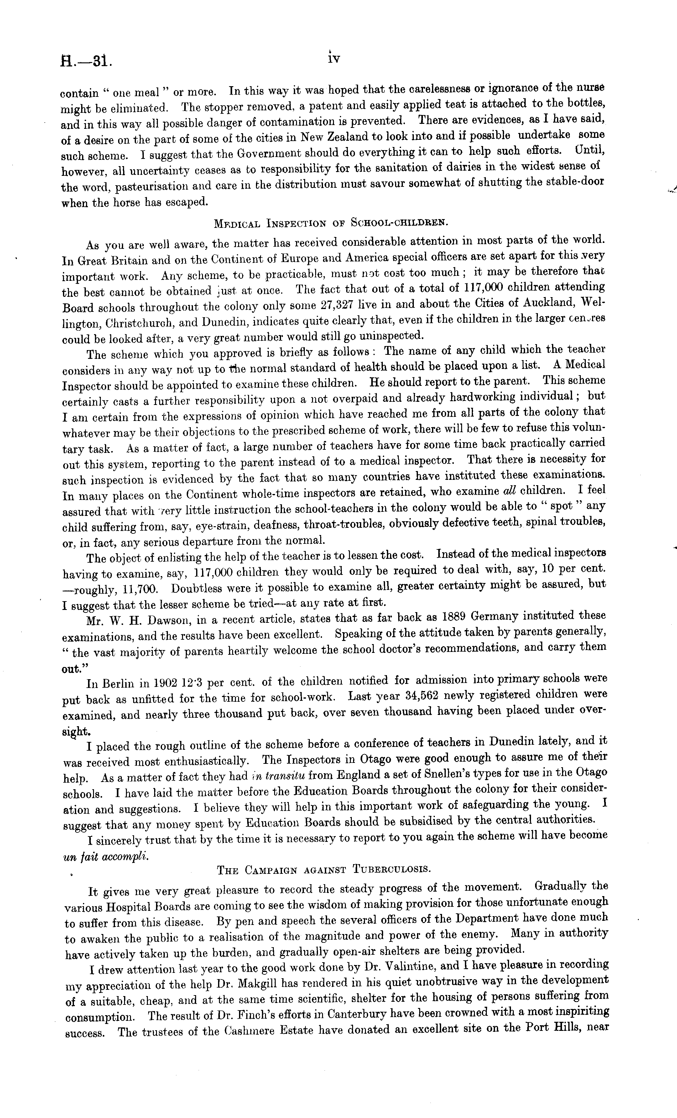 contain " one meal "or more. In this way it was hoped that the carelessness or ignorance of the nurse might be eliminated. The stopper removed, a patent and easily applied teat is attached to the bottles, and in this way all possible danger of contamination is prevented. There are evidences, as I have said, of a desire on the part of some of the cities in New Zealand to look into and if possible undertake some such scheme. I suggest that the Government should do everything it can to help such efforts. Until, however, all uncertainty ceases as to responsibility for the sanitation of dairies in the widest sense of the word, pasteurisation and care in the distribution must savour somewhat of shutting the stable-door when the horse has escaped. Mf.dical Inspection of School-children. As you are well aware, the matter has received considerable attention in most parts of the world. In Great Britain and on the Continent of Europe and America special officers are set apart for this .very important work. Any scheme, to be practicable, must not cost too much ; it may be therefore that the best cannot be obtained ,ust at once. The fact that out of a total of 117,000 children attending Board schools throughout the colony only some 27,327 live in and about the Cities of Auckland, Wellington, Christchurch, and Dunedin, indicates quite clearly that, even if the children in the larger centres could be looked after, a very great number would still go uninspected. The scheme which you approved is briefly as follows : The name of any child which the teacher considers in any way not up to the normal standard of health should be placed upon a list. A Medical Inspector should be appointed to examine these children. He should report to the parent. This scheme certainly casts a further responsibility upon a not overpaid and already hardworking individual; but I am certain from the expressions of opinion which have reached me from all parts of the colony that whatever may be their objections to the prescribed scheme of work, there will be few to refuse this voluntary task. As a matter of fact, a large number of teachers have for some time back practically carried out this system, reporting to the parent instead of to a medical inspector. That there is necessity for such inspection is evidenced by the fact that so many countries have instituted these examinations. In many places on the Continent whole-time inspectors are retained, who examine all children. I feel assuredthat with very little instruction the school-teachers in the colony would be able to " spot " any child suffering from, say, eye-strain, deafness, throat-troubles, obviously defective teeth, spinal troubles, or, in fact, any serious departure from the normal. The object of enlisting the help of the teacher is to lessen the cost. Instead of the medical inspectors having to examine, say, 117,000 children they would only be required to deal with, say, 10 per cent, —roughly, 11,700. Doubtless were it possible to examine all, greater certainty might be assured, but I suggest that the lesser scheme be tried—at any rate at first. Mr. W. H. Dawson, in a recent article, states that as far back as 1889 Germany instituted these examinations, and the results have been excellent. Speaking of the attitude taken by parents generally, " the vast majority of parents heartily welcome the school doctor's recommendations, and carry them out." . t In Berlin in 1902 123 per cent, of the children notified for admission into primary schools were put back as unfitted for the time for school-work. Last year 34,562 newly registered children were examined, and nearly three thousand put back, over seven thousand having been placed under oversight. I placed the rough outline of the scheme before a conference of teachers in Dunedin lately, and it was received most enthusiastically. The Inspectors in Otago were good enough to assure me of their help. As a matter of fact they had in transitu from England a set of Snellen's types for use in the Otago schools. I have laid the matter before the Education Boards throughout the colony for their consideration and suggestions. I believe they will help in this important work of safeguarding the young. I suggest that any money spent by Education Boards should be subsidised by the central authorities. I sincerely trust that by the time it is necessary to report to you again the scheme will have become un fait accompli. The Campaign against Tuberculosis. It gives me very great pleasure to record the steady progress of the movement. Gradually the various Hospital Boards are coming to see the wisdom of making provision for those unfortunate enough to suffer from this disease. By pen and speech the several officers of the Department have done much to awaken the public to a realisation of the magnitude and power of the enemy. Many in authority have actively taken up the burden, and gradually open-air shelters are being provided. I drew attention last year to the good work done by Dr. Valintine, and I have pleasure in recording my appreciation of the help Dr. Makgill has rendered in his quiet unobtrusive way in the development of a suitable, cheap, and at the same time scientific, shelter for the housing of persons suffering from consumption. The result of Dr. Finch's efforts in Canterbury have been crowned with a most inspiriting success. The trustees of the Cashmere Estate have donated an excellent site on the Port Hills, near