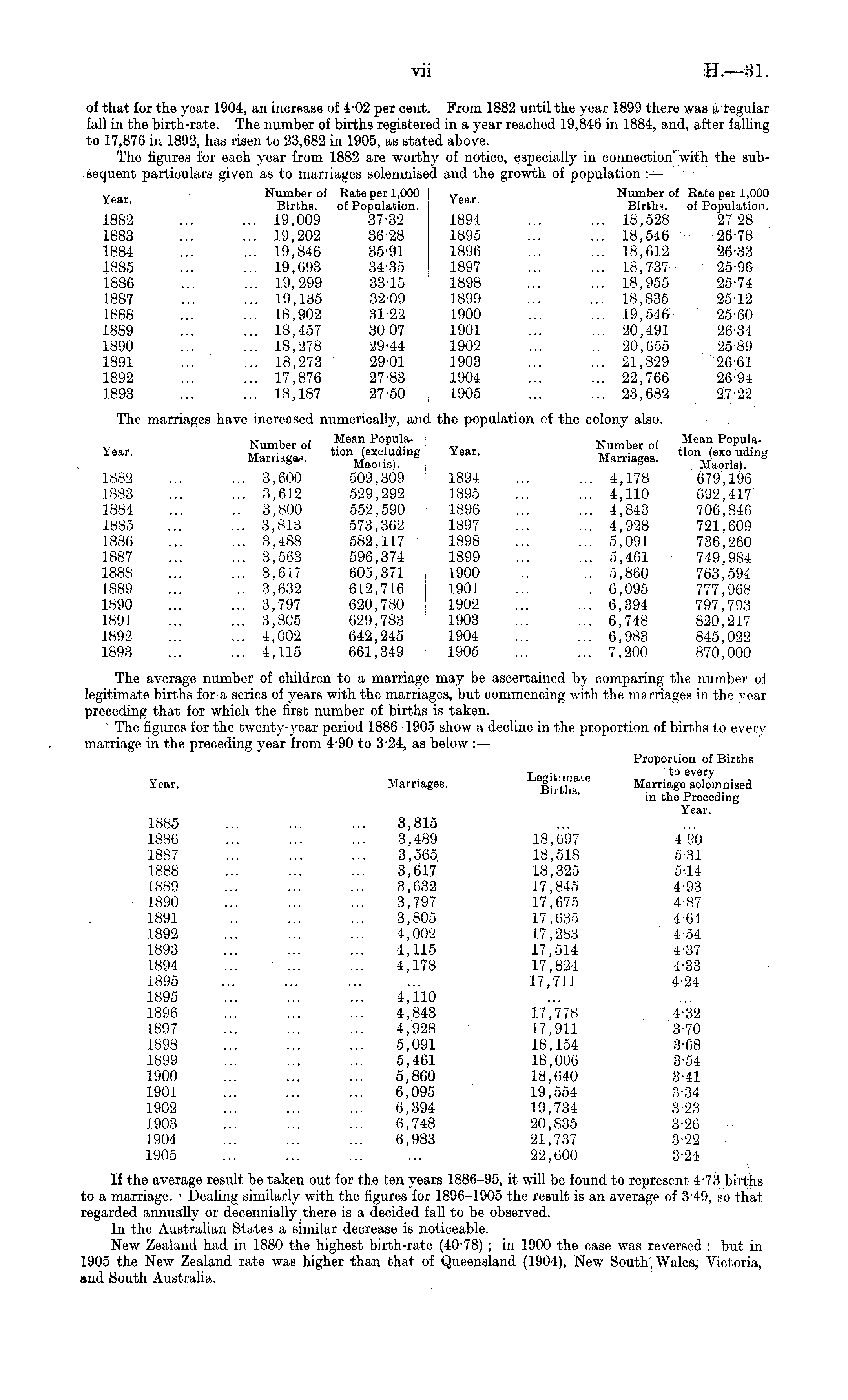 of that for the year 1904, an increase of 4-02 per cent. From 1882 until the year 1899 there was a regular fall in the birth-rate. The number of births registered in a year reached 19,846 in 1884, and, after falling to 17,876 in 1892, has risen to 23,682 in 1905, as stated above. The figures for each year from 1882 are worthy of notice, especially in connection' with the subsequent particulars given as to marriages solemnised and the growth of population : — V Number of Rate per 1,000 j v Number of Rate per 1,000 Births. of Population. r. Births. of Population. 1882 ... ... 19,009 37-32 1894 ... ... 18,528 2728 1883 ... ... 19,202 36-28 1895 ... ... 18,546 26-78 1884 ... ... 19,846 35-91 1896 ... ... 18,612 26-33 1885 ... ... 19,693 34-35 1897 ... ... 18,737 25-96 1886 ... ... 19,299 33-15 1898 ... ... 18,955 25-74 1887 ... ... 19,135 32-09 1899 ... ... 18,835 25-12 1888 ... ... 18,902 31-22 1900 ... ... 19,546 25-60 1889 ... ... 18,457 3007 1901 ... ... 20,491 26-34 1890 ... ... 18,278 29-44 1902 ... ... 20,655 25-89 1891 ... ... 18,273 ' 29-01 1903 ... ... 21,829 26-61 1892 ... ... 17,876 27-83 1904 ... ... 22,766 26-94 1893 ... ... 18,187 27-50 j 1905 ... ... 23,682 2722 The marriages have increased numerically, and the population of the colony also. ass? sgEfci *-• =r zjgfc. 1882 ... ... 3,600 509,309 1894 ... ... 4,178 679,196 1883 ... ... 3,612 529,292 1895 ... ... 4,110 692,417 1884 ... ... 3,800 552,590 1896 ... ... 4,843 706,846 1885 ... ... 3,813 573,362 1897 ... ... 4,928 721,609 1886 ... ... 3,488 582,117 1898 ... ... 5,091 736,260 1887 ... ... 3,563 596,374 1899 ... ... 5,461 749,984 1888 ... ... 3,617 605,371 1900 ... ... 5,860 763,594 1889 ... .. 3,632 612,716 1901 ... ... 6,095 777,968 1890 ... ... 3,797 620,780 1902 ... ... 6,394 797,793 1891 ... ... 3,805 629,783 1903 ... ... 6,748 820,217 1892 ... ... 4,002 642,245 1904 ... ... 6,983 845,022 1893 ... ... 4,115 661,349 j 1905 ... ... 7,200 870,000 The average number of children to a marriage may be ascertained by comparing the number of legitimate births for a series of years with the marriages, but commencing with the marriages in the year preceding that for which the firsb number of births is taken. " The figures for the twenty-year period 1886-1905 show a decline in the proportion of births to every marriage in the preceding year from 490 to 3 - 24, as below : — Proportion of Births Year. Marriages. Le ßirt,hT° Marriage solemnised in the Preceding Year. 1885 ... ... ... 3,815 1886 ... ... ... 3,489 18,697 4 90 1887 ... ... ... 3,565 18,518 5-31 1888 ... ... ... 3,617 18,325 5-14 1889 ... ... ... 3,632 17,845 4-93 1890 ... ... ... 3,797 17,675 487 1891 ... ... ... 3,805 17,635 464 1892 ... ... ... 4,002 17,283 4-54 1893 ... ... ... 4,115 17,514 437 1894 ... ... ... 4,178 17,824 4-33 1895 ... ... 17,711 4-24 1895 ... ... ... 4,110 1896 ... ... ... 4,843 17,778 4-32 1897 ... ... ... 4,928 17,911 370 1898 ... ... ... 5,091 18,154 3-68 1899 ... ... ... 5,461 18,006 3-54 1900 ... ... ... 5,860 18,640 3-41 1901 ... ... ... 6,095 19,554 334 1902 ... ... ... 6,394 19,734 3-23 1903 ... ... ... 6,748 20,835 3-26 1904 ... ... ... 6,983 21,737 3-22 1905 ... ... ... ... 22,600 3-24 If the average result be taken out for the ten years 1886-95, it will be found to represent 4-73 births to a marriage. ■ Dealing similarly with the figures for 1896-1905 the result is an average of 3-49, so that regarded annually or decennially there is a decided fall to be observed. In the Australian States a similar decrease is noticeable. New Zealand had in 1880 the highest birth-rate (40-78) ; in 1900 the case was reversed ; but in 1905 the New Zealand rate was higher than that of Queensland (1904), New South Wales, Victoria, and South Australia.