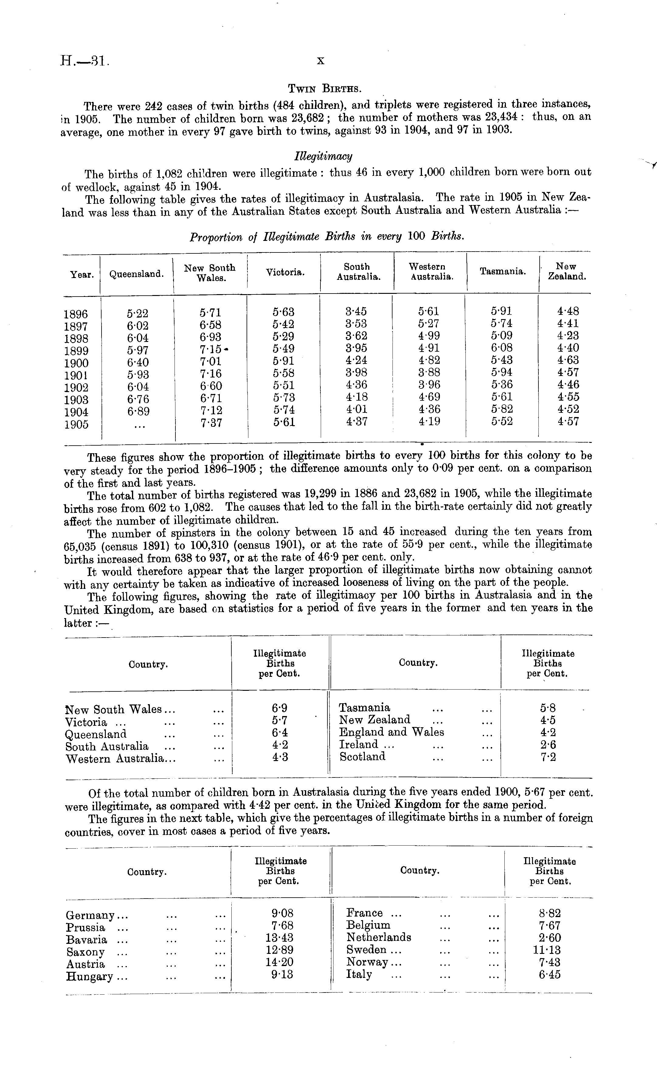 Twin Births. There were 242 cases of twin births (484 children), and triplets were registered in three instances, in 1905. The number of children born was 23,682 ; the number of mothers was 23,434 : thus, on an average, one mother in every 97 gave birth to twins, against 93 in 1904, and 97 in 1903. Illegitimacy The births of 1,082 chi'dren were illegitimate : thus 46 in every 1,000 children born were bom out of wedlock, against 45 in 1904. The following table gives the rates of illegitimacy in Australasia. The rate in 1905 in New Zealand was less than in any of the Australian States except South Australia and Western Australia :—