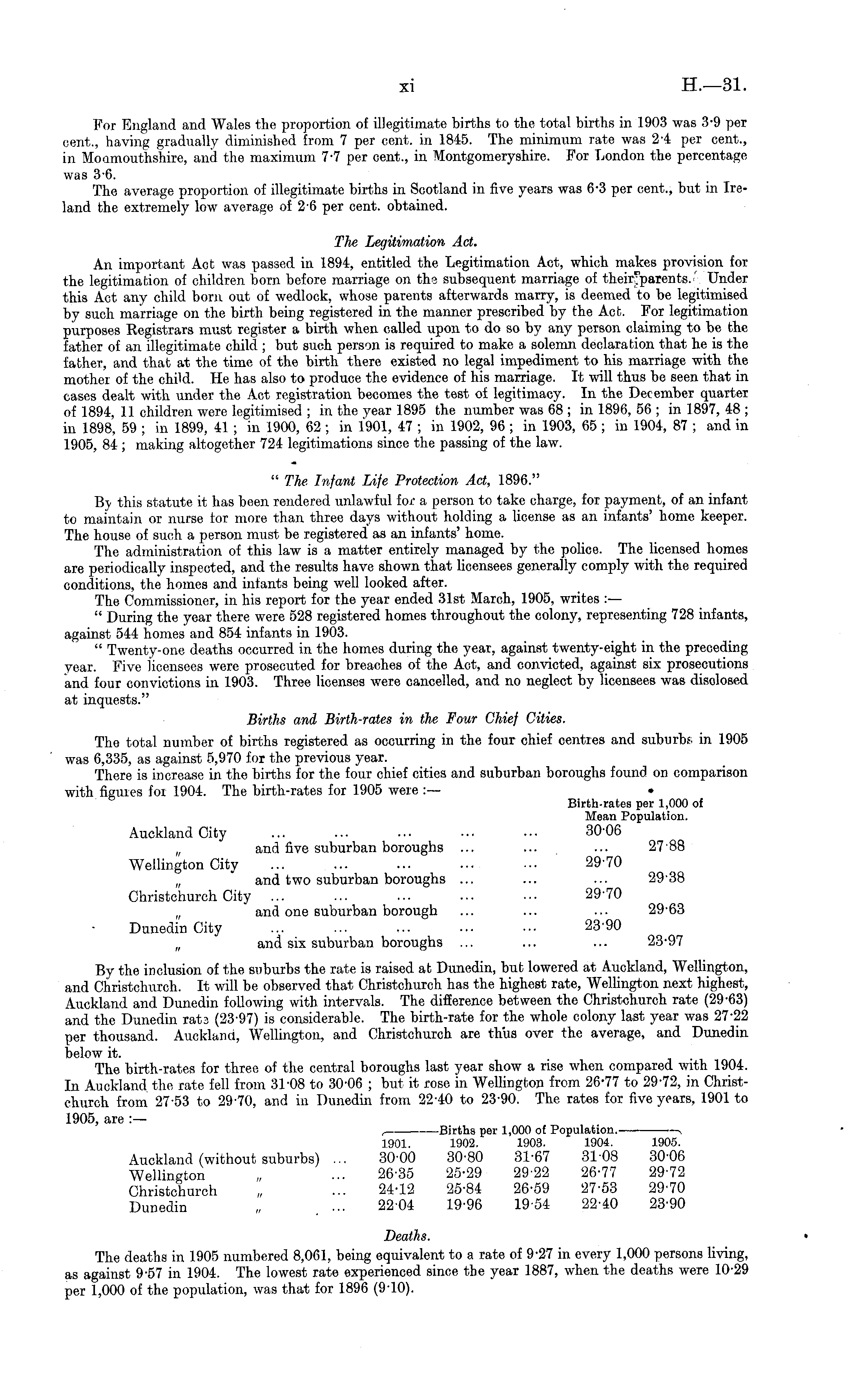 For England and Wales the proportion of illegitimate births to the total births in 1903 was 3-9 per cent., having gradually diminished from 7 per cent, in 1845. The minimum rate was 24 per cent., in Moamouthshire, and the maximum 7-7 per cent., in Montgomeryshire. For London the percentage was 36. The average proportion of illegitimate births in Scotland in five years was 6-3 per cent., but in Ireland the extremely low average of 2-6 per cent, obtained. The Legitimation Act. An important Act was passed in 1894, entitled the Legitimation Act, which makes provision for the legitimation of children born before marriage on the subsequent marriage of their;parents.'' Under this Act any child born out of wedlock, whose parents afterwards marry, is deemed to be legitimised by such marriage on the birth being registered in the manner prescribed by the Act. For legitimation purposes Registrars must register a birth when called upon to do so by any person claiming to be the father of an illegitimate child ; but such person is required to make a solemn declaration that he is the father, and that at the time of the birth there existed no legal impediment to his marriage with the mother of the child. He has also to produce the evidence of his marriage. It will thus be seen that in cases dealt with under the Act registration becomes the test of legitimacy. In the December quarter of 1894, 11 children were legitimised ; in the year 1895 the number was 68 ; in 1896, 56 ; in 1897, 48 ; in 1898, 59 ; in 1899, 41 ; in 1900, 62 ; in 1901, 47 ; in 1902, 96 ; in 1903, 65 ; in 1904, 87 ; and in 1905, 84 ; making altogether 724 legitimations since the passing of the law. " The Infant Life Protection Act, 1896." By this statute it has been rendered unlawful for a person to take charge, for payment, of an infant to maintain or nurse lor more than three days without holding a license as an infants' home keeper. The house of such a person must be registered as an infants' home. The administration of this law is a matter entirely managed by the police. The licensed homes are periodically inspected, and the results have shown that licensees generally comply with the required conditions, the homes and infants being well looked after. The Commissioner, in his report for the year ended 31st March, 1905, writes :— " During the year there were 528 registered homes throughout the colony, representing 728 infants, against 544 homes and 854 infants in 1903. " Twenty-one deaths occurred in the homes during the year, against twenty-eight in the preceding year. Five licensees were prosecuted for breaches of the Act, and convicted, against six prosecutions and four convictions in 1903. Three licenses were cancelled, and no neglect by licensees was disolosed at inquests." Births and Birth-rates in the Four Chief Cities. The total number of births registered as occurring in the four chief centres and suburbs; in 1905 was 6,335, as against 5,970 for the previous year. There is increase in the births for the four chief cities and suburban boroughs found on comparison with figures foi 1904. The birth-rates for 1905 were :— • Birth-rates per 1,000 of Mean Population. Auckland City 30-06 „ and five suburban boroughs ... ... ... 27 88 Wellington City ... ■•• ••• ■•• ••• 29-70 „ and two suburban boroughs ... ... ... 2938 Christchurch City ... ... ... ... ••• 29-70 „ and one suburban borough ... ... ... 29-63 Dunedin City ... ... ... ... ••• 23-90 „ and six suburban boroughs ... ... ... 23-97 By the inclusion of the suburbs the rate is raised at Dunedin, but lowered at Auckland, Wellington, and Christchurch. It will be observed that Christchurch has the highest rate, Wellington next highest, Auckland and Dunedin following with intervals. The difference between the Christchurch rate (29-63) and the Dunedin rats (23-97) is considerable. The birth-rate for the whole colony last year was 27-22 per thousand. Auckland, Wellington, and Christchurch are thus over the average, and Dunedin below it. The birth-rates for three of the central boroughs last year show a rise when compared with 1904. In Auckland the rate fell from 31-08 to 30-06 ; but it rose in Wellington from 26-77 to 29-72, in Christchurch from 27-53 to 2970, and in Dunedin from 22-40 to 23-90. The rates for five years, 1901 to 1905, are :— , Births per 1,000 of Population. , 1901. 1902. 1903. 1904. 1905. Auckland (without suburbs) ... 30-00 30-80 31-67 31-08 30-06 Wellington „ ... 26-35 25-29 29-22 26-77 29-72 Christchurch „ ... 24-12 25-84 26-59 27-53 29-70 Dunedin „ ... 2204 19-96 1954 22-40 23-90 Deaths. • The deaths in 1905 numbered 8,061, being equivalent to a rate of 9-27 in every 1,000 persons living, as against 9-57 in 1904. The lowest rate experienced since the year 1887, when the deaths were 10-29 per 1,000 of the population, was that for 1896 (9-10).