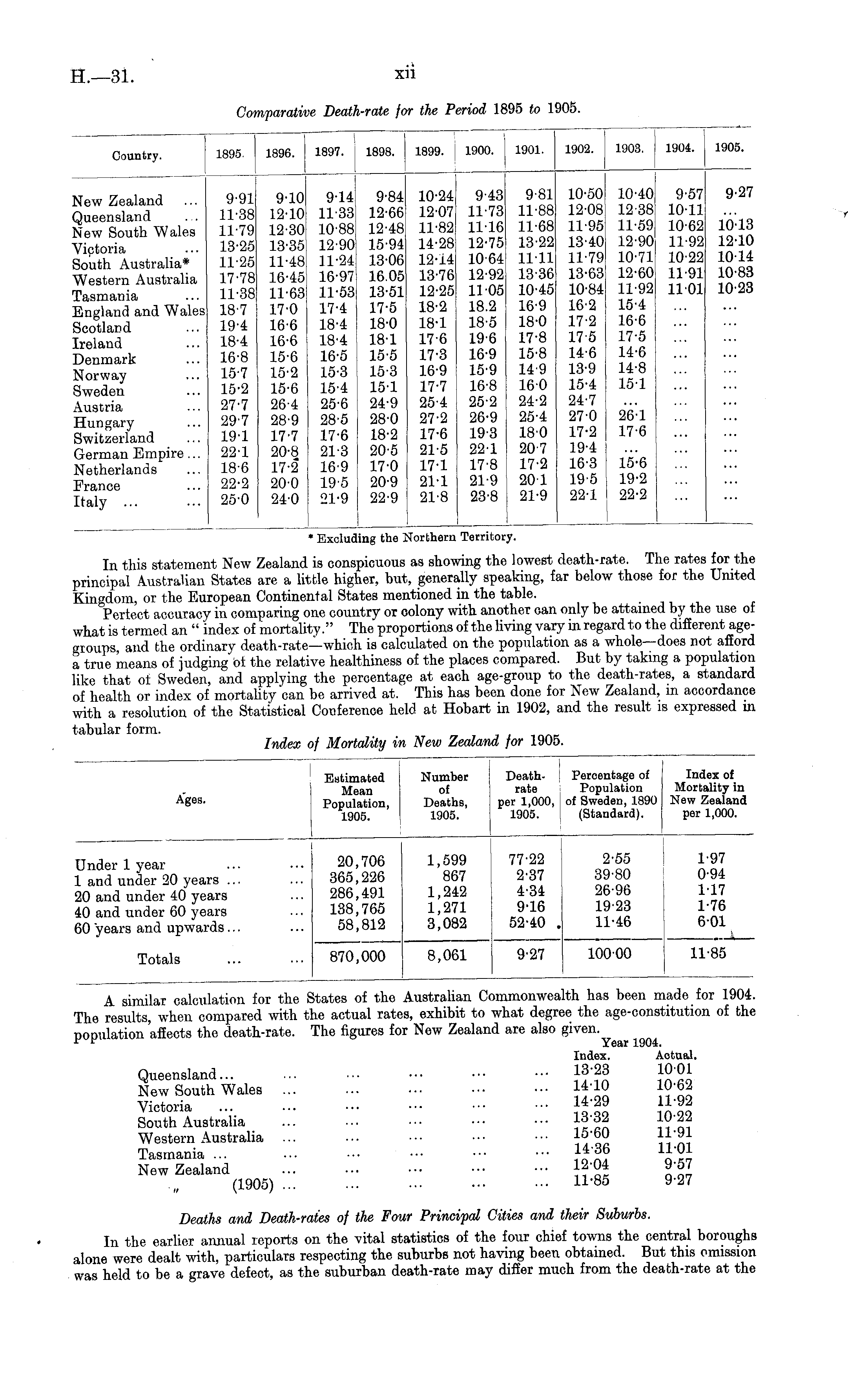 1896. 1897. 1898. 1899. 1900. 1901. 1902. 1903. 1904. 1905. Country. 1895. New Zealand Queensland . . New South Wales Victoria South Australia* Western Australia Tasmania England and Wales Scotland Ireland 991 11-38 11-79 13-25 11-25 17-78 11-38 18-7 19-4 18-4 16-8 15-7 15-2 27-7 29-7 19-1 22-1 18-6 22-2 25-0 9-10 12-10 12-30 13-35 11-48 16-45 11-63 170 16-6 16-6 15-6 15-2 15-6 26-4 28-9 17-7 20-8 17-2 20-0 24-0 914 11-33 10-88 12-90 11-24 16-97 11-53 17-4 18-4 18-4 16-5 15-3 15-4 25-6 28-5 17-6 21-3 16-9 19-5 21-9 9-84 12-66 12-48 15-94 1306 16.05 13-51 17-5 18-0 18-1 15-5 15-3 15-1 24-9 28-0 18-2 20-5 17-0 20-9 22-9 10-24 12-07 11-82 14-28 12-14 13-76 12-25 18-2 18-1 17-6 17-3 16-9 17-7 25-4 27-2 17-6 21-5 17-1 21-1 21-8 943 11-73 11-16 12-75 1064 12-92 11 05 18.2 18-5 19-6 16-9 15-9 16-8 25-2 26-9 19-3 22-1 17-8 21-9 23-8 9-81 11-88 11-68 13-22 1111 1336 10-45 16-9 18-0 17-8 15-8 14-9 160 24-2 25-4 180 207 17-2 201 21-9 10-50; 12-08 11-95 13-40 11-79 13-63 10-84 16-2 17-2 175 14-6 13-9 15-4 24-7 27-0 17-2 19-4 16-3 19-5 22-1 10-40 12-38 11-59 12-90 10-71 12-60 11-92 15-4 16-6 17-5 14-6 14-8 151 9-57 1011 10-62 11-92 10-22 11-91 1101 9-27 10-13 12-10 1014 10-83 10-23 Denmark Norway Sweden Austria Hungary Switzerland German Empire ... Netherlands France Italy 26-1 17-6 15-6 19-2 22-2