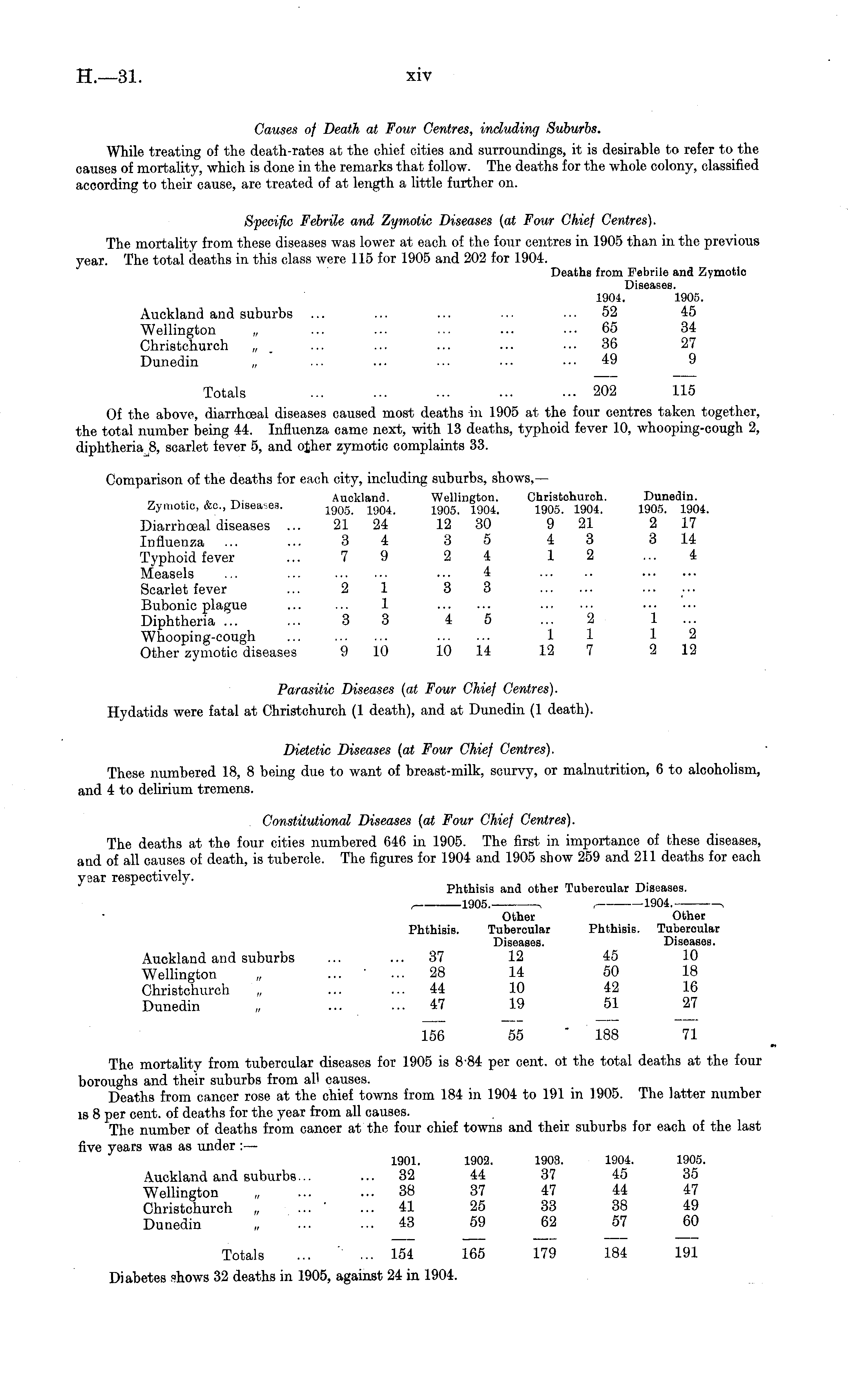 Causes of Death at Four Centres, including Suburbs. While, treating of the death-rates at the chief cities and surroundings, it is desirable to refer to the causes of mortality, which is done in the remarks that follow. The deaths for the whole colony, classified according to their cause, are treated of at length a little further on. Specific Febrile and Zymotic Diseases (at Four Chief Centres). The mortality from these diseases was lower at each of the four centres in 1905 than in the previous year. The total deaths in this class were 115 for 1905 and 202 for 1904. Deaths from Febrile and Zymotic Diseases. 1904. 1905. Auckland and suburbs ... ... ... ... ... 52 45 Wellington „ ... ... ... ... ••• 65 34 Christchurch „ ... ... ... ... ... 36 27 Dunedin „ ... ... ... ... ... 49 9 Totals 202 115 Of the above, diarrheal diseases caused most deaths in 1905 at the four centres taken together, the total number being 44. Influenza came next, with 13 deaths, typhoid fever 10, whooping-cough 2, diphtheria 8, scarlet fever 5, and o£her zymotic complaints 33. Comparison of the deaths for each city, including suburbs, shows, — Auckland. Wellington. Christehurch. Dunedin. Zymotic, &c, Diseases. lgo5 _ lgo4 _ lgo5 _ lgo4 _ lgosi lgo4 lgog lgo4 _ Diarrheal diseases ... 21 24 12 30 9 21 2 17 Influenza ... ... 3 4 3 5 4 3 3 14 Typhoid fever ... 79 24 12 ... 4 Measels ... ••• 4 Scarlet fever ... 2 1 3 3 Bubonic plague ... ... 1 Diphtheria ... ... 3 3 4 5 ... 2 1 Whooping-cough ... 1 1 1 2 Other zymotic diseases 9 10 10 14 12 7 2 12 Parasitic Diseases (at Four Chief Centres). Hydatids were fatal at Christchurch (1 death), and at Dunedin (1 death). Dietetic Diseases (at Four Chief Centres). These numbered 18, 8 being due to want of breast-milk, scurvy, or malnutrition, 6 to alcoholism, and 4 to delirium tremens. Constitutional Diseases (at Four Chief Centres). The deaths at the four cities numbered 646 in 1905. The first in importance of these diseases, and of all causes of death, is tubercle. The figures for 1904 and 1905 show 259 and 211 deaths for each year respectively. Phthisis and other Tubercular Diseases. , 1905. , , 1904. , Other Other Phthisis. Tubercular Phthisis. Tubercular Diseases. Diseases. Auckland and suburbs ... ... 37 12 45 10 Wellington „ ....... 28 14 50 18 Christchurch „ 44 10 42 16 Dunedin „ 47 19 51 27 156 55 188 71 The mortality from tubercular diseases for 1905 is 8-84 per cent, ot the total deaths at the four boroughs and their suburbs from all causes. Deaths from cancer rose at the chief towns from 184 in 1904 to 191 in 1905. The latter number is 8 per cent, of deaths for the year from all causes. The number of deaths from cancer at the four chief towns and their suburbs for each of the last five years was as under : — 1901. 1902. 1903. 1904. 1905. Auckland and suburbs... ... 32 44 37 45 35 Wellington „ 38 37 47 44 47 Christchurch „ ...'... 41 25 33 38 49 Dunedin 43 59 62 57 60 Totals 154 165 179 184 191 Diabetes shows 32 deaths in 1905, against 24 in 1904.
