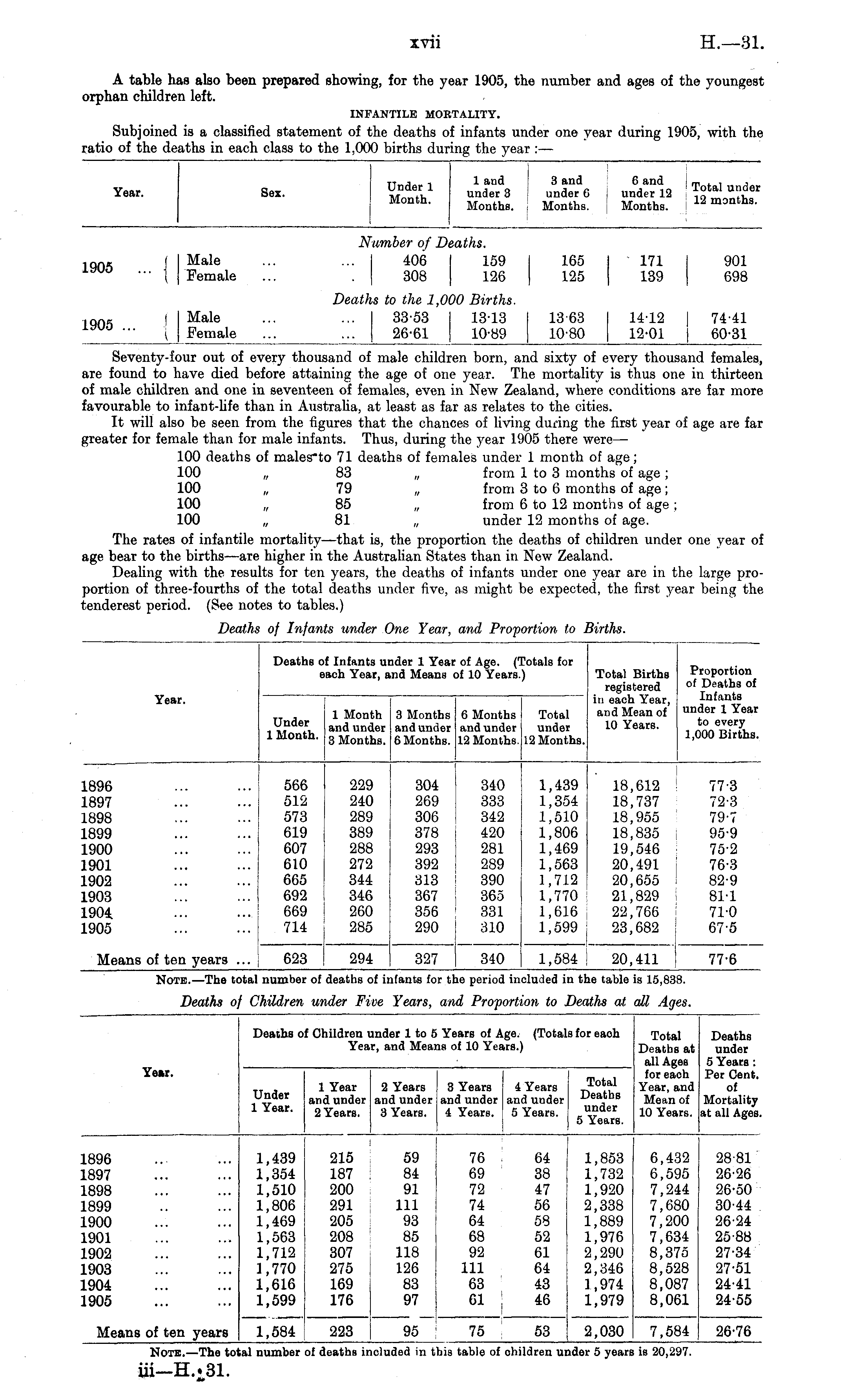 A table has also been prepared showing, for the year 1905, the number and ages of the youngest orphan children left. INFANTILE MORTALITY. Subjoined is a classified statement of the deaths of infants under one year during 1905, with the ratio of the deaths in each class to the 1.000 births during the year : —