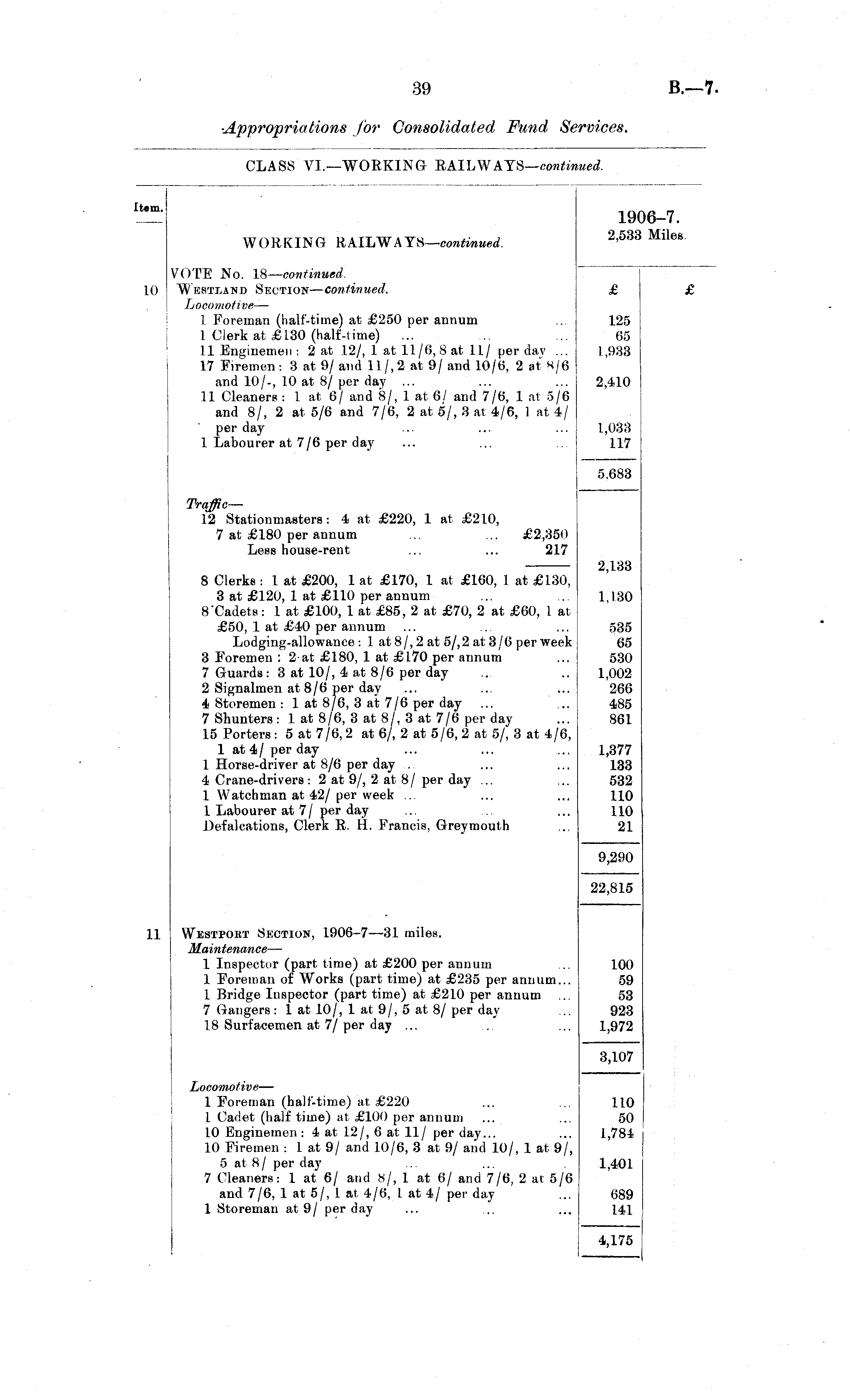 Item. WORKING RAILWAYS— continued. 19 6-7. Miles. 2,53J 10 VOTE No. 18— continued. Westland Section — continued. Locomotive— 1 Foreman (half-time) at £250 per annum I Clerk at £130 (half-time) ... II Enginemen: 2 at 12/, 1 at 11/6, Sat 11/ per dav ... 17 Firemen: 3 at 9/ and 11/, 2 at 9/ and 10/6, 2 at 8/6 and 10/-, 10 at 8/per day ... 11 Cleaners : 1 at 6/ and 8/, 1 at 6/ and 7/6, 1 at 5/6 and 8/, 2 at 5/6 and 7/6, 2 at 5/, 3 at 4/6, 1 at 4/ per day 1 Labourer at 7/6 per day £ 125 65 1,933 2,410 1,033 117 5.683 Traffic— 12 Stationmasters: 4 at £220, 1 at £210, 7 at £180 per annum ... ... £2,350 Less house-rent ... ... 217 8 Clerks : 1 at £200, 1 at £170, 1 at £160, 1 at £130, 3 at £120, 1 at £110 per annum 8 Cadets: 1 at £100, 1 at £85, 2 at £70, 2 at £60, 1 at £50, 1 at £40 per annum Lodging-allowance : 1 at 8/, 2 at 5/,2 at 3/6 per week 3 Foremen : 2-at £180, 1 at £170 per annum 7 Guards: 3 at 10/, 4 at 8/6 per day 2 Signalmen at 8/6 per day 4 Storemen : 1 at 8/6, 3 at 7/6 per day 7 Shunters: 1 at 8/6, 3 at 8/, 3 at 7/6 per day 15 Porters: 5 at 7/6, 2 at 6/, 2 at 5/6, 2 at 5/, 3 at 4/6, 1 at 4/ per day 1 Horse-driver at 8/6 per day 4 Crane-drivers: 2 at 9/, 2 at 8/ per day ... 1 Watchman at 42/per week ... 1 Labourer at 7/ per day Defalcations, Clerk R. H. Francis, Greymouth 2,133 1,130 535 65 530 1,002 266 485 861 1,377 133 532 110 110 21 9,290 22,815 11 Westport Section, 1906-7 —31 miles. Maintenance — 1 Inspector (part time) at £200 per annum 1 Foreman of Works (part time) at £235 per annum... 1 Bridge Inspector (part time) at £210 per annum 7 Gangers: 1 at 10/, 1 at 9/, 5 at 8/ per day 18 Surfacemen at 7/per day ... 100 59 53 923 1,972 Locomotive — 1 Foreman (half-time) at £220 1 Cadet (half time) at £100 per annum 10 Enginemen : 4 at 12/, 6 at 11/ per day... 10 Firemen : 1 at 9/ and 10/6, 3 at 9/ and 10/, 1 at 9/, 5 at 8/ per day 7 Cleaners: 1 at 6/ and 8/, 1 at 6/ and 7/6, 2 at 5/6 and 7/6, 1 at 5/, 1 at 4/6, 1 at 4/ per day 1 Storeman at 9/ per day 3,107 110 50 1,784 1,401 689 141 4,175