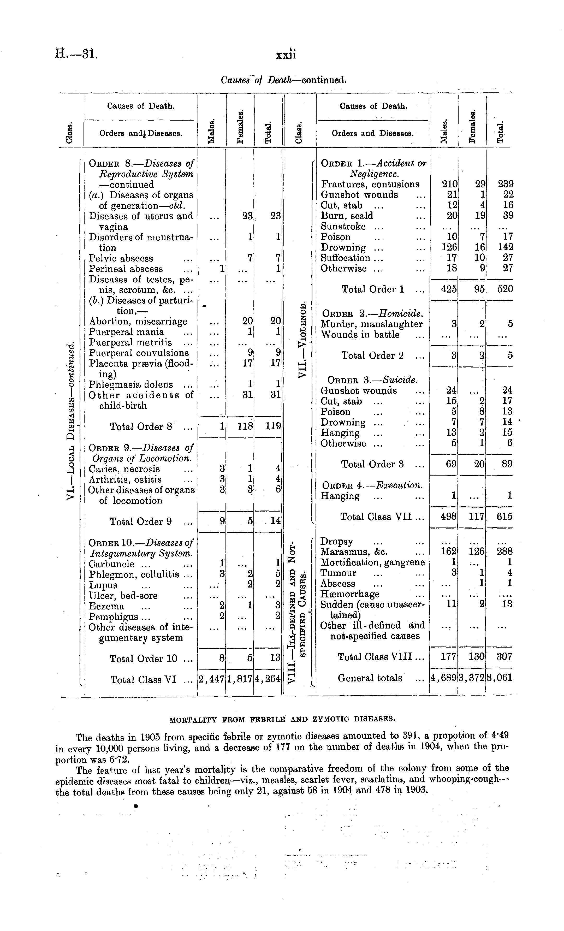 Causes of Death. m I 8 ft H Causes of Death. Orders and Diseases. B 1 00 a I -J, Orders andf Diseases. 'A J O Oedee 8.— Diseases of Reproductive System —continued (a.) Diseases of organs of generation— ctd. Diseases of uterus and vagina Disorders of menstruation Pelvic abscess Perineal abscess Diseases of testes, penis, scrotum. &c. ... (b.) Diseases of parturition, — Abortion, miscarriage Puerperal mania Puerperal metritis Puerperal convulsions Placenta praevia (flooding) Phlegmasia dolens ... Other accidents of child-birth 1 7 23 1 7 1 23 1 Oedee 1.— Accident or Negligence. Fractures, contusions Gunshot wounds Cut, stab ... Burn, scald Sunstroke ... Poison Drowning ... Suffocation ... Otherwise ... Total Order 1 ... 210 21 12 20 10 126 17 18 ! 425 29 1 4 19 7 16 10 9 95 239 22 16 39 17 142 27 27 520 20 1 20 1 M 5 SB H I > 1—1 1—I > Oedee 2.— Homicide. Murder, manslaughter Wounds in battle 3 2 5 1 2 B o ■o K < H :r. t—i "9 17 - 9 17 Total Order 2 ... 3 2 5 1 31 1 31 Order 3. — Suicide. Gunshot wounds Cut, stab ... Poison Drowning ... Hanging ... Otherwise ... 24 15 5 7 13 5 2 8 7 2 1 24 17 13 14 15 6 Total Order 8 ... 1 118 119 < \ > Ordeb 9.— Diseases of Organs of Locomotion. Caries, necrosis Arthritis, ostitis Other diseases of organs of locomotion 3 3 3 1 1 3 4 4 6 Total Order 3 ... 69i 20 89 Order 4.— Execution. Hanging ... 1 1 ______ Total Order 9 ... 9 5 14 Total Class VII... 498 117 615 Order 10.— Diseases of Integumentary System. Carbuncle ... Phlegmon, cellulitis ... Lupus Ulcer, bed-sore Eczema Pemphigus ... Other diseases of integumentary system 1 3 ' 2 2 1 5 2 o 55 S U 5 H to S n sg J 3 ~ g I 00 I—I > Dropsy Marasmus, &c. Mortification, gangrene Tumour Abscess Haemorrhage Sudden (cause unascertained) Other ill - defined and not-specified causes 162 I 126 '"I 1 288 1 4 1 2 2 1 "3 2 11 2 13 i Total Order 10 ... 8 5 13 Total Class VIII... 177 130 307 Total Class VI ... 2,447 1,817 4,264 General totals 4,689 3,372 8,061