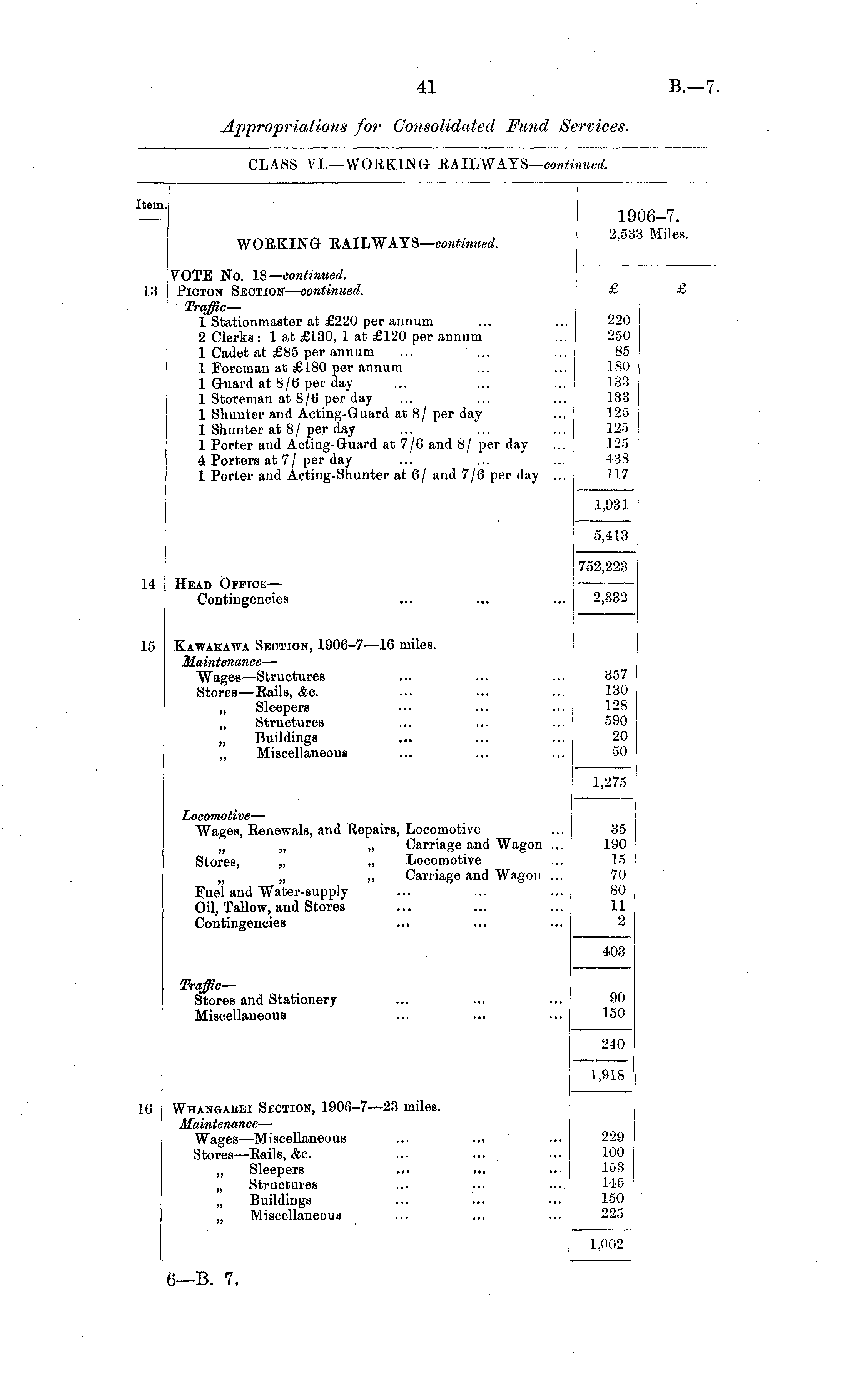 Item. WORKING RAILWAYS— continued. 1906-7. 2,533 Miles, 13 VOTE No. 18— continued. Picton Section — continued. Traffic— 1 Stationmaster at £220 per annum 2 Clerks: 1 at £130, 1 at £120 per annum 1 Cadet at £85 per annum 1 Foreman at £180 per annum 1 Guard at 8/6 per day 1 Storeman at 8/6 per day 1 Shunter and Acting-Guard at 8/ per day 1 Shunter at 8/ per day 1 Porter and Acting-Guard at 7/6 and 8/ per day 4 Porters at 7 / per day 1 Porter and Acting-Shunter at 6/ and 7/6 per day ... £ 220 250 85 180 133 133 125 125 125 438 117 1,931 5,413 14 Head Office — Contingencies 752,223 2,332 15 Kawakawa Section, 1906-7 —16 miles. Maintenance — Wages—Structures Stores —Rails, &c. „ Sleepers „ Structures „ Buildings ,, Miscellaneous 357 130 128 590 20 50 1,275 Locomotive — Wages, Renewals, and Repairs, Locomotive ,, „ Carriage and Wagon ... Stores, „ „ Locomotive „ ,, Carriage and Wagon ... Fuel and Water-supply Oil, Tallow, and Stores Contingencies 35 190 15 70 80 11 2 403 TrafficStores and Stationery Miscellaneous 90 150 240 16 Whangarei Section, 1906-7—23 miles. Maintenance — Wages —Miscellaneous Stores —Rails, &c. „ Sleepers „ Structures „ Buildings „ Miscellaneous 1,918 229 100 153 145 150 225 1,002