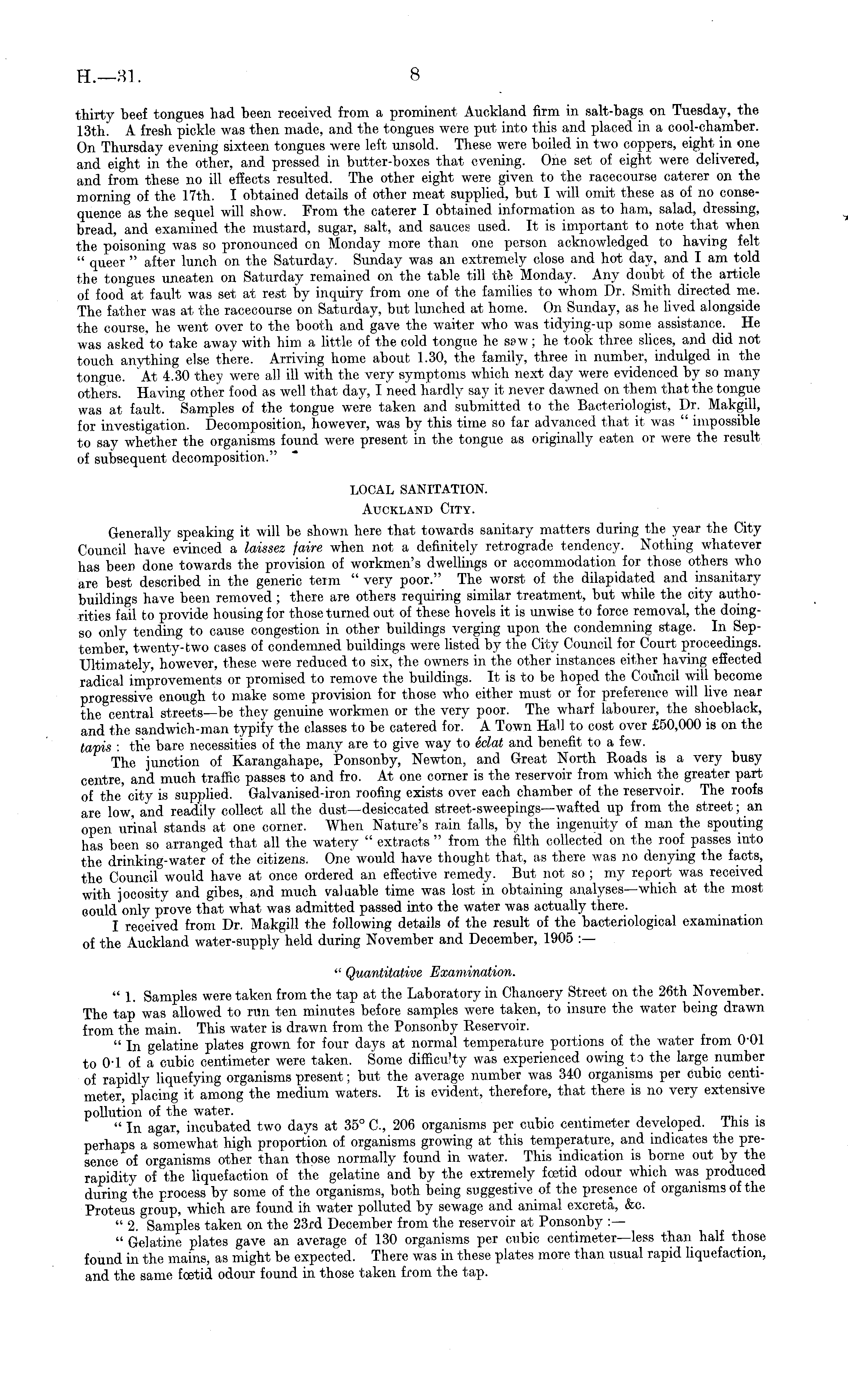 thirty beef tongues had been received from a prominent Auckland firm in salt-bags on Tuesday, the 13th. A fresh pickle was then made, and the tongues were put into this and placed in a cool-chamber. On Thursday evening sixteen tongues were left unsold. These were boiled in two coppers, eight in one and eight in the other, and pressed in butter-boxes that evening. One set of eight were delivered, and from these no ill effects resulted. The other eight were given to the racecourse caterer on the morning of the 17th. I obtained details of other meat supplied, but I will omit these as of no consequence as the sequel will show. From the caterer I obtained information as to ham, salad, dressing, bread, and examined the mustard, sugar, salt, and sauces used. It is important to note that when the poisoning was so pronounced on Monday more than one person acknowledged to having felt " queer " after lunch on the Saturday. Sunday was an extremely close and hot day, and lam told the tongues uneaten on Saturday remained on the table till the Monday. Any doubt of the article of food at fault was set at rest by inquiry from one of the families to whom Dr. Smith directed me. The father was at the racecourse on Saturday, but lunched at home. On Sunday, as he lived alongside the course, he went over to the booth and gave the waiter who was tidying-up some assistance. He was asked to take away with him a little of the cold tongue he sow; he took three slices, and did not touch anything else there. Arriving home about 1.30, the family, three in number, indulged in the tongue. At 4.30 they were all ill with the very symptoms which next day were evidenced by so many others. Having other food as well that day, I need hardly say it never dawned on them that the tongue was at fault. Samples of the tongue were taken and submitted to the Bacteriologist, Dr. Makgill, for investigation. Decomposition, however, was by this time so far advanced that it was " impossible to say whether the organisms found were present in the tongue as originally eaten or were the result of subsequent decomposition." LOCAL SANITATION. Auckland City. Generally speaking it will be shown here that towards sanitary matters during the year the City Council have evinced a laissez faire when not a definitely retrograde tendency. Nothing whatever has been done towards the provision of workmen's dwellings or accommodation for those others who are best described in the generic term " very poor." The worst of the dilapidated and insanitary buildings have been removed ; there are others requiring similar treatment, but while the city authorities fail to provide housing for those turned out of these hovels it is unwise to force removal, the doingso only tending to cause congestion in other buildings verging upon the condemning stage. In September, twenty-two cases of condemned buildings were listed by the City Council for Court proceedings. "Ultimately, however, these were reduced to six, the owners in the other instances either having effected radical improvements or promised to remove the buildings. It is to be hoped the Council will become progressive enough to make some provision for those who either must or for preference will live near the central streets—be they genuine workmen or the very poor. The wharf labourer, the shoeblack, and the sandwich-man typify the classes to be catered for. A Town Hall to cost over £50,000 is on the tavis : the bare necessities of the many are to give way to eclat and benefit to a few. The junction of Karangahape, Ponsonby, Newton, and Great North Roads is a very busy centre, and much traffic passes to and fro. At one corner is the reservoir from which the greater part of the' city is supplied. Galvanised-iron roofing exists over each chamber of the reservoir. The roofs are low, and readily collect all the dust—desiccated street-sweepings—wafted up from the street; an open urinal stands at one corner. When Nature's rain falls, by the ingenuity of man the spouting has been so arranged that all the watery " extracts " from the filth collected on the roof passes into the drinking-water of the citizens. One' would have thought that, as there was no denying the facts, the Council would have at once ordered an effective remedy. But not so ;my report was received with jocosity and gibes, and much valuable time was lost in obtaining analyses—which at the most could only prove that what was admitted passed into the water was actually there. I received from Dr. Makgill the following details of the result of the bacteriological examination of the Auckland water-supply held during November and December, 1905 :— " Quantitative Examination. " 1. Samples were taken from the tap at the Laboratory in Chancery Street on the 26th November. The tap was allowed to ran ten minutes before samples were taken, to insure the water being drawn from the main. This water is drawn from the Ponsonby Reservoir. " In gelatine plates grown for four days at normal temperature portions of the water from 0-01 to 0-1 of a cubic centimeter were taken. Some difficulty was experienced owing to the large number of rapidly liquefying organisms present; but the average number was 340 organisms per cubic centimeter, placing it among the medium waters. It is evident, therefore, that there is no very extensive pollution of the water. "In agar, incubated two days at 35° C, 206 organisms per cubic centimeter developed. Inis is perhaps a somewhat high proportion of organisms growing at this temperature, and indicates the presence of organisms other than those normally found in water. This indication is borne out by the rapidity of the liquefaction of the gelatine and by the extremely foetid odour which was produced during'the process by some of the organisms, both being suggestive of the presence of organisms of the Proteus group, which are found in water polluted by sewage and animal excreta, &c. " 2. Samples taken on the 23fd December from the rese