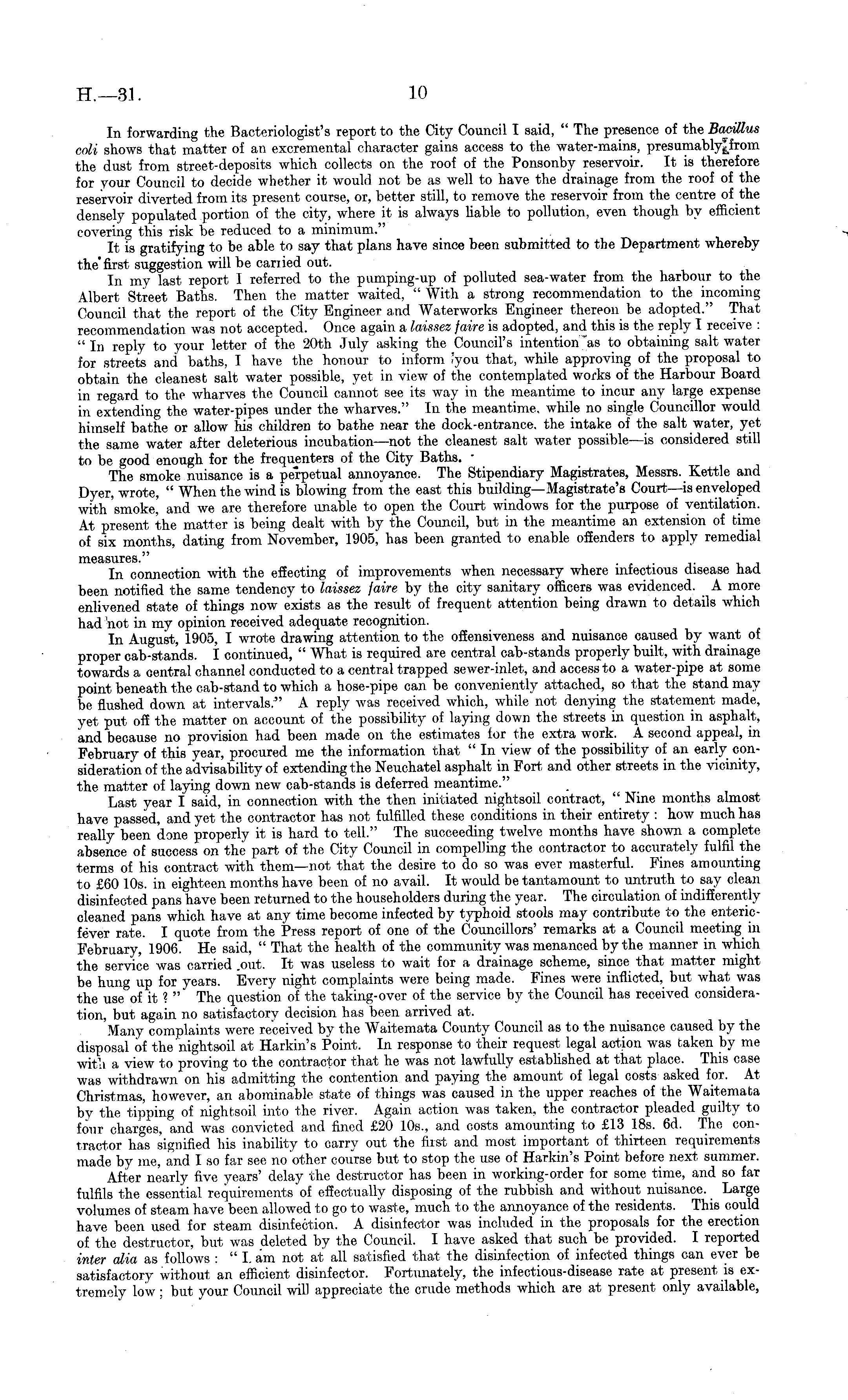 In forwarding the Bacteriologist's report to the City Council I said, " The presence of the Bacillus cnli shows that matter of an excremental character gains access to the water-mains, the dust from street-deposits which collects on the roof of the Ponsonby reservoir. It is therefore for your Council to decide whether it would not be as well to have the drainage from the roof of the reservoir diverted from its present course, or, better still, to remove the reservoir from the centre of the densely populated portion of the city, where it is always liable to pollution, even though by efficient covering this risk be reduced to a minimum." It is gratifying to be able to say that plans have since been submitted to the Department whereby the'first suggestion will be cariied out. In my last report I referred to the pumping-up of polluted sea-water from the harbour to the Albert Street Baths. Then the matter waited, " With a strong recommendation to the incoming Council that the report of the City Engineer and Waterworks Engineer thereon be adopted." That recommendation was not accepted. Once again a laissez faire is adopted, and this is the reply I receive : " In reply to your letter of the 20th July asking the Council's intention 'as to obtaining salt water for streets and baths, I have the honour to inform ?you that, while approving of the proposal to obtain the cleanest salt water possible, yet in view of the contemplated works of the Harbour Board in regard to the wharves the Council cannot see its way in the meantime to incur any large expense in extending the water-pipes under the wharves." In the meantime, while no single Councillor would himself bathe or allow his children to bathe near the dock-entrance, the intake of the salt water, yet the same water after deleterious incubation —not the cleanest salt water possible —is considered still to be good enough for the frequenters of the City Baths. " The smoke nuisance is a perpetual annoyance. The Stipendiary Magistrates, Messrs. Kettle and Dyer, wrote, " When the wind is blowing from the east this building—Magistrate's Court—is enveloped with smoke, and we are therefore unable to open the Court windows for the purpose of ventilation. At present the matter is being dealt with by the Council, but in the meantime an extension of time of six months, dating from November, 1905, has been granted to enable offenders to apply remedial measures." In connection with the effecting of improvements when necessary where infectious disease had been notified the same tendency to laissez faire by the city sanitary officers was evidenced. A more enlivened state of things now exists as the result of frequent attention being drawn to details which had not in my opinion received adequate recognition. In August, 1905, I wrote drawing attention to the offensiveness and nuisance caused by want of proper cab-stands. I continued, " What is required are central cab-stands properly built, with drainage towards a central channel conducted to a central trapped sewer-inlet, and access to a water-pipe at some point beneath the cab-stand to which a hose-pipe can be conveniently attached, so that the stand may be flushed down at intervals." A reply was received which, while not denying the statement made, yet put off the matter on account of the possibility of laying down the streets in question in asphalt, and because no provision had been made on the estimates for the extra work. A second appeal, in February of this year, procured me the information that " In view of the possibility of an early consideration of the advisability of extending the Neuchatel asphalt in Fort and other streets in the vicinity, the matter of laying down new cab-stands is deferred meantime." Last year I said, in connection with the then initiated nightsoil contract, " Nine months almost have passed, and yet the contractor has not fulfilled these conditions in their entirety : how much has really been done properly it is hard to tell." The succeeding twelve months have shown a complete absence of success on the part of the City Council in compelling the contractor to accurately fulfil the terms of his contract with them—not that the desire to do so was ever masterful. Fines amounting to £60 10s. in eighteen months have been of no avail. It would be tantamount to untruth to say clean disinfected pans have been returned to the householders during the year. The circulation of indifferently cleaned pans which have at any time become infected by typhoid stools may contribute to the entericfever rate. I quote from the Press report of one of the Councillors' remarks at a Council meeting in February, 1906. He said, " That the health of the community was menanced by the manner in which the service was carried .out. It was useless to wait for a drainage scheme, since that matter might be hung up for years. Every night complaints were being made. Fines were inflicted, but what was the use of it ? " The question of the taking-over of the service by the Council has received consideration, but again no satisfactory decision has been arrived at. Many complaints were received by the Waitemata County Council as to the nuisance caused by the disposal of the'nightsoil at Harkin's Point. In response to their request legal action was taken by me witli a view to proving to the contractor that he was not lawfully established at that place. This case was withdrawn on his admitting the contention and paying the amount of legal costs asked for. At Christmas, however, an abominable state of things was caused in the upper reaches of the Waitemata by the tipping of nightsoil into the river. Again action was taken, the contractor pleaded guilty to four charges, and was convicted arid fined £20 10s., and costs amounting to £13 18s. 6d. The contractor has signified his inability to carry out the first and most important of thirteen requirements made by me, and I so far see no other course but to stop the use of H
