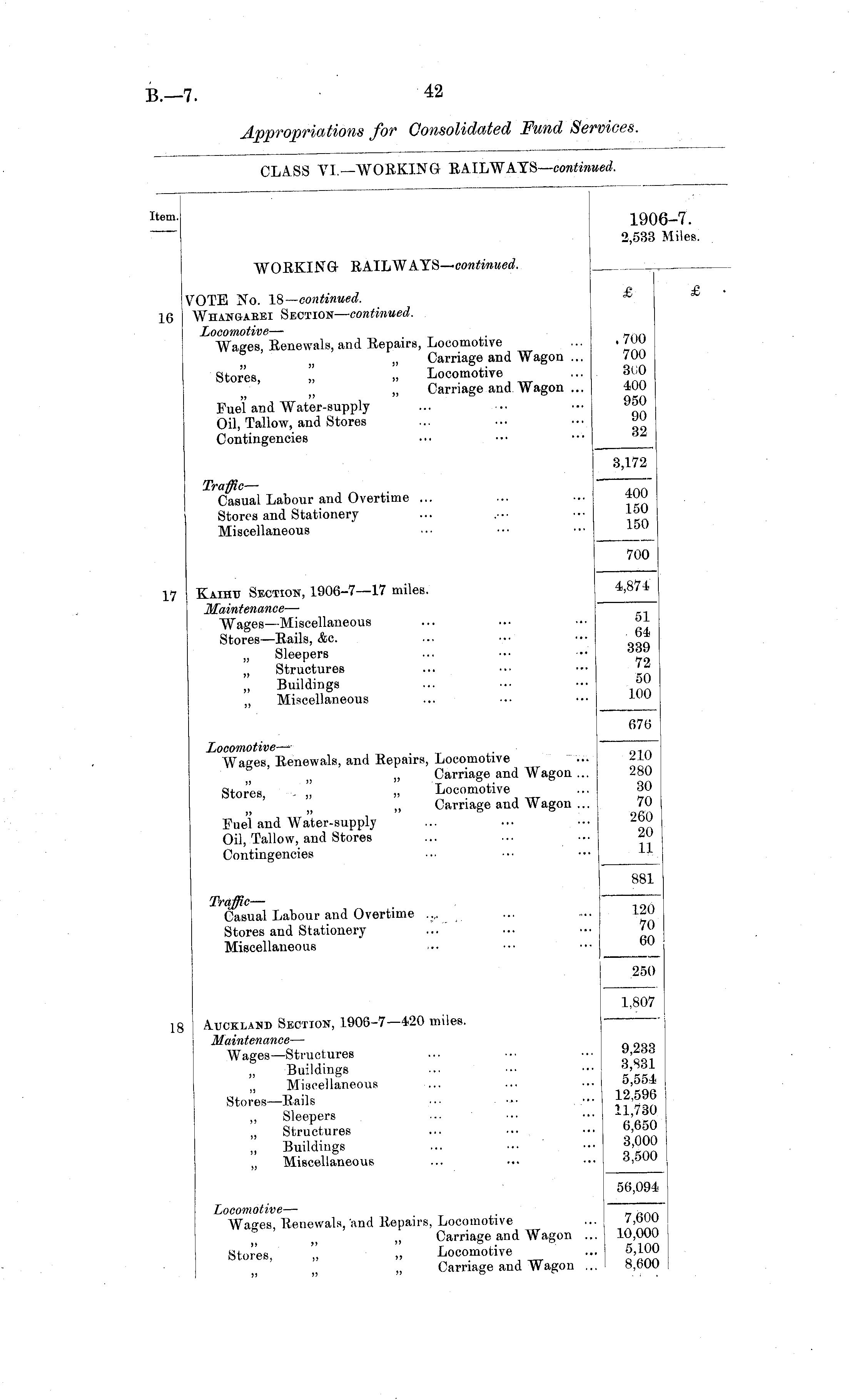 item. 19 '6-7. Miles. 2,53: WORKING RAILWAYS— continued. 10 VOTE No. 18— continued. Whangarei Section — continued. Locomotive — Wages, Renewals, and Repairs, Locomotive „ Carriage and Wagon ... Stores, " » Locomotive „ Carriage and Wagon ... Fuel and Water-supply Oil, Tallow, and Stores Contingencies £ .700 700 3C0 400 950 90 32 Traffic— Casual Labour and Overtime ... Stores and Stationery Miscellaneous 3,172 400 150 150 700 17 Kaihu Section, 1906-7—17 miles. Maintenance — Wages —Miscellaneous Stores —Rails, &c. „ Sleepers „ Structures „ Buildings „ Miscellaneous 4,874 51 . 64 339 72 50 100 676 Locomotive — Wages, Renewals, and Repairs, Locomotive „ Carriage and Wagon ... Stores, - ',', „ Locomotive ,, Carriage and Wagon ... Fuel and Water-supply Oil, Tallow, and Stores Contingencies 210 280 30 70 260 20 11 Traffic — Casual Labour and Overtime ..,. Stores and Stationery Miscellaneous 881 120 70 60 250 IS Auckland Section, 1906-7—420 miles. Maintenance — Wages —Structures „ Buildings „ Miscellaneous Stores —Rails ••■ ••■ ,, Sleepers „ Structures „ Buildings „ Miscellaneous 1,807 9,233 3,831 5,554 . 12,596 . 11,730 6,650 3,000 3,500 56,094 Locomotive — Wages, Renewals, and Repairs, Locomotive „ Carriage and Wagon ... Stores ,, >, Locomotive „ Carriage and Wagon ... 7,600 , 10,000 5,100 8,600