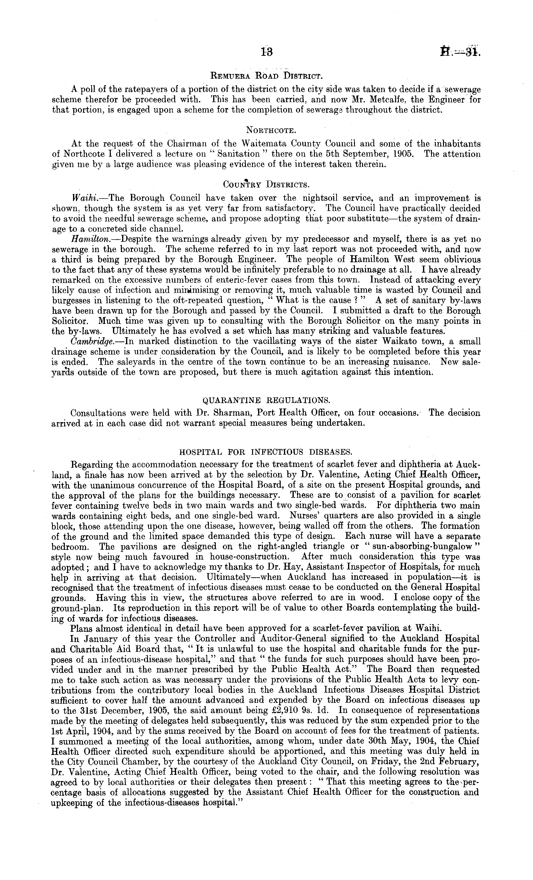 Remuera Road District. A poll of the ratepayers of a portion of the district on the city side was taken to decide if a sewerage scheme therefor be proceeded with. This has been carried, and now Mr. Metcalfe, the Engineer for that portion, is engaged upon a scheme for the completion of sewerage throughout the district. NORTHCOTE. At the request of the Chairman of the Waitemata County Council and some of the inhabitants of Northcote I delivered a lecture on " Sanitation " there on the sth September, 1905. The attention given me by a large audience was pleasing evidence of the interest taken therein. Country Districts. Waihi. —The Borough Council have taken over the nightsoil service, and an improvement is shown, though the system is as yet very far from satisfactory. The Council have practically decided to avoid the needful sewerage scheme, and propose adopting that poor substitute—the system of drainage to a concreted side channel. Hamilton. —Despite the warnings already given by my predecessor and myself, there is as yet no sewerage in the borough. The scheme referred to in my last report was not proceeded with, and now a third is being prepared by the Borough Engineer. The people of Hamilton West seem oblivious to the fact that any of these systems would be infinitely preferable to no drainage at all. I have already remarked on the excessive numbers of enteric-fever cases from this town. Instead of attacking every likely cause of infection and minimising or removing it, much valuable time is wasted by Council and burgesses in listening to the oft-repeated question, " What is the cause ? " A set of sanitary by-laws have been drawn up for the Borough and passed by the Council. I submitted a draft to the Borough Solicitor. Much time was given up to consulting with the Borough Solicitor on the many points in the by-laws. Ultimately he has evolved a set which has many striking and valuable features. Cambridge. —In marked distinction to the vacillating ways of the sister Waikato town, a small drainage scheme is under consideration by the Council, and is likely to be completed before this year is ended. The saleyards in the centre of the town continue to be an increasing nuisance. New saleyarHs outside of the town are proposed, but there is much agitation against this intention. QUARANTINE REGULATIONS. Consultations were held with Dr. Sharman, Port Health Officer, on four occasions. The decision arrived at in each case did not warrant special measures being undertaken. HOSPITAL FOR INFECTIOUS DISEASES. Regarding the accommodation necessary for the treatment of scarlet fever and diphtheria at Auckland, a finale has now been arrived at by the selection by Dr. Valentine, Acting Chief Health Officer, with the unanimous concurrence of the Hospital Board, of a site on the present Hospital grounds, and the approval of the plans for the buildings necessary. These are to consist of a pavilion for scarlet fever containing twelve beds in two main wards and two single-bed wards. For diphtheria two main wards containing eight beds, and one single-bed ward. Nurses' quarters are also provided in a single block, those attending upon the one disease, however, being walled off from the others. The formation of the ground and the limited space demanded this type of design. Each nurse will have a separate bedroom. The pavilions are designed on the right-angled triangle or " sun-absorbing-bungalow" style now being much favoured in house-construction. After much consideration this type was adopted; and I have to acknowledge my thanks to Dr. Hay, Assistant Inspector of Hospitals, for much help in arriving at that decision. Ultimately—when Auckland has increased in population—it is recognised that the treatment of infectious diseases must cease to be conducted on the General Hospital grounds. Having this in view, the structures above referred to are in wood. I enclose copy of the ground-plan. Its reproduction in this report will be of value to other Boards contemplating the building of wards for infectious diseases. Plans almost identical in detail have been approved for a scarlet-fever pavilion at Waihi. In January of this year the Controller and Auditor-General signified to the Auckland Hospital and Charitable Aid Board that, " It is unlawful to use the hospital and charitable funds for the purposes of an infectious-disease hospital," and that " the funds for such purposes should have been provided under and in the manner prescribed by the Public Health Act." The Board then requested me to take such action as was necessary under the provisions of the Public Health Acts to levy contributions from the contributory local bodies in the Auckland Infectious Diseases Hospital District sufficient to cover half the amount advanced and expended by the Board on infectious diseases up to the 31st December, 1905, the said amount being £2,910 9s. Id. In consequence of representations made by the meeting of delegates held subsequently, this was reduced by the sum expended prior to the Ist April, 1904, and by the sums received by the Board on account of fees for the treatment of patients. I summoned a meeting of the local authorities, among whom, under date 30th May, 1904, the Chief Health Officer directed such expenditure should be apportioned, and this meeting was duly held in the City Council Chamber, by the courtesy of the Auckland City Council, on Friday, the 2nd February, Dr. Valentine, Acting Chief Health Officer, being voted to the chair, and the following resolution was agreed to by local authorities or their delegates then present: " That this meeting agrees to the percentage basis of allocations suggested by the Assistant Chief Health Officer for the construction and upkeeping of the infectious-diseases hospital."