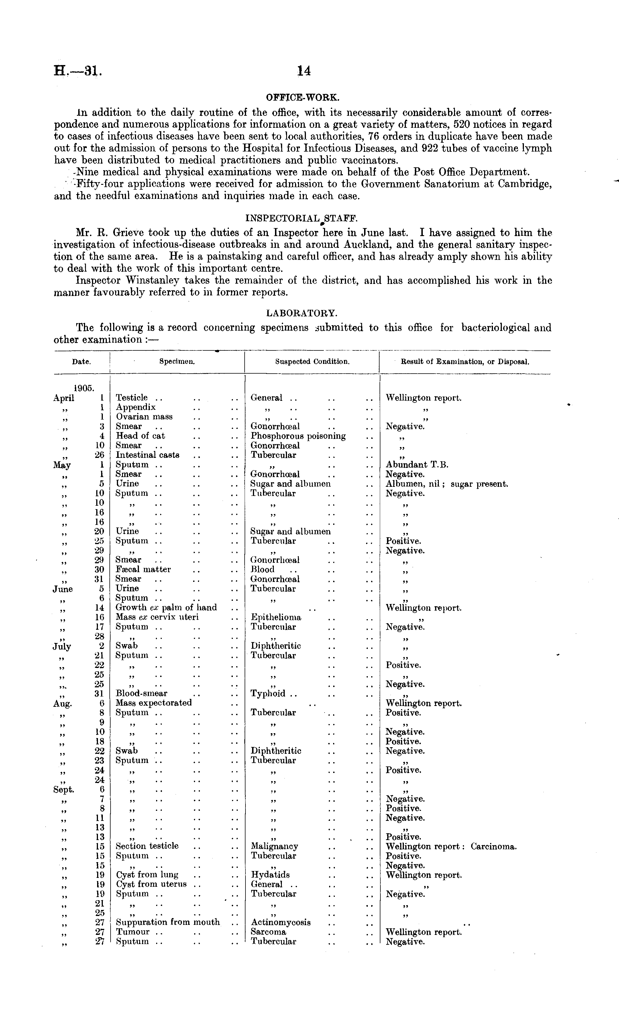 OFFICE-WORK. In addition to the daily routine of the office, with its necessarily considerable amount of correspondence and numerous applications for information on a great variety of matters, 520 notices in regard to cases of infectious diseases have been sent to local authorities, 76 orders in duplicate have been made out for the admission of persons to the Hospital for Infectious Diseases, and 922 tubes of vaccine lymph have been distributed to medical practitioners and public vaccinators. -Nine medical and physical examinations were made on behalf of the Post Office Department. ■Fifty-four applications were received for admission to the Government Sanatorium at Cambridge, and the needful examinations and inquiries made in each case. INSPECTORIAL^STAFF. Mr. R. Grieve took up the duties of an Inspector here in June last. I have assigned to him the investigation of infectious-disease outbreaks in and around Auckland, and the general sanitary inspection of the same area. He is a painstaking and careful officer, and has already amply shown his ability to deal with the work of this important centre. Inspector Winstanley takes the remainder of the district, and has accomplished his work in the manner favourably referred to in former reports. LABORATORY.