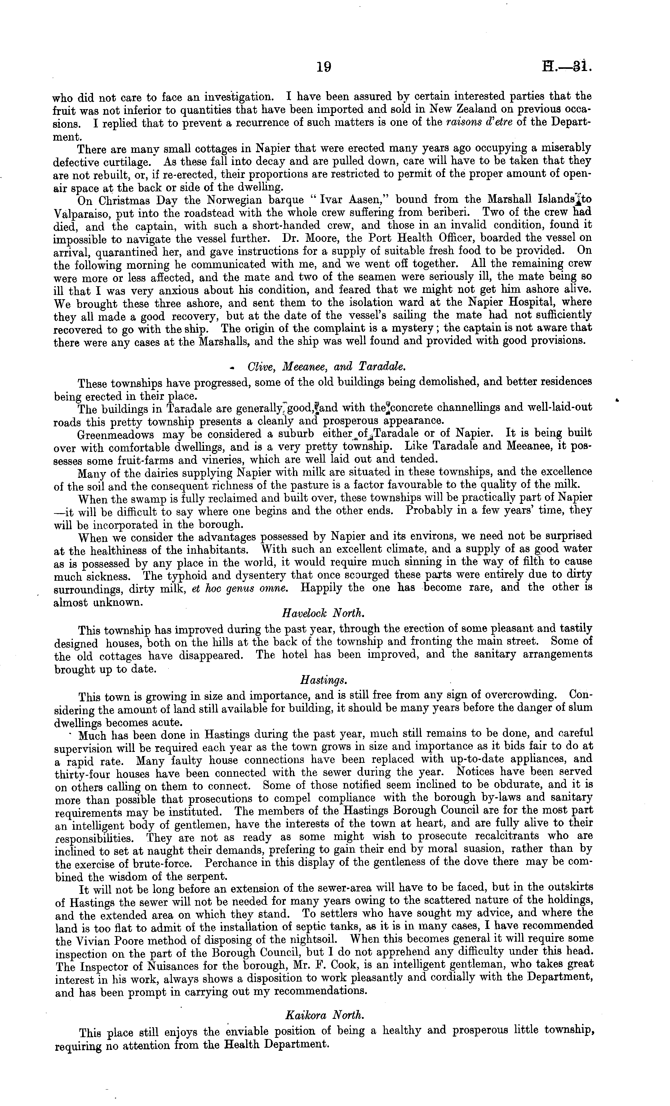 who did not care to face an investigation. I have been assured by certain interested parties that the fruit was not inferior to quantities that have been imported and sold in New Zealand on previous occasions. I replied that to prevent a recurrence of such matters is one of the raisons d'etre of the Department. There are many small cottages in Napier that were erected many years ago occupying a miserably defective curtilage." As these fall into decay and are pulled down, care will have to be taken that they are not rebuilt, or, if re-erected, their proportions are restricted to permit of the proper amount of openair space at the back or side of the dwelling. On Christmas Day the Norwegian barque " Ivar Aasen," bound from the Marshall Valparaiso, put into the roadstead with the whole crew suffering from beriberi. Two of the crew had died, and the captain, with such a short-handed crew, and those in an invalid condition, found it impossible to navigate the vessel further. Dr. Moore, the Port Health Officer, boarded the vessel on arrival, quarantined her, and gave instructions for a supply of suitable fresh food to be provided. On the following morning he communicated with me, and we went off together. All the remaining crew were more or less affected, and the mate and two of the seamen were seriously ill, the mate being so ill that I was very anxious about his condition, and feared that we might not get him ashore alive. We brought these three ashore, and sent them to the isolation ward at the Napier Hospital, where they all made a good recovery, but at the date of the vessel's sailing the mate had not sufficiently recovered to go with the ship. The origin of the complaint is a mystery; the captain is not aware that there were any cases at the Marshalls, and the ship was well found and provided with good provisions. - Olive, Meeanee, and Taradcde. These townships have progressed, some of the old buildings being demolished, and better residences being erected in their place. The buildings in Taradale are generally good,|and with channellings and well-laid-out roads this pretty township presents a cleanly and prosperous appearance. Greenmeadows may be considered a suburb either of .Taradale or of Napier. It is being built over with comfortable dwellings, and is a very pretty township. Like Taradale and Meeanee, it possesses some fruit-farms and vineries, which are well laid out and tended. Many of the dairies supplying Napier with milk are situated in these townships, and the excellence of the soil and the consequent richness of the pasture is a factor favourable to the quality of the milk. When the swamp is fully reclaimed and built over, these townships will be practically part of Napier —it will be difficult to say wheTe one begins and the other ends. Probably in a few years' time, they will be incorporated in the borough. When we consider the advantages possessed by Napier and its environs, we need not be surprised at the healthiness of the inhabitants. With such an excellent climate, and a supply of as good water as is possessed by any place in the world, it would require much sinning in the way of filth to cause much sickness. The typhoid and dysentery that once scourged these parts were entirely due to dirty surroundings, dirty milk, et hoc genus omne. Happily the one has become rare, and the other is almost unknown. Havelock North. This township has improved during the past year, through the erection of some pleasant and tastily designed houses, both on the hills at the back of the township and fronting the main street. Some of the old cottages have disappeared. The hotel has been improved, and the sanitary arrangements brought up to date. Hastings. This town is growing in size and importance, and is still free from any sign of overcrowding. Considering the amount of land still available for building, it should be many years before the danger of slum dwellings becomes acute. ' Much has been done in Hastings during the past year, much still remains to be done, and careful supervision will be required each year as the town grows in size and importance as it bids fair to do at a rapid rate. Many faulty house connections have been replaced with up-to-date appliances, and thirty-four houses have been connected with the seweT during the year. Notices have been served on others calling on them to connect. Some of those notified seem inclined to be obdurate, and it is more than possible that prosecutions to compel compliance with the borough by-laws and sanitary requirements may be instituted. The members of the Hastings Borough Council are for the most part an intelligent body of gentlemen, have the interests of the town at heart, and are fully alive to their responsibilities. They are not as ready as some might wish to prosecute recalcitrants who are inclined to set at naught their demands, prefering to gain their end by moral suasion, rather than by the exercise of brute-force. Perchance in this display of the gentleness of the dove there may be combined the wisdom of the serpent. It will not be long before an extension of the sewer-area will have to be faced, but in the outskirts of Hastings the sewer will not be needed for many years owing to the scattered nature of the holdings, and the extended area on which they stand. To settlers who have sought my advice, and where the land is too flat to admit of the installation of septic tanks, as it is in many cases, I have recommended the Vivian Poore method of disposing of the nightsoil. When this becomes general it will require some inspection on the part of the Borough Council, but I do not apprehend any difficulty under this head. The Inspector of Nuisances for the borough, Mr. F. Cook, is an intelligent gentleman, who takes great interest in his work, always shows a disposition to work pleasantly and cordially with the Department, and has been prompt in carrying out my recommendations. Kaikora North. This place still enjoys the enviable