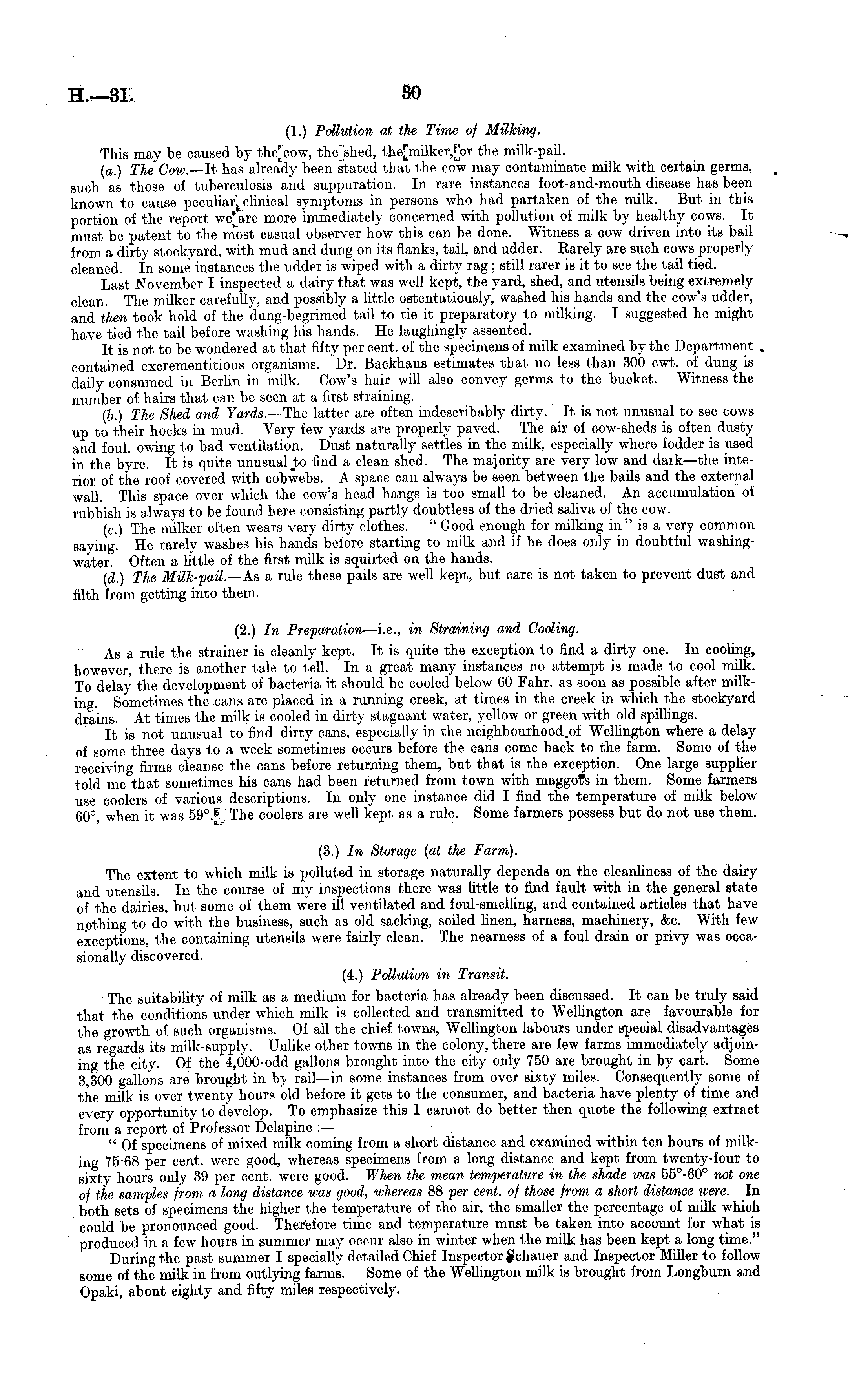 (1.) Pollution at the Time of Milking. This may be caused by the[cow, thejshed, the[milker,[or the milk-pail. (a.) The Cow. —It has already been stated that the cow may contaminate milk with certain germs, such as those of tuberculosis and suppuration. In rare instances foot-and-mouth disease has been known to cause peculiar, clinical symptoms in persons who had partaken of the milk. But in this portion of the report more immediately concerned with pollution of milk by healthy cows. It must be patent to the most casual observer how this can be done. Witness a cow driven into its bail from a dirty stockyard, with mud and dung on its flanks, tail, and udder. Rarely are such cows properly cleaned. In some instances the udder is wiped with a dirty rag ; still rarer is it to see the tail tied. Last November I inspected a dairy that was well kept, the yard, shed, and utensils being extremely clean. The milker carefully, and possibly a little ostentatiously, washed his hands and the cow's udder, and then took hold of the dung-begrimed tail to tie it preparatory to milking. I suggested he might have tied the tail before washing his hands. He laughingly assented. It is not to he wondered at that fifty per cent, of the specimens of milk examined by the Department , contained excrementitious organisms. Dr. Backhaus estimates that no less than 300 cwt. of dung is daily consumed in Berlin in milk. Cow's hair will also convey germs to the bucket. Witness the number of hairs that can be seen at a first straining. (b.) The Shed and Yards.— The latter are often indescribably dirty. It is not unusual to see cows up to their hocks in mud. Very few yards are properly paved. The air of cow-sheds is often dusty and foul, owing to bad ventilation. Dust naturally settles in the milk, especially where fodder is used in the byre. It is quite unusualJto find a clean shed. The majority are very low and daik—the interior of the roof covered with cobwebs. A space can always be seen between the bails and the external wall. This space over which the cow's head hangs is too small to be cleaned. An accumulation of rubbish is always to be found here consisting partly doubtless of the dried saliva of the cow. (c.) The milker often wears very dirty clothes. " Good enough for milking in "is a very common saying. He rarely washes his hands before starting to milk and if he does only in doubtful washingwater. Often a little of the first milk is squirted on the hands. (d.) The Milk-fail.— As a rule these pails are well kept, but care is not taken to prevent dust and filth from getting into them. (2.) In Preparation —i.e., in Straining and Cooling. As a rule the strainer is cleanly kept. It is quite the exception to find a dirty one. In cooling, however, there is another tale to tell. In a great many instances no attempt is made to cool milk. To delay the development of bacteria it should be cooled below 60 Fahr. as soon as possible after milking. Sometimes the cans are placed in a running creek, at times in the creek in which the stockyard drains. At times the milk is cooled in dirty stagnant water, yellow or green with old spillings. It is not unusual to find dirty cans, especially in the Wellington where a delay of some three days to a week sometimes occurs before the cans come back to the farm. Some of the receiving firms cleanse the cans before returning them, but that is the exception. One large supplier told me that sometimes his cans had been returned from town with maggofs in them. Some farmers use coolers of various descriptions. In only one instance did I find the temperature of milk below 60°, when it was The coolers are well kept as a rule. Some farmers possess but do not use them. (3.) In Storage (at the Farm). The extent to which milk is polluted in storage naturally depends on the cleanliness of the dairy and utensils. In the course of my inspections there was little to find fault with in the general state of the dairies, but some of them were ill ventilated and foul-smelling, and contained articles that have nothing to do with the business, such as old sacking, soiled linen, harness, machinery, &c. With few exceptions, the containing utensils were fairly clean. The nearness of a foul drain or privy was occasionally discovered. (4.) Pollution in Transit. The suitability of milk as a medium for bacteria has already been discussed. It can be truly said that the conditions under which milk is collected and transmitted to Wellington are favourable for the growth of such organisms. Of all the chief towns, Wellington labours under special disadvantages as regards its milk-supply. Unlike other towns in the colony, there are few farms immediately adjoining the city. Of the 4,000-odd gallons brought into the city only 750 are brought in by cart. Some 3,300 gallons are brought in by rail—in some instances from over sixty miles. Consequently some of the milk is over twenty hours old before it gets to the consumer, and bacteria have plenty of time and every opportunity to develop. To emphasize this I cannot do better then quote the following extract from a report of Professor Delapine : — " Of specimens of mixed milk coming from a short distance and examined within ten hours of milking 75-68 per cent, were good, whereas specimens from a long distance and kept from twenty-four to sixty hours only 39 per cent, were good. When the mean temperature in the shade was 55°-60° not one of the samples from a long distance was good, whereas 88 per cent, of those from a short distance were. In both sets of specimens the higher the temperature of the air, the smaller the percentage of milk which could be pronounced good. Therefore time and temperature must be taken into account for what is produced in a few hours in summer may occur also in winter when the milk has been kept a long time." During the past summer I specially detailed Chief Inspector §>chauer and Inspector Miller to follow some of the milk in from outlying