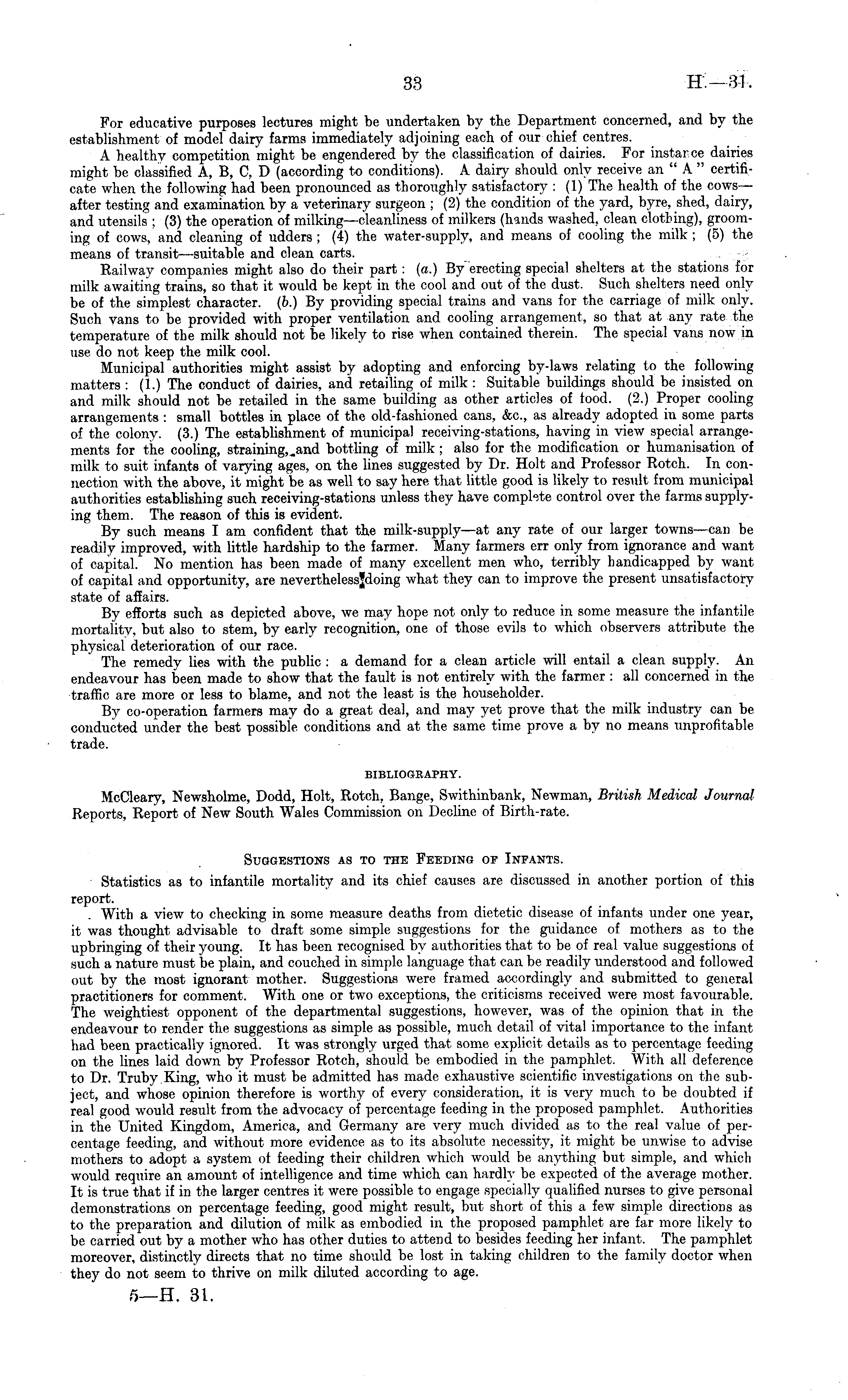 For educative purposes lectures might be undertaken by the Department concerned, and by the establishment of model dairy farms immediately adjoining each of our chief centres. A healthy competition might be engendered by the classification of dairies. For instar.ee dairies might be classified A, B, C, D (according to conditions). A dairy should only receive an "A " certificate when the following had been pronounced as thoroughly satisfactory : (1) The health of the cowsafter testing and examination by a veterinary surgeon ; (2) the condition of the yard, byre, shed, dairy, and utensils ; (3) the operation of milking—cleanliness of milkers (hands washed, clean clothing), grooming of cows, and cleaning of udders ; (4) the water-supply, and means of cooling the milk ; (5) the means of transit —suitable and clean carts. : Railway companies might also do their part : (a.) By erecting special shelters at the stations for milk awaiting trains, so that it would be kept in the cool and out of the dust. Such shelters need only be of the simplest character, (b.) By providing special trains and vans for the carriage of milk only. Such vans to be provided with proper ventilation and cooling arrangement, so that at any rate the temperature of the milk should not be likely to rise when contained therein. The special vans now in use do not keep the milk cool. Municipal authorities might assist by adopting and enforcing by-laws relating to the following matters : (1.) The conduct of dairies, and retailing of milk : Suitable buildings should be insisted on and milk should not be retailed in the same building as other articles of food. (2.) Proper cooling arrangements : small bottles in place of the old-fashioned cans, &c, as already adopted in some parts of the colony. (3.) The establishment of municipal receiving-stations, having in view special arrangements for the cooling, straining,.and bottling of milk ; also for the modification or humanisation of milk to suit infants of varying ages, on the lines suggested by Dr. Holt and Professor Rotch. In connection with the above, it might be as well to say here that little good is likely to result from municipal authorities establishing such receiving-stations unless they have complete control over the farms supplying them. The reason of this is evident. By such means lam confident that the milk-supply—at any rate of our larger towns—can be readily improved, with little hardship to the farmer. Many farmers err only from ignorance and want of capital. No mention has been made of many excellent men who, terribly handicapped by want of capital and opportunity, are nevertheless'doing what they can to improve the present unsatisfactory state of affairs. By efforts such as depicted above, we may hope not only to reduce in some measure the infantile mortality, but also to stem, by early recognition, one of those evils to which observers attribute the physical deterioration of our race. The remedy lies with the public : a demand for a clean article will entail a clean supply. An endeavour has been made to show that the fault is not entirely with the farmer : all concerned in the traffic are more or less to blame, and not the least is the householder. By co-operation farmers may do a great deal, and may yet prove that the milk industry can be conducted under the best possible conditions and at the same time prove a by no means unprofitable trade. BIBLIOGRAPHY. McCleary, Newsholme, Dodd, Holt, Rotch, Bange, Swithinbank, Newman, British Medical Journal Reports, Report of New South Wales Commission on Decline of Birth-rate. Suggestions as to the Feeding of Infants. ■ Statistics as to infantile mortality and its chief causes are discussed in another portion of this report. With a view to checking in some measure deaths from dietetic disease of infants under one year, it was thought advisable to draft some simple suggestions for the guidance of mothers as to the upbringing of their young. It has been recognised by authorities that to be of real value suggestions of such a nature must be plain, and couched in simple language that can be readily understood and followed out by the most ignorant mother. Suggestions were framed accordingly and submitted to general practitioners for comment. With one or two exceptions, the criticisms received were most favourable. The weightiest opponent of the departmental suggestions, however, was of the opinion that in the endeavour to render the suggestions as simple as possible, much detail of vital importance to the infant had been practically ignored. It was strongly urged that some explicit details as to percentage feeding on the lines laid down by Professor Rotch, should be embodied in the pamphlet. With all deference to Dr. Truby King, who it must be admitted has made exhaustive scientific investigations on the subject, and whose opinion therefore is worthy of every consideration, it is very much to be doubted if real good would result from the advocacy of percentage feeding in the proposed pamphlet. Authorities in the United Kingdom, America, and Germany are very much divided as to the real value of percentage feeding, and without more evidence as to its absolute necessity, it might be unwise to advise mothers to adopt a system of feeding their children which would be anything but simple, and which would require an amount of intelligence and time which can hardly be expected of the average mother. It is true that if in the larger centres it were possible to engage specially qualified nurses to give personal demonstrations on percentage feeding, good might result, but short of this a few simple directions as to the preparation and dilution of milk as embodied in the proposed pamphlet are far more likely to be carried out by a mother who has other duties to attend to besides feeding her infant. The pamphlet moreover, distinctly directs that no time should be lost in taking children to the family doctor when they do not seem to 