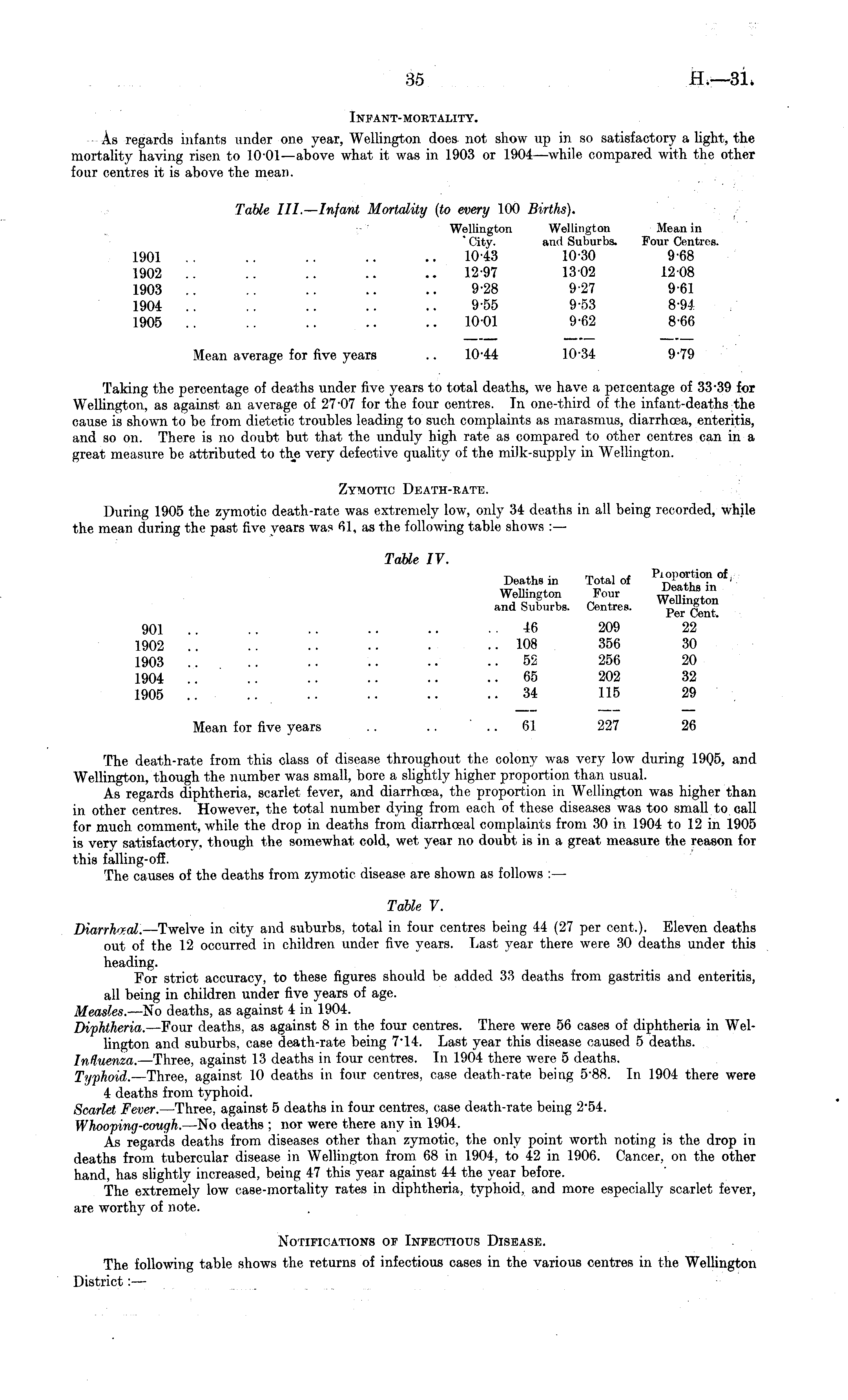 Infant- mortality. As regards infants under one year, Wellington does not show up in so satisfactory a light, the mortality having risen to 1001—above what it was in 1903 or 1904—while compared with the other four centres it is above the mean. Table lll.—lnfant Mortality (to every 100 Births). Wellington Wellington Mean in * City. ami Suburbs. Four Centres. 1901 .. .. .. .. .. 1043 10-30 9-68 1902 .. .. .. .. .. 12-97 1302 1208 1903 .. .. .. .. .. 9-28 927 9-61 1904 .. .. .. .. .. 9-55 9-53 894 1905 .. .. .. .. .. 1001 9-62 8-66 Mean average for five years .. 10-44 10-34 9-79 Taking the percentage of deaths under five years to total deaths, we have a percentage of 33-39 for Wellington, as against an average of 27-07 for the four centres. In one-third of the infant-deaths the cause is shown to be from dietetic troubles leading to such complaints as marasmus, diarrhoea, enteritis, and so on. There is no doubt but that the unduly high rate as compared to other centres can in a great measure be attributed to the very defective quality of the milk-supply in Wellington. Zymotic Death-rate. During 1905 the zymotic death-rate was extremely low, only 34 deaths in all being recorded, while the mean during the past five years was 61, as the following table shows : — Table IV. Deaths in Total of Wellington Four w^il" and Suburbs. Centres. p er Cen" 901 .. .. .. .. •• ..46 209 22 1902 .. .. .. .. . ..108 356 30 1903 .. .. .. .. •• ..52 256 20 1904 .. .. .. .. ■• ..65 202 32 1905 34 115 29 Mean for five years .. .. 61 227 26 The death-rate from this class of disease throughout the colony was very low during 1905, and Wellington, though the number was small, bore a slightly higher proportion than usual. As regards diphtheria, scarlet fever, and diarrhoea, the proportion in Wellington was higher than in other centres. However, the total number dying from each of these diseases was too small to call for much comment, while the drop in deaths from diarrhceal complaints from 30 in 1904 to 12 in 1905 is very satisfactory, though the somewhat cold, wet year no doubt is in a great measure the reason for this falling-ofi. The causes of the deaths from zymotic disease are shown as follows : — Table V. Diarrheal. —Twelve in city and suburbs, total in four centres being 44 (27 per cent.). Eleven deaths out of the 12 occurred in children under five years. Last year there were 30 deaths under this heading. For strict accuracy, to these figures should be added 33 deaths from gastritis and enteritis, all being in children under five years of age. Measles. —No deaths, as against 4 in 1904. Diphtheria. —Four deaths, as against Bin the four centres. There were 56 cases of diphtheria in Wellington and suburbs, case death-rate being 7 - 14. Last year this disease caused 5 deaths. Influenza. —Three, against 13 deaths in four centres. In 1904 there were 5 deaths. Typhoid. —Three, against 10 deaths in four centres, case death-rate being s'BB. In 1904 there were 4 deaths from typhoid. Scarlet Fever. —Three, against 5 deaths in four centres, case death-rate being 254. Whooping-cough. —No deaths ; nor were there any in 1904. As regards deaths from diseases other than zymotic, the only point worth noting is the drop in deaths from tubercular disease in Wellington from 68 in 1904, to 42 in 1906. Cancer, on the other hand, has slightly increased, being 47 this year against 44 the year before. The extremely low case-mortality rates in diphtheria, typhoid, and more especially scarlet fever, are worthy of note. Notifications of Infectious Disease. The following table shows the returns of infectious cases in the various centres in the Wellington District: —