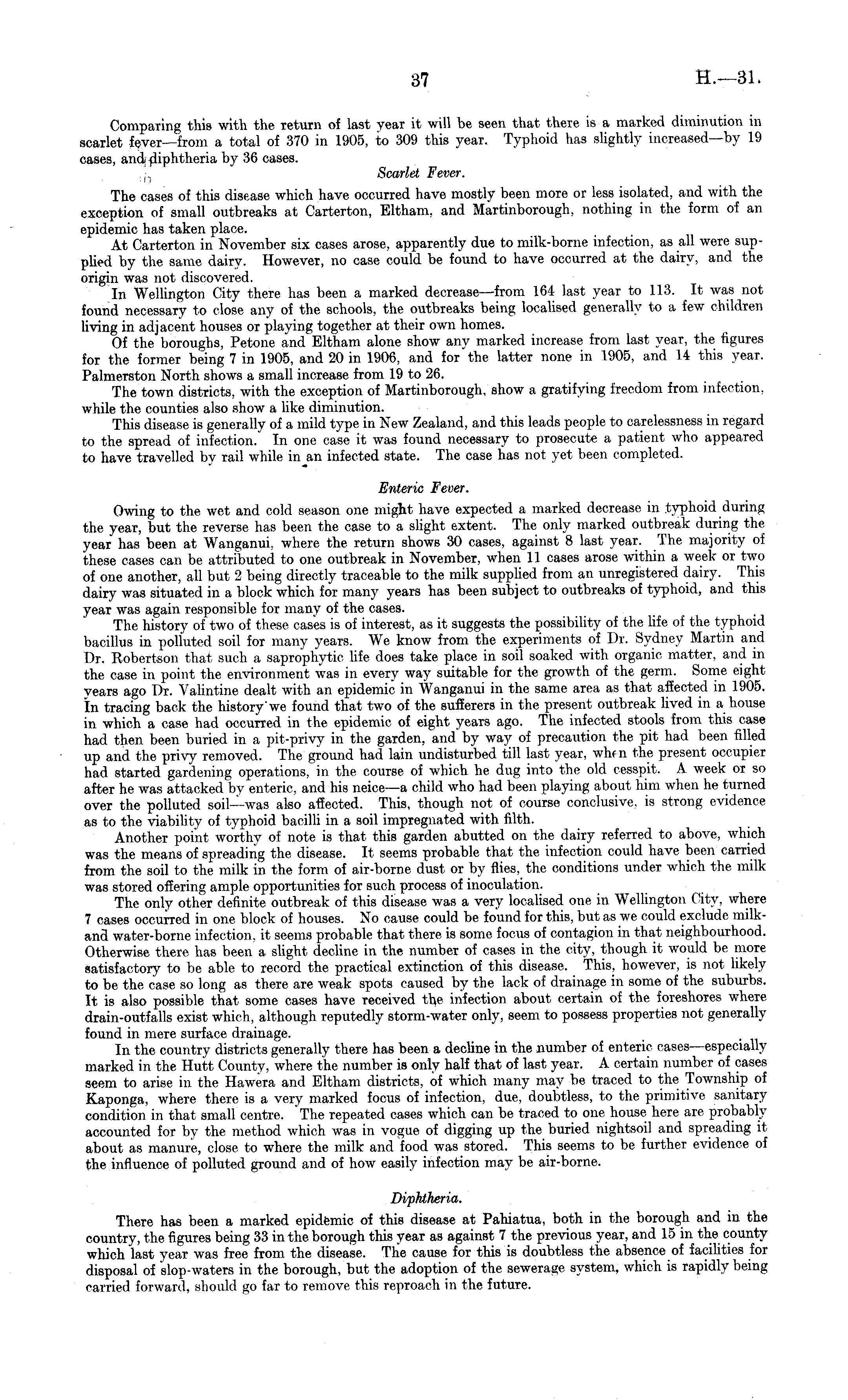 Comparing this with the return of last year it will be seen that there is a marked diminution in scarlet fever—from a total of 370 in 1905, to 309 this year. Typhoid has slightly increased—by 19 cases, and diphtheria by 36 cases. Scarlet Fever. The cases of this disease which have occurred have mostly been more or less isolated, and with the exception of small outbreaks at Carterton, Eltham, and Martinborough, nothing in the form of an epidemic has taken place. At Carterton in November six cases arose, apparently due to milk-borne infection, as all were supplied by the same dairy. However, no case could be found to have occurred at the dairy, and the origin was not discovered. In Wellington City there has been a marked decrease —from 164 last year to 113. It was not found necessary to close any of the schools, the outbreaks being localised generally to a few children living in adjacent houses or playing together at their own homes. Of the boroughs, Petone and Eltham alone show any marked increase from last year, the figures for the former being 7 in 1905, and 20 in 1906, and for "the latter none in 1905, and 14 this year. Palmerston North shows a small increase from 19 to 26. The town districts, with the exception of Martinborough, show a gratifying freedom from infection, while the counties also show a like diminution. This disease is generally of a mild type in New Zealand, and this leads people to carelessness in regard to the spread of infection. In one case it was found necessary to prosecute a patient who appeared to have travelled by rail while in an infected state. The case has not yet been completed. Enteric Fever. Owing to the wet and cold season one might have expected a marked decrease in typhoid during the year, but the reverse has been the case to a slight extent. The only marked outbreak during the year has been at Wanganui, where the return shows 30 cases, against 8 last year. The majority of these cases can be attributed to one outbreak in November, when 11 cases arose within a week or two of one another, all but 2 being directly traceable to the milk supplied from an unregistered dairy. This dairy was situated in a block which for many years has been subject to outbreaks of typhoid, and this year was again responsible for many of the cases. The history of two of these cases is of interest, as it suggests the possibility of the life of the typhoid bacillus in polluted soil for many years. We know from the experiments of Dr. Sydney Martin and Dr. Robertson that such a saprophytic life does take place in soil soaked with organic matter, and in the case in point the environment was in every way suitable for the growth of the germ. Some eight years ago Dr. Valintine dealt with an epidemic in Wanganui in the same area as that affected in 1905. In tracing back the history'we found that two of the sufferers in the present outbreak lived in a house in which a case had occurred in the epidemic of eight years ago. The infected stools from this case had then been buried in a pit-privy in the garden, and by way of precaution the pit had been filled up and the privy removed. The ground had lain undisturbed till last year, when the present occupier had started gardening operations, in the course of which he dug into the old cesspit. A week or so after he was attacked by enteric, and his neice—a child who had been playing about him when he turned over the polluted soil—was also affected. This, though not of course conclusive, is strong evidence as to the viability of typhoid bacilli in a soil impregnated with filth. Another point worthy of note is that this garden abutted on the dairy referred to above, which was the means of spreading the disease. It seems probable that the infection could have been carried from the soil to the milk in the form of air-borne dust or by flies, the conditions under which the milk was stored offering ample opportunities for such process of inoculation. The only other definite outbreak of this disease was a very localised one in Wellington City, where 7 cases occurred in one block of houses. No cause could be found for this, but as we could exclude milkand water-borne infection, it seems probable that there is some focus of contagion in that neighbourhood. Otherwise there has been a slight decline in the number of cases in the city, though it would be more satisfactory to be able to record the practical extinction of this disease. This ; however, is not likely to be the case so long as there are weak spots caused by the lack of drainage in some of the suburbs. It is also possible that some cases have received the infection about certain of the foreshores where drain-outfalls exist which, although reputedly storm-water only, seem to possess properties not generally found in mere surface drainage. In the country districts generally there has been a decline in the number of enteric cases—especially marked in the Hutt County, where the number is only half that of last year. A certain number of cases seem to arise in the Hawera and Eltham districts, of which many may be traced to the Township of Kaponga, where there is a very marked focus of infection, due, doubtless, to the primitive sanitary condition in that small centre. The repeated cases which can be traced to one house here are probably accounted for by the method which was in vogue of digging up the buried nightsoil and spreading it about as manure, close to where the milk and food was stored. This seems to be further evidence of the influence of polluted ground and of how easily infection may be air-borne. Diphtheria. There has been a marked epidemic of this disease at Pahiatua, both in the borough and in the country, the figures being 33 in the borough this year as against 7 the previous year, and 15 in the county which last year was free from the disease. The cause for this is doubtless the absence of facilities for disposal of slop-waters in the borough, but the adoption of the sewerage 