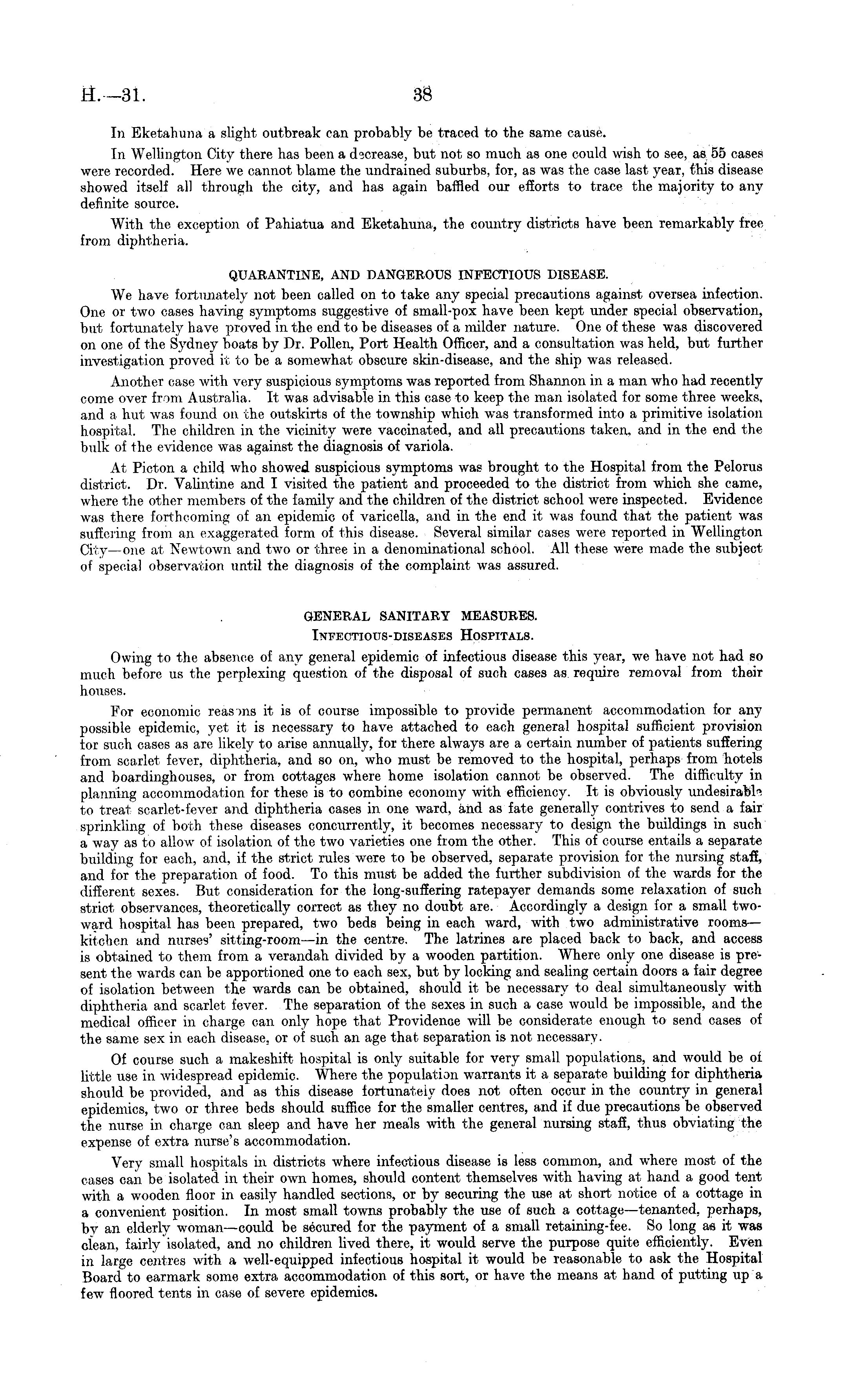 In Eketahuna a slight outbreak can probably be traced to the same cause. In Wellington City there has been a decrease, but not so much as one could wish to see, as 55 cases were recorded. Here we cannot blame the undrained suburbs, for, as was the case last year, this disease showed itself all through the city, and has again baffled our efforts to trace the majority to any definite source. With the exception of Pahiatua and Eketahuna, the country districts have been remarkably free from diphtheria. QUARANTINE, AND DANGEROUS INFECTIOUS DISEASE. We have fortunately not been called on to take any special precautions against oversea infection. One or two cases having symptoms suggestive of small-pox have been kept under special observation, but fortunately have proved in the end to be diseases of a milder nature. One of these was discovered on one of the Sydney boats by Dr. Pollen, Port Health Officer, and a consultation was held, but further investigation proved it to be a somewhat obscure skin-disease, and the ship was released. Another case with very suspicious symptoms was reported from Shannon in a man who had recently come over from Australia. It was advisable in this case to keep the man isolated for some three weeks, and a hut was found on the outskirts of the township which was transformed into a primitive isolation hospital. The children in the vicinity were vaccinated, and all precautions taken, and in the end the bulk of the evidence was against the diagnosis of variola. At Picton a child who showed suspicious symptoms was brought to the Hospital from the Pelorus district. Dr. Valintine and I visited the patient and proceeded to the district from which she came, where the other members of the family and the children of the district school were inspected. Evidence was there forthcoming of an epidemic of varicella, and in the end it was found that the patient was suffering from an exaggerated form of this disease. Several similar cases were reported in Wellington City —one at Newtown and two or three in a denominational school. All these were made the subject of special observation until the diagnosis of the complaint was assured. GENERAL SANITARY MEASURES. Infectious-diseases Hospitals. Owing to the absence of any general epidemic of infectious disease this year, we have not had so much before us the perplexing question of the disposal of such cases as require removal from their houses. For economic reasons it is of course impossible to provide permanent accommodation for any possible epidemic, yet it is necessary to have attached to each general hospital sufficient provision tor such cases as are likely to arise annually, for there always are a certain number of patients suffering from scarlet fever, diphtheria, and so on, who must be removed to the hospital, perhaps from hotels and boardinghouses, or from cottages where home isolation cannot be observed. The difficulty in planning accommodation for these is to combine economy with efficiency. It is obviously undesirable to treat scarlet-fever and diphtheria cases in one ward, and as fate generally contrives to send a fair sprinkling of both these diseases concurrently, it becomes necessary to design the buildings in such a way as to allow of isolation of the two varieties one from the other. This of course entails a separate building for each, and, if the strict rules were to be observed, separate provision for the nursing staff, and for the preparation of food. To this must be added the further subdivision of the wards for the different sexes. But consideration for the long-suffering ratepayer demands some relaxation of such strict observances, theoretically correct as they no doubt are. Accordingly a design for a small twoward hospital has been prepared, two beds being in each ward, with two administrative rooms — kitchen and nurses' sitting-room —in the centre. The latrines are placed back to back, and access is obtained to them from a verandah divided by a wooden partition. Where only one disease is present the wards can be apportioned one to each sex, but by locking and sealing certain doors a fair degree of isolation between the wards can be obtained, should it be necessary to deal simultaneously with diphtheria and scarlet fever. The separation of the sexes in such a case would be impossible, and the medical officer in charge can only hope that Providence will be considerate enough to send cases of the same sex in each disease, or of such an age that separation is not necessary. Of course such a makeshift hospital is only suitable for very small populations, and would be oi little use in widespread epidemic. Where the population warrants it a separate building for diphtheria should be provided, and as this disease fortunately does not often occur in the country in general epidemics, two or three beds should suffice for the smaller centres, and if due precautions be observed the nurse in charge can sleep and have her meals with the general nursing staff, thus obviating the expense of extra nurse's accommodation. Very small hospitals in districts where infectious disease is less common, and where most of the cases can be isolated in their own homes, should content themselves with having at hand a good tent with a wooden floor in easily handled sections, or by securing the use at short notice of a cottage in a convenient position. In most small towns probably the use of such a cottage—tenanted, perhaps, by an elderly woman—could be secured for the payment of a small retaining-fee. So long as it was clean, fairly isolated, and no children lived there, it would serve the purpose quite efficiently. Even in large centres with a well-equipped infectious hospital it would be reasonable to ask the Hospital Board to earmark some extra accommodation of this sort, or have the means at hand of putting up a few floored tents in case of severe epidemics.