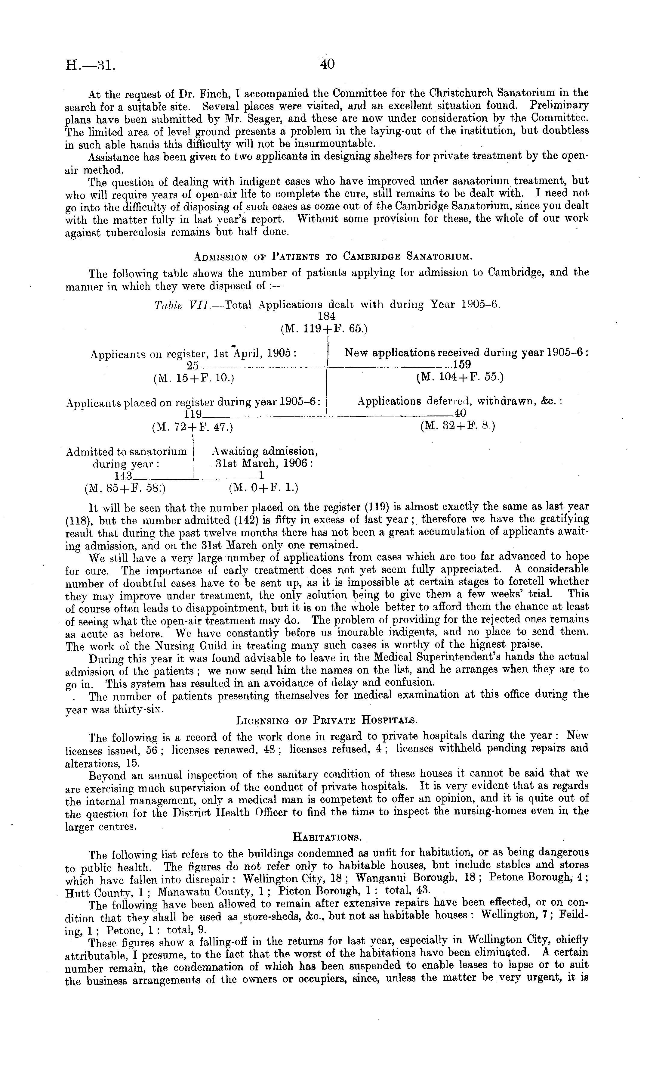 It will be seen that the number placed on the register (119) is almost exactly the same as last year (118), but the number admitted (142) is fifty in excess of last year ; therefore we have the gratifying result that during the past twelve months there has not been a great accumulation of applicants awaiting admission, and on the 31st March only one remained. We still have a very large number of applications from cases which are too far advanced to hope for cure. The importance of early treatment does not yet seem fully appreciated. A. considerable number of doubtful cases have to be sent up, as it is impossible at certain stages to foretell whether they may improve under treatment, the only solution being to give them a few weeks' trial. This of course often leads to disappointment, but it is on the whole better to afford them the chance at least of seeing what the open-air treatment may do. The problem of providing for the rejected ones remains as acute as before. We have constantly before us incurable indigents, and no place to send them. The work of the Nursing Guild in treating many such cases is worthy of the hignest praise. During this year it was found advisable to leave in the Medical Superintendent's hands the actual admission of the patients ; we now send him the names on the list, and he arranges when they are to go in. This system has resulted in an avoidance of delay and confusion. The number of patients presenting themselves for medical examination at this office during the year was thirty-six. Licensing of Private Hospitals. The following is a record of the work done in regard to private hospitals during the year : New licenses issued. 56 ; licenses renewed, 48 ; licenses refused, 4 ; licenses withheld pending repairs and alterations, 15. Beyond an annual inspection of the sanitary condition of these houses it cannot be said that we are exercising much supervision of the conduct of private hospitals. It is very evident that as regards the internal management, only a medical man is competent to offer an opinion, and it is quite out of the question for the District Health Officer to find the time to inspect the nursing-homes even in the larger centres. Habitations. The following list refers to the buildings condemned as unfit for habitation, or as being dangerous to public health. The figures do not refer only to habitable houses, but include stables and stores which have fallen into disrepair : Wellington City, 18; Wanganui Borough, 18; Petone Borough, 4; Hutt County, 1 ; Manawatu County, 1 ; Picton Borough, 1 : total, 43. The following have been allowed to remain after extensive repairs have been effected, or on condition that they shall be used as store-sheds, &c, but not as habitable houses : Wellington, 7 ; Feilding, 1 ; Petone, 1 : total, 9. These figures show a falling-off in the returns for last year, especially in Wellington City, chiefly attributable, I presume, to the fact that the worst of the habitations have been eliminated. A certain number remain, the condemnation of which has been suspended to enable leases to lapse or to suit the business arrangements of the owners or occupiers, since, unless the matter be very urgent, it is