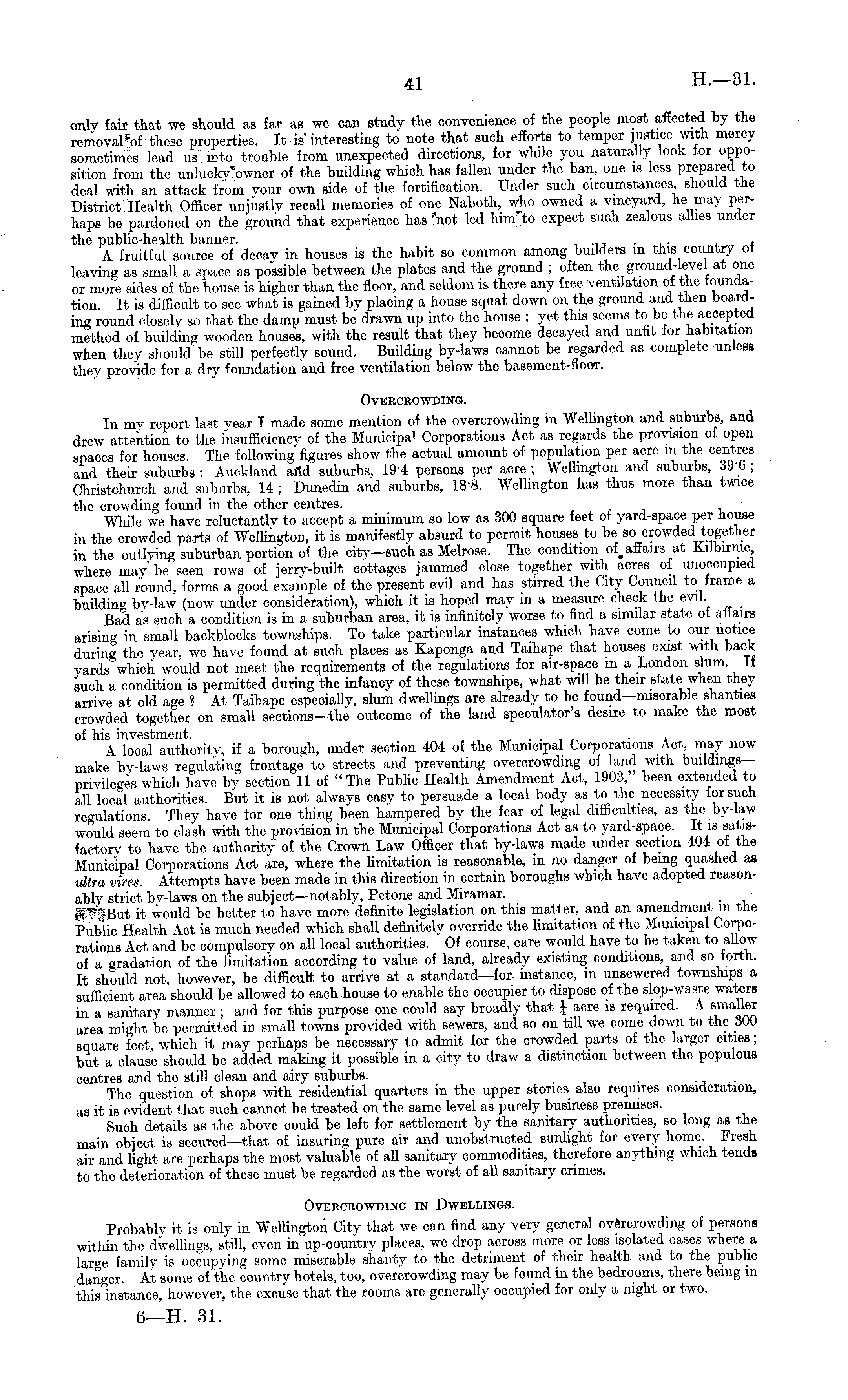 only fair that we should as far as we can study the convenience of the people most affected by the removal s of these properties. It is interesting to note that such efforts to temper justice with mercy sometimes lead us : into trouble from unexpected directions, for while you naturally look tor opposition from the unluckyowner of the building which has fallen under the ban, one is less prepared to deal with an attack from your own side of the fortification. Under such circumstances should the District Health Officer unjustly recall memories of one Naboth, who owned a vineyard, he may perhaps be pardoned on the ground that experience has 'not led him"to expect such zealous allies under the public-health banner. . . t A fruitful source of decay in houses is the habit so common among builders m this country ot leaving as small a space as possible between the plates and the ground ; often the ground-level at one or more sides of the house is higher than the floor, and seldom is there any free ventilation of the foundation. It is difficult to see what is gained by placing a house squat down on the ground and then boarding round closely so that the damp must be drawn up into the house ; yet this seems to be the accepted method of building wooden houses, with the result that they become decayed and unfit for habitation when they should be still perfectly sound. Building by-laws cannot be regarded as complete unless they provide for a dry foundation and free ventilation below the basement-floor. Overcrowding. In my report last year I made some mention of the overcrowding in Wellington and suburbs, and drew attention to the insufficiency of the Municipal Corporations Act as regards the provision of open spaces for houses. The following figures show the actual amount of population per acre in the centres and their suburbs : Auckland afld suburbs, 194 persons per acre ; Wellington and suburbs, SVb ; Christchurch and suburbs, 14 ; Dunedin and suburbs, 18-8. Wellington has thus more than twice the crowding found in the other centres. While we have reluctantly to accept a minimum so low as 300 square feet of yard-space per house in the crowded parts of Wellington, it is manifestly absurd to permit houses to be so crowded together in the outlying suburban portion of the city—such as Melrose. The condition of. affairs at Kilbirnie where may be seen rows of jerry-built cottages jammed close together with acres ot unoccupied space all round, forms a good example of the present evil and has stirred the City Council to frame a buildinc by-law (now under consideration), which it is hoped may in a measure check the evil Bad as such a condition is in a suburban area, it is infinitely worse to find a similar state of aftairs arising in small backblocks townships. To take particular instances which have come to our notice during the year, we have found at such places as Kaponga and Taihape that houses exist with back yards which would not meet the requirements of the regulations for air-space m a London slum. If such a condition is permitted during the infancy of these townships, what will be their state when they arrive at old age ? At Taibape especially, slum dwellings are already to be found—miserable shanties crowded together on small sections—the outcome of the land speculator's desire to make the most of his investment. . . . A local authority, if a borough, under section 404 of the Municipal Corporations Act, may now make by-laws regulating frontage to streets and preventing overcrowding of land with buildingsprivileges which have by section 11 of "The Public Health Amendment Act, 1903," been extended to all local authorities. But it is not always easy to persuade a local body as to the necessity for such regulations. They have for one thing been hampered by the fear of legal difficulties, as the by-law would seem to clash with the provision in the Municipal Corporations Act as to yard-space. It is satisfactory to have the authority of the Crown Law Officer that by-laws made under section 404 ot the Municipal Corporations Act are, where the limitation is reasonable, in no danger of being quashed as ultra vires. Attempts have been made in this direction in certain boroughs which have adopted reasonably strict by-laws on the subject—notably, Petone and Miramar. But it would be better to have more definite legislation on this matter, and an amendment in the Public Health Act is much needed which shall definitely override the limitation of the Municipal Corporations Act and be compulsory on all local authorities. Of course, care would have to be taken to allow of a gradation of the limitation according to value of land, already existing conditions, and so forth. It should not, however, be difficult to arrive at a standard—for instance, m unsewered townships a sufficient area should be allowed to each house to enable the occupier to dispose of the slop-waste waters in a sanitary manner ; and for this purpose one could say broadly that J acre is required. A smaller area might be permitted in small towns provided with sewers, and so on till we come down to the 300 square feet which it may perhaps be necessary to admit for the crowded parts of the larger cities; but a clause should be added making it possible in a city to draw a distinction between the populous centres and the still clean and airy suburbs. _ The question of shops with residential quarters in the upper stories also requires consideration, as it is evident that such cannot be treated on the same level as purely business premises. Such details as the above could be left for settlement by the sanitary authorities, so long as the main object is secured—that of insuring pure air and unobstructed sunlight for every home. Fresh air and light are perhaps the most valuable of all sanitary commodities, therefore anything which tends to the deterioration of these must be regarded as the worst of all sanitary crimes. Overcrowding in Dwellings. Pr