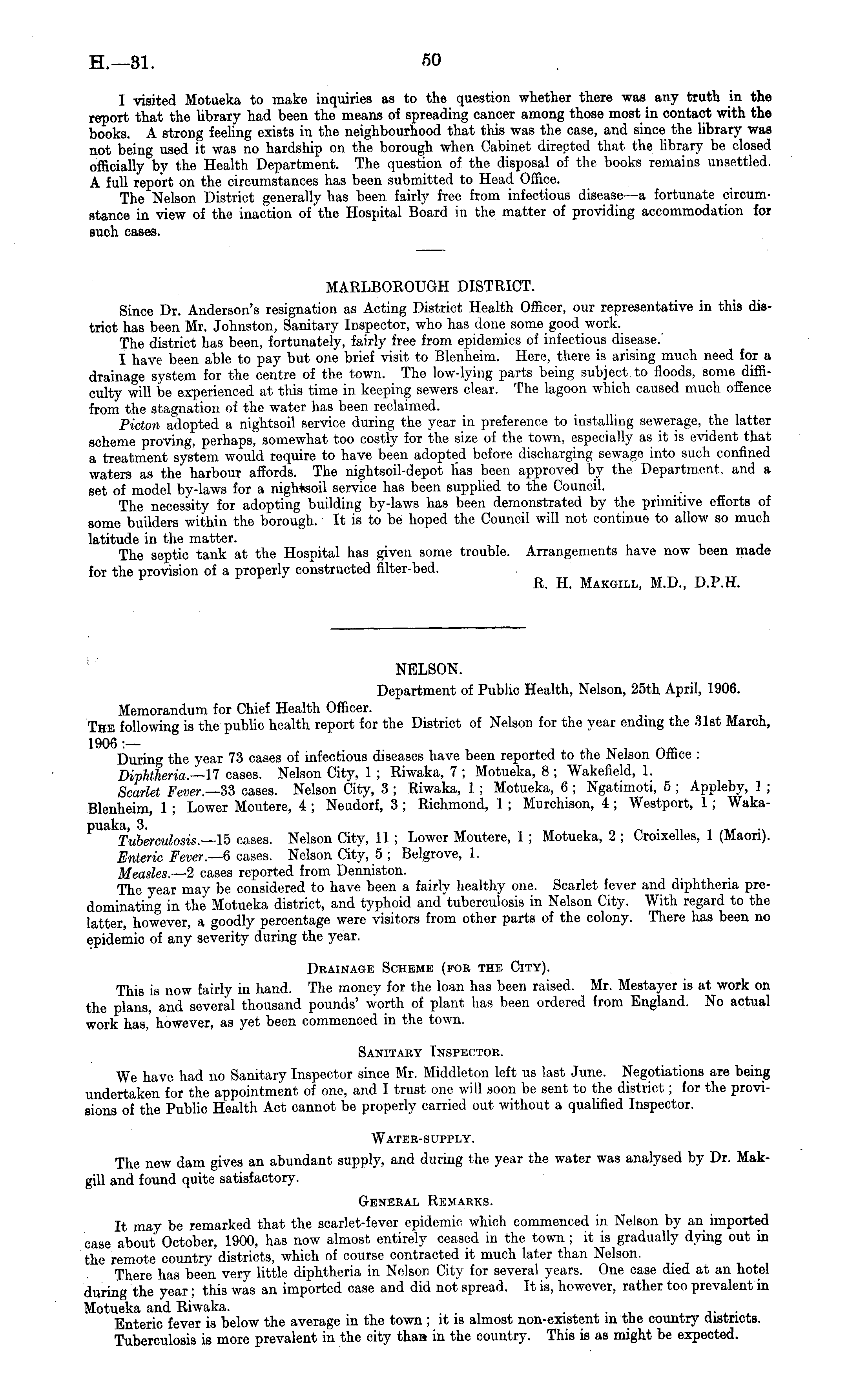 I visited Motueka to make inquiries as to the question whether there was any truth in the report that the library had been the means of spreading cancer among those most in contact with the books. A strong feeling exists in the neighbourhood that this was the case, and since the library was not being used it was no hardship on the borough when Cabinet directed that the library be closed officially by the Health Department. The question of the disposal of the books remains unsettled. A full report on the circumstances has been submitted to Head Office. The Nelson District generally has been fairly free from infectious disease —a fortunate circumstance in view of the inaction of the Hospital Board in the matter of providing accommodation for such cases. MAELBOEOUGH DISTEICT. Since Dr. Anderson's resignation as Acting District Health Officer, our representative in this district has been Mr. Johnston, Sanitary Inspector, who has done some good work. The district has been, fortunately, fairly free from epidemics of infectious disease. I have been able to pay but one brief visit to Blenheim. Here, there is arising much need for a drainage system for the centre of the town. The low-lying parts being subject, to floods, some difficulty will be experienced at this time in keeping sewers clear. The lagoon which caused much offence from the stagnation of the water has been reclaimed. Picton adopted a nightsoil service during the year in preference to installing sewerage, the latter scheme proving, perhaps, somewhat too costly for the size of the town, especially as it is evident that a treatment system would require to have been adopted before discharging sewage into such confined waters as the harbour affords. The nightsoil-depot has been approved by the Department, and a set of model by-laws for a nigh*soil service has been supplied to the Council. The necessity for adopting building by-laws has been demonstrated by the primitive efforts of some builders within the borough. It is to be hoped the Council will not continue to allow so much latitude in the matter. The septic tank at the Hospital has given some trouble. Arrangements have now been made for the provision of a properly constructed filter-bed. F E. H. Makgill, M.D., D.P.H. NELSON. Department of Public Health, Nelson, 25th April, 1906. Memorandum for Chief Health Officer. The following is the public health report for the District of Nelson for the year ending the 31st March, J 906 ■ During the year 73 cases of infectious diseases have been reported to the Nelson Office : Diphtheria. —17 cases. Nelson City, 1 ; Eiwaka, 7 ; Motueka, 8 ; Wakefield, 1. Scarlet Fever.— 33 cases. Nelson City, 3 ; Eiwaka, 1 ; Motueka, 6 ; Ngatimoti, 5 ; Appleby, 1 ; Blenheim, 1 ; Lower Moutere, 4 ; Neudorf, 3 ; Eichmond, 1 ; Murchison, 4 ; Westport, 1 ; WakaTubercvJosis.—lb cases. Nelson City, 11 ; Lower Moutere, 1 ; Motueka, 2 ; Croixelles, 1 (Maori). Enteric Fever—% cases. Nelson City, 5 ; Belgrove, 1. Measles.— 2 cases reported from Denniston. The year may be considered to have been a fairly healthy one. Scarlet fever and diphtheria predominating in the Motueka district, and typhoid and tuberculosis in Nelson City. With regard to the latter, however, a goodly percentage were visitors from other parts of the colony. There has been no epidemic of any severity during the year. Drainage Scheme (for the City). This is now fairly in hand. The money for the loan has been raised. Mr. Mestayer is at work on the plans, and several thousand pounds' worth of plant has been ordered from England. No actual work has, however, as yet been commenced in the town. Sanitary Inspector. We have had no Sanitary Inspector since Mr. Middleton left us last June. Negotiations are being undertaken for the appointment of one, and I trust one will soon be sent to the district; for the provisions of the Public Health Act cannot be properly carried out without a qualified Inspector. Water-supply. The new dam gives an abundant supply, and during the year the water was analysed by Dr. Makgill and found quite satisfactory. General Eemarks. It may be remarked that the scarlet-fever epidemic which commenced in Nelson by an imported case about October, 1900, has now almost entirely ceased in the town ; it is gradually dying out in the remote country districts, which of course contracted it much later than Nelson. There has been very little diphtheria in Nelson City for several years. One case died at an hotel during the year ; this was an imported case and did not spread. It is, however, rather too prevalent in Motueka and Eiwaka. . . , • - •,• . Enteric fever is below the average in the town ; it is almost non-existent in the country districts. Tuberculosis is more prevalent in the city thaa in the country. This is as might be expected.