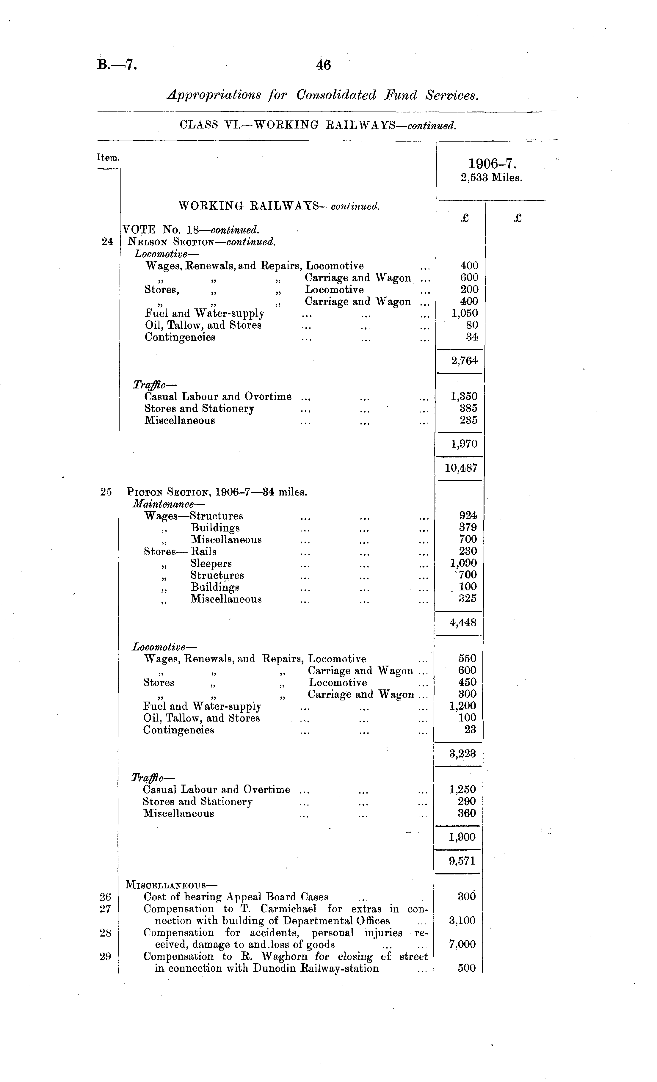 ;ern. 19 2,53! '6-7. Miles WORKING RAILWAYS—continued. VOTE No. 18— continued. Nelson Section — continued. Locomotive — Wages, Renewals, and Repairs, Locomotive „ „ „ Carriage and Wagon ... Stores, ,, „ Locomotive „ ,, „ Carriage and Wagon ... Fuel and Water-supply Oil, Tallow, and Stores Contingencies £ 24 400 600 200 400 1,050 80 34 2,764 Traffic— Casual Labour and Overtime ... Stores and Stationery Miscellaneous 1,350 385 235 1,970 10,487 25 Picton Section, 1906-7—34 miles. Maintenan ce — Wages—Structures „ Buildings „ Miscellaneous Stores —Rails „ Sleepers „ Structures ,, Buildings ,, Miscellaneous 924 379 700 230 1,090 700 100 325 4,448 Locomotive — Wages, Renewals, and Repairs, Locomotive „ ,, ,, Carriage and Wagon ... Stores ,, „ Locomotive ,, „ „ Carriage and Wagon ... Fuel and Water-supply Oil, Tallow, and Stores Contingencies 550 600 450 300 1,200 100 23 3,223 Traffic— Casual Labour and Overtime ... Stores and Stationery Miscellaneous 1,250 290 360 1,900 9,571 20 •27 28 Miscellaneous — Cost of hearing Appeal Board Cases Compensation to T. Carmichael for extras in connection with building of Departmental Offices Compensation for accidents, personal injuries received, damage to and.loss of goods Compensation to R. Waghorn for closing of street in connection with Dunedin Railway-station 300 3,100 29 7,000 500