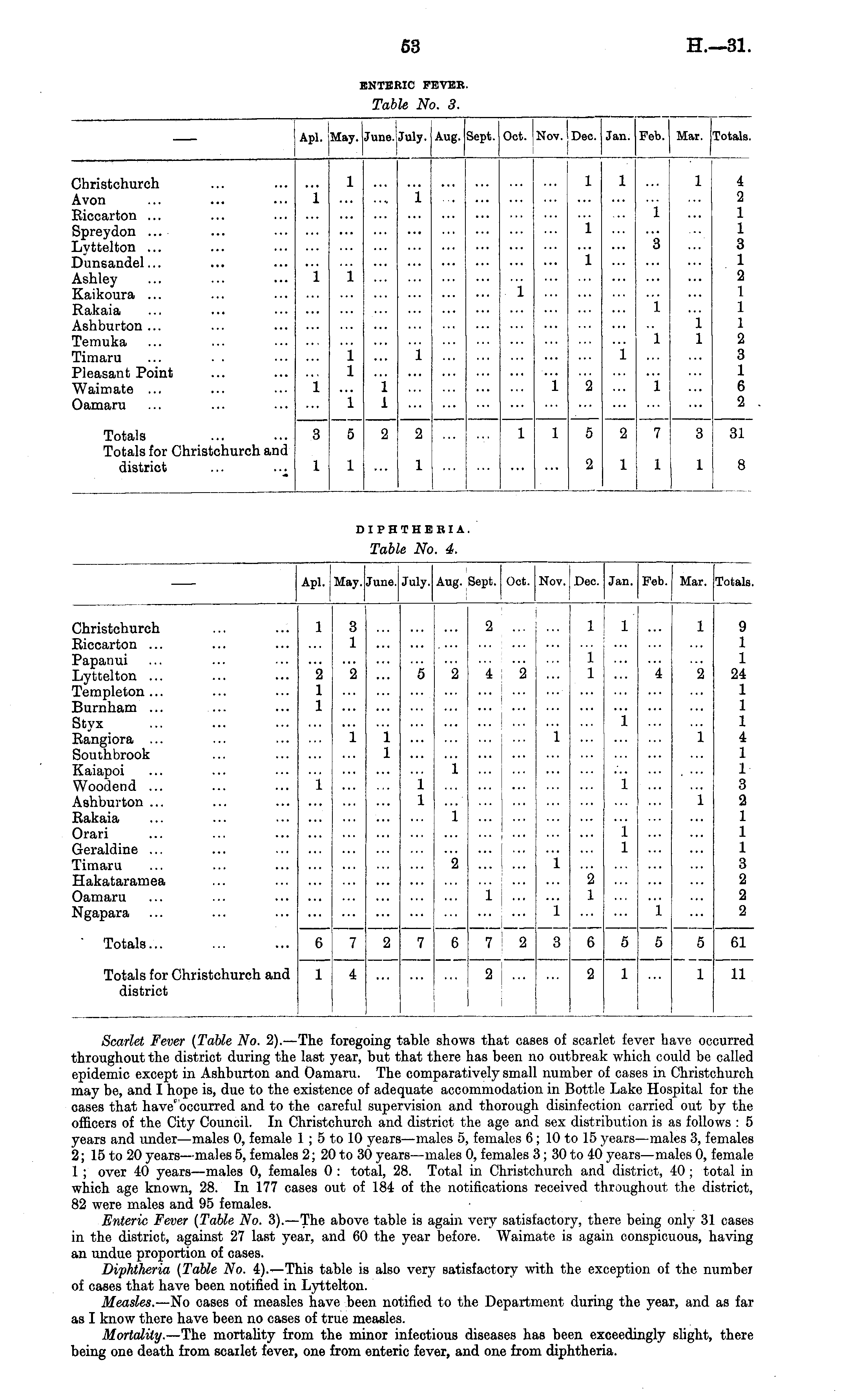 Apl. May. June. July. Aug. Sept. Oct. Nov. Dec. Jan. Feb. Mar. Totals. I Christchurch Eiccarton ... Papanui Lytcelton ... Templeton... Burnham ... Styx Eangiora ... Southbrook Kaiapoi Woodend ... Ashburton ... Rakaia Orari Geraldine ... Timaru Hakataramea 1 2 1 1 1 3 1 *2 i i i "5 1 1 2 i 2 ... 4 2 i i i 1 1 1 1 ... 1 9 1 1 4 2 24 1 1 1 1 1 4 1 1 1 3 1 2 1 1 1 1 1 3 2 2 1 ... 2 1 "i i 4 1 2 1 "i 1 "1 1 2 ... ! ... 1 "i I '.'.'. 2 1 Oamaru 1 i Ngapara ' Totals... 6 7 2 7 6 7 2 3 6 5 5 5 61 5 5 5 Totals for Christchurch and district 1 4 ... 2 ... 2 1 1 ... 1 11 1