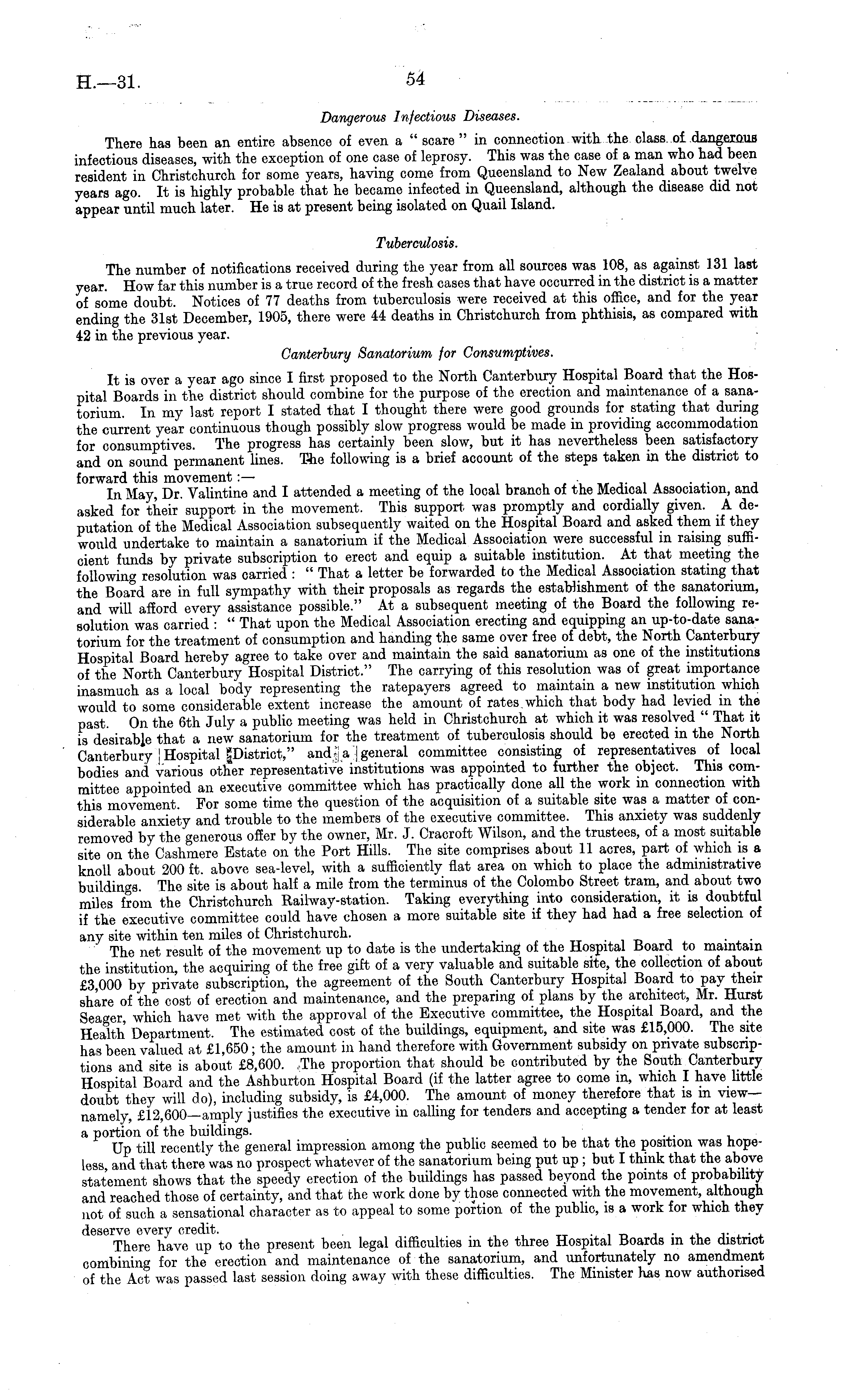 Dangerous Infectious Diseases. There has been an entire absence of even a " scare " in connection with the class o£ dangerous infectious diseases, with the exception of one case of leprosy. This was the case of a man who had been resident in Christchurch for some years, having come from Queensland to New Zealand about twelve years ago. It is highly probable that he became infected in Queensland, although the disease did not appear until much later. He is at present being isolated on Quail Island. Tuberculosis. The number of notifications received during the year from all sources was 108, as against 131 last year. How far this number is a true record of the fresh cases that have occurred in the district is a matter of some doubt. Notices of 77 deaths from tuberculosis were received at this office, and for the year ending the 31st December, 1905, there were 44 deaths in Christchurch from phthisis, as compared with 42 in the previous year. Canterbury Sanatorium for Consumptives. It is over a year ago since I first proposed to the North Canterbury Hospital Board that the Hospital Boards in the district should combine for the purpose of the erection and maintenance of a sanatorium. In my last report I stated that I thought there were good grounds for stating that during the current year continuous though possibly slow progress would be made in providing accommodation for consumptives. The progress has certainly been slow, but it has nevertheless been satisfactory and on sound permanent lines. The following is a brief account of the steps taken in the district to forward this movement:— . _ . In May, Dr. Valintine and I attended a meeting of the local branch of the Medical Association, and asked for their support in the movement. This support was promptly and cordially given. A deputation of the Medical Association subsequently waited on the Hospital Board and asked them if they would undertake to maintain a sanatorium if the Medical Association were successful in raising sufficient funds by private subscription to erect and equip a suitable instibution. At that meeting the following resolution was carried : " That a letter be forwarded to the Medical Association stating that the Board are in full sympathy with their proposals as regards the establishment of the sanatorium, and will afford every assistance possible." At a subsequent meeting of the Board the following resolution was carried : " That upon the Medical Association erecting and equipping an up-to-date sanatorium for the treatment of consumption and handing the same over free of debt, the North Canterbury Hospital Board hereby agree to take over and maintain the said sanatorium as one of the institutions of the North Canterbury Hospital District." The carrying of this resolution was of great importance inasmuch as a local body representing the ratepayers agreed to maintain a new institution which would to some considerable extent increase the amount of rates which that body had levied in the past. On the 6th July a public meeting was held in Christchurch at which it was resolved " That it is desirable that a new sanatorium for the treatment of tuberculosis should be erected in the North Canterbury ! Hospital and : i a j general committee consisting of representatives of local bodies and various other representative institutions was appointed to further the object. This committee appointed an executive committee which has practically done all the work in connection with this movement. For some time the question of the acquisition of a suitable site was a matter of considerable anxiety and trouble to the members of the executive committee. This anxiety was suddenly removed by the generous offer by the owner, Mr. J. Cracroft Wilson, and the trustees, of a most suitable site on the Cashmere Estate on the Port Hills. The site comprises about 11 acres, part of which is a knoll about 200 ft. above sea-level, with a sufficiently flat area on which to place the administrative buildings. The site is about half a mile from the terminus of the Colombo Street tram, and about two miles from the Christchurch Railway-station. Taking everything into consideration, it is doubtful if the executive committee could have chosen a more suitable site if they had had a free selection of any site within ten miles of Christchurch. The net result of the movement up to date is the undertaking of the Hospital Board to maintain the institution, the acquiring of the free gift of a very valuable and suitable site, the collection of about £3 000 by private subscription, the agreement of the South Canterbury Hospital Board to pay their share of the cost of erection and maintenance, and the preparing of plans by the architect, Mr. Hurst Seager, which have met with the approval of the Executive committee, the Hospital Board, and the Health Department. The estimated cost of the buildings, equipment, and site was £15,000. The site has been valued at £1,650; the amount in hand therefore with Government subsidy on private subscriptions and site is about £8,600. The proportion that should be contributed by the South Canterbury Hospital Board and the Ashburton Hospital Board (if the latter agree to come in, which I have little doubt they will do), including subsidy, is £4,000. The amount of money therefore that is m viewnamely, £12,600—amply justifies the executive in calling for tenders and accepting a tender for at least a portion of the buildings. Up till recently the general impression among the public seemed to be that the position was hopeless and that there was no prospect whatever of the sanatorium being put up ; but I think that the above statement shows that the speedy erection of the buildings has passed beyond the points of probability and reached those of certainty, and that the work done by those connected with the movement, although not of such a sensational character as to appeal to some portion of the public, is a work for which they deserve every