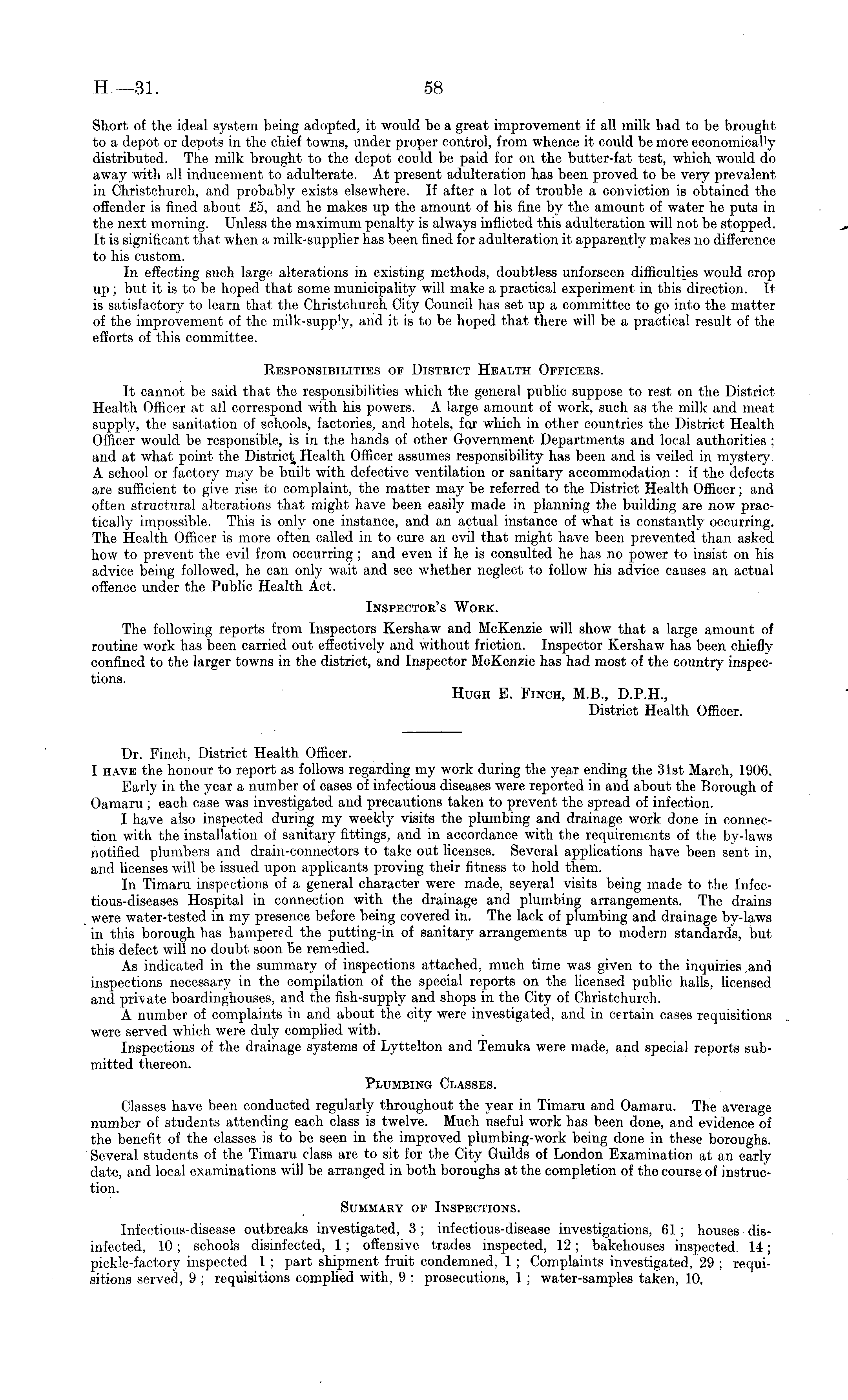 Short of the ideal system being adopted, it would be a great improvement if all milk had to be brought to a depot or depots in the chief towns, under proper control, from whence it could be more economical'}' distributed. The milk brought to the depot could be paid for on the butter-fat test, which would do away with all inducement to adulterate. At present adulteration has been proved to be very prevalent in Christchurch, and probably exists elsewhere. If after a lot of trouble a conviction is obtained the offender is fined about £5, and he makes up the amount of his fine by the amount of water he puts in the next morning. Unless the maximum penalty is always inflicted this adulteration will not be stopped. It is significant that when a milk-supplier has been fined for adulteration it apparently makes no difference to his custom. In effecting such large alterations in existing methods, doubtless unforseen difficulties would crop up; but it is to be hoped that some municipality will make a practical experiment in this direction. It is satisfactory to learn that the Christchurch City Council has set up a committee to go into the matter of the improvement of the milk-supp'y, and it is to be hoped that there will be a practical result of the efforts of this committee. Responsibilities op District Health Officers. It cannot be said that the responsibilities which the general public suppose to rest on the District Health Officer at all correspond with his powers. A large amount of work, such as the milk and meat supply, the sanitation of schools, factories, and hotels, far which in other countries the District Health Officer would be responsible, is in the hands of other Government Departments and local authorities : and at what point the District Health Officer assumes responsibility has been and is veiled in mystery. A school or factory may be built with defective ventilation or sanitary accommodation : if the defects are sufficient to give rise to complaint, the matter may be referred to the District Health Officer; and often structural alterations that might have been easily made in planning the building are now practically impossible. This is only one instance, and an actual instance of what is constantly occurring. The Health Officer is more often called in to cure an evil that might have been prevented than asked how to prevent the evil from occurring ; and even if he is consulted he has no power to insist on his advice being followed, he can only wait and see whether neglect to follow his advice causes an actual offence under the Public Health Act. Inspector's Work. The following reports from Inspectors Kershaw and McKenzie will show that a large amount of routine work has been carried out effectively and without friction. Inspector Kershaw has been chiefly confined to the larger towns in the district, and Inspector McKenzie has had most of the country inspections. Hugh E. Finch, M.8., D.P.H., District Health Officer. Dr. Finch, District Health Officer. I have the honour to report as follows regarding my work during the year ending the 31st March, 1906. Early in the year a number of cases of infectious diseases were reported in and about the Borough of Oamaru; each case was investigated and precautions taken to prevent the spread of infection. I have also inspected during my weekly visits the plumbing and drainage work done in connection with the installation of sanitary fittings, and in accordance with the requirements of the by-laws notified plumbers and drain-connectors to take out licenses. Several applications have been sent in, and licenses will be issued upon applicants proving their fitness to hold them. In Timaru inspections of a general character were made, several visits being made to the Infec-tious-diseases Hospital in connection with the drainage and plumbing arrangements. The drains were water-tested in my presence before being covered in. The lack of plumbing and drainage by-laws in this borough has hampered the putting-in of sanitary arrangements up to modern standards, but this defect will no doubt soon Be remedied. As indicated in the summary of inspections attached, much time was given to the inquiries and inspections necessary in the compilation of the special reports on the licensed public halls, licensed and private boardinghouses, and the fish-supply and shops in the City of Christchurch. A number of complaints in and about the city were investigated, and in certain cases requisitions were served which were duly complied with; Inspections of the drainage systems of Lyttelton and Temuka were made, and special reports submitted thereon. Plumbing Classes. Classes have been conducted regularly throughout the year in Timaru and Oamaru. The average number of students attending each class is twelve. Much useful work has been done, and evidence of the benefit of the classes is to be seen in the improved plumbing-work being done in these boroughs. Several students of the Timaru class are to sit for the City Guilds of London Examination at an early date, and local examinations will be arranged in both boroughs at the completion of the course of instruction. Summary of Inspections. Infectious-disease outbreaks investigated, 3 ; infectious-disease investigations, 61 ; houses disinfected, 10; schools disinfected, 1 ; offensive trades inspected, 12 ; bakehouses inspected. 14; pickle-factory inspected 1 ; part shipment fruit condemned. 1 ; Complaints investigated, 29 ; requisitions served, 9 ; requisitions complied with, 9 ; prosecutions, 1 ; water-samples taken, 10.