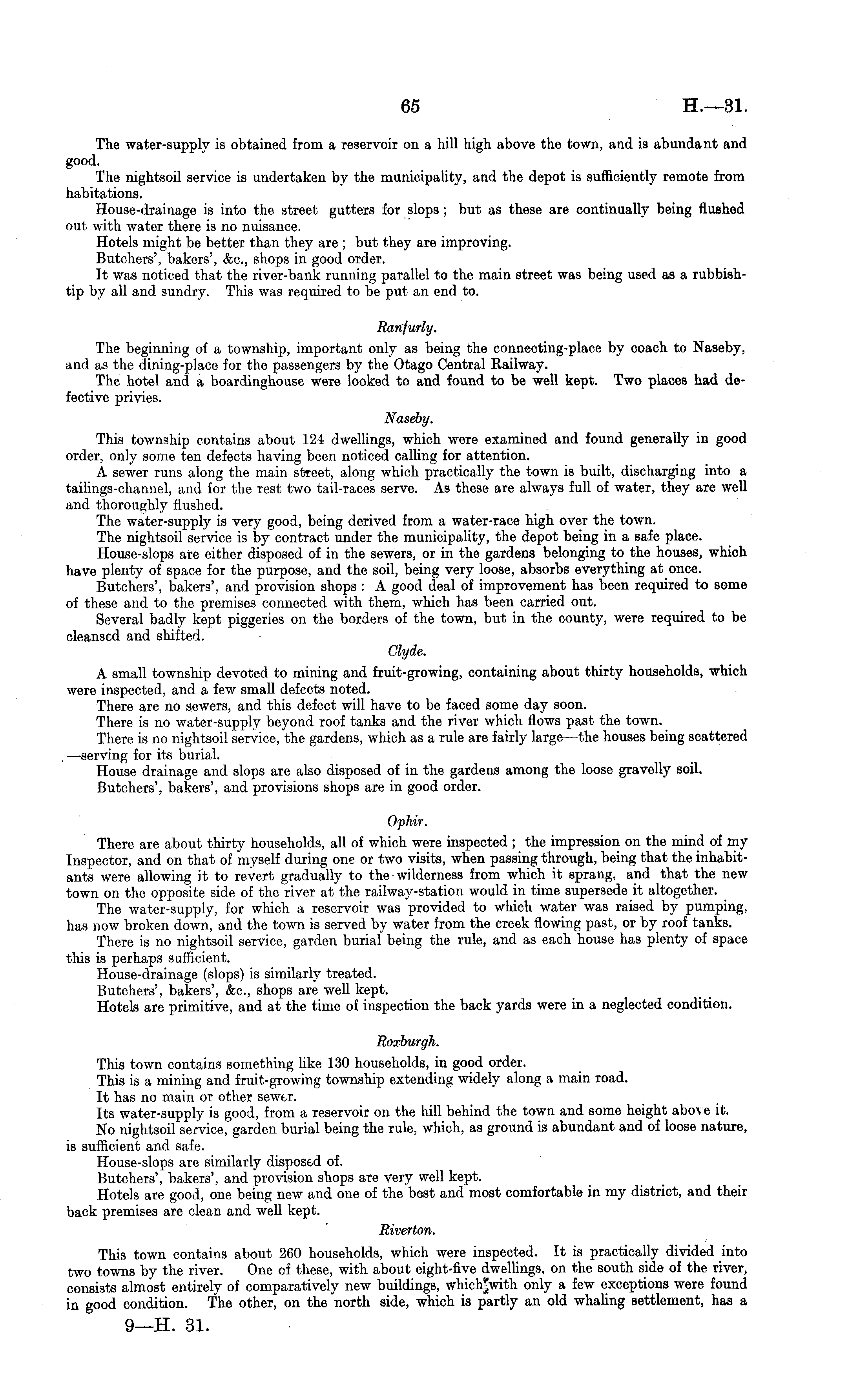 The water-supply is obtained from a reservoir on a hill high above the town, and is abundant and good. The nightsoil service is undertaken by the municipality, and the depot is sufficiently remote from habitations. House-drainage is into the street gutters for slops; but as these are continually being flushed out with water there is no nuisance. Hotels might be better than they are ; but they are improving. Butchers', bakers', &c, shops in good order. It was noticed that the river-bank running parallel to the main street was being used as a rubbishtip by all and sundry. This was required to be put an end to. Rartfurly. The beginning of a township, important only as being the connecting-place by coach to Naseby, and as the dining-place for the passengers by the Otago Central Railway. The hotel and a boardinghouse were looked to and found to be well kept. Two places had defective privies. Naseby. This township contains about 124 dwellings, which were examined and found generally in good order, only some ten defects having been noticed calling for attention. A sewer runs along the main street, along which practically the town is built, discharging into a tailings-channel, and for the rest two tail-races serve. As these are always full of water, they are well and thoroughly flushed. The water-supply is very good, being derived from a water-race high over the town. The nightsoil service is by contract under the municipality, the depot being in a safe place. House-slops are either disposed of in the sewers, or in the gardens belonging to the houses, which have plenty of space for the purpose, and the soil, being very loose, absorbs everything at once. Butchers', bakers', and provision shops : A good deal of improvement has been required to some of these and to the premises connected with them, which has been carried out. Several badly kept piggeries on the borders of the town, but in the county, were required to be cleansed and shifted. Clyde. A small township devoted to mining and fruit-growing, containing about thirty households, which were inspected, and a few small defects noted. There are no sewers, and this defect will have to be faced some day soon. There is no water-supply beyond roof tanks and the river which flows past the town. There is no nightsoil service, the gardens, which as a rule are fairly large —the houses being scattered —serving for its burial. House drainage and slops are also disposed of in the gardens among the loose gravelly soil. Butchers', bakers', and provisions shops are in good order. Ophir. There are about thirty households, all of which were inspected ; the impression on the mind of my Inspector, and on that of myself during one or two visits, when passing through, being that the inhabitants were allowing it to revert gradually to the wilderness from which it sprang, and that the new town on the opposite side of the river at the railway-station would in time supersede it altogether. The water-supply, for which a reservoir was provided to which water was raised by pumping, has now broken down, and the town is served by water from the creek flowing past, or by roof tanks. There is no nightsoil service, garden burial being the rule, and as each house has plenty of space this is perhaps sufficient. House-drainage (slops) is similarly treated. Butchers', bakers', &c, shops are well kept. Hotels are primitive, and at the time of inspection the back yards were in a neglected condition. Roxburgh. This town contains something like 130 households, in good order. This is a mining and fruit-growing township extending widely along a main road. It has no main or other sewtr. Its water-supply is good, from a reservoir on the hill behind the town and some height above it. No nightsoil service, garden burial being the rule, which, as ground is abundant and of loose nature, is sufficient and safe. House-slops are similarly disposed of. Butchers', bakers', and provision shops are very well kept. Hotels are good, one being new and one of the best and most comfortable in my district, and their back premises are clean and well kept. Riverton. This town contains about 260 households, which were inspected. It is practically divided into two towns by the river. One of these, with about eight-five dwellings, on the south side of the river, consists almost entirely of comparatively new buildings, which'with only a few exceptions were found in good condition. The other, on the north side, which is partly an old whaling settlement, has a 9—H. 31.