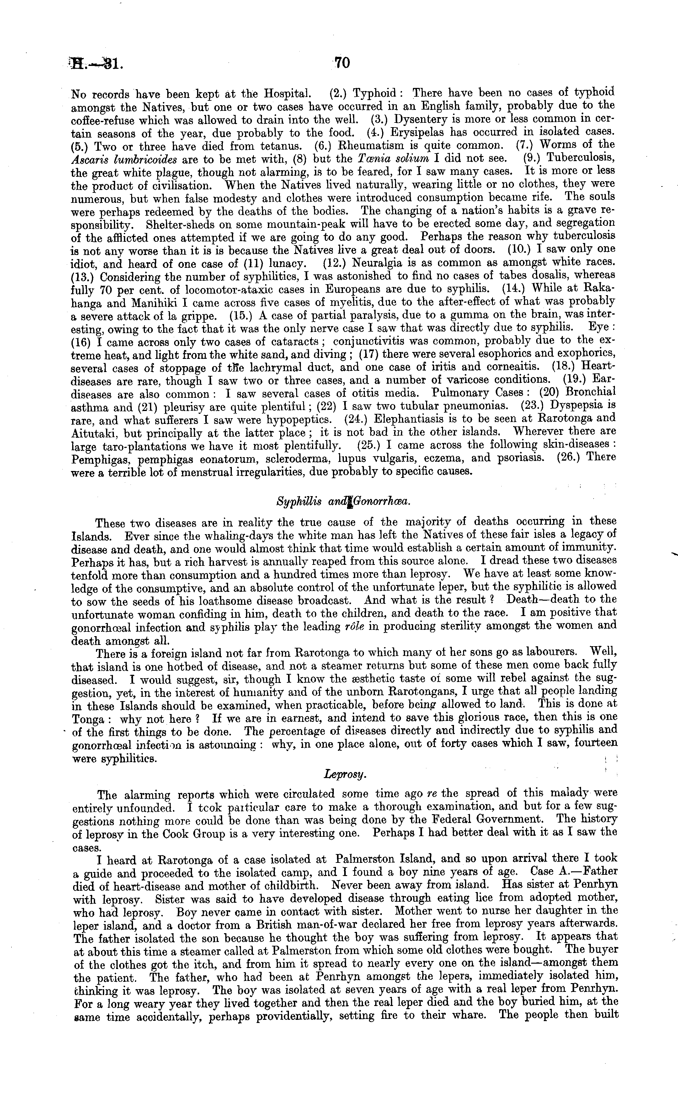 No records have been kept at the Hospital. (2.) Typhoid : There have been no oases of typhoid amongst the Natives, but one or two oases have occurred in an English family, probably due to the coffee-refuse which was allowed to drain into the well. (3.) Dysentery is more or less common in certain seasons of the year, due probably to the food. (4.) Erysipelas has occurred in isolated cases. (5.) Two or three have died from tetanus. (6.) Rheumatism is quite common. (7.) Worms of the Ascaris lumbricoides are to be met with, (8) but the Twnia solium I did not see. (9.) Tuberculosis, the great white plague, though not alarming, is to be feared, for I saw many cases. It is more or less the product of civilisation. When the Natives lived naturally, wearing little or no clothes, they were numerous, but when false modesty and clothes were introduced consumption became rife. The souls were perhaps redeemed by the deaths of the bodies. The changing of a nation's habits is a grave responsibility. Shelter-sheds on some mountain-peak will have to be erected some day, and segregation of the afflicted ones attempted if we are going to do any good. Perhaps the reason why tuberculosis is not any worse than it is is because the Natives live a great deal out of doors. (10.) I saw only one idiot, and heard of one case of (11) lunacy. (12.) Neuralgia is as common as amongst white races. (13.) Considering the number of syphilitics, I was astonished to find no cases of tabes dosalis, whereas fully 70 per cent, of locomotor-ataxic cases in Europeans are due to syphilis. (14.) While at Rakahanga and Manihiki I came across five cases of myelitis, due to the after-effect of what was probably a severe attack of la grippe. (15.) A case of partial paralysis, due to a gumma on the brain, was interesting, owing to the fact that it was the only nerve case I saw that was directly due to syphilis. Eye : (16) I came across only two cases of cataracts ; conjunctivitis was common, probably due to the extreme heat, and light from the white sand, and diving ; (17) there were several esophorics and exophorics, several cases of stoppage of tKe lachrymal duct, and one case of iritis and corneaitis. (18.) Heartdiseases are rare, though I saw two or three cases, and a number of varicose conditions. (19.) Eardiseases are also common : I saw several cases of otitis media. Pulmonary Cases : (20) Bronchial asthma and (21) pleurisy are quite plentiful; (22) I saw two tubular pneumonias. (23.) Dyspepsia is rare, and what sufferers I saw were hypopeptics. (24.) Elephantiasis is to be seen at Rarotonga and Aitutaki, but principally at the latter place ; it is not bad in the other islands. Wherever there are large taro-plantations we have it most plentifully. (25.) I came across the following skin-diseases : Pemphigas, pemphigas eonatorum, scleroderma, lupus vulgaris, eczema, and psoriasis. (26.) There were a terrible lot of menstrual irregularities, due probably to specific causes. SyphUlis and^Gonorrhcea. These two diseases are in reality the true cause of the majority of deaths occurring in these Islands. Ever since the whaling-days the white man has left the Natives of these fair isles a legacy of disease and death, and one would almost think that time would establish a certain amount of immunity. Perhaps it has, but a rich harvest is annually reaped from this source alone. I dread these two diseases tenfold more than consumption and a hundred times more than leprosy. We have at least some knowledge of the consumptive, and an absolute control of the unfortunate leper, but the syphilitic is allowed to sow the seeds of his loathsome disease broadcast. And what is the result ? Death—death to the unfortunate woman confiding in him, death to the children, and death to the race. lam positive that gonorrheal infection and syphilis play the leading role in producing sterility amongst the women and death amongst all. There is a foreign island not far from Rarotonga to which many of her sons go as labourers. Well, that island is one hotbed of disease, and not a steamer retarns but some of these men come back fully diseased. I would suggest, sir, though I know the aesthetic taste oi some will rebel against the suggestion, yet, in the interest of humanity and of the unborn Rarotongans, I urge that all people landing in these Islands should be examined, when practicable, before being allowed to land. This is done at Tonga : why not here ? If we are in earnest, and intend to save this glorious race, then this is one of the first things to be done. The percentage of diseases directly and indirectly due to syphilis and gonorrhoeal infection is astounding : why, in one place alone, out of forty cases which I saw, fourteen were syphilitics. | ! Leprosy. The alarming reports which were circulated some time ago re the spread of this malady were entirely unfounded. I tcok particular care to make a thorough examination, and but for a few suggestions nothing more could be done than was being done by the Federal Government. The history of leprosy in the Cook Group is a very interesting one. Perhaps I had better deal with it as I saw the cases. I heard at Rarotonga of a case isolated at Palmerston Island, and so upon arrival there I took a guide and proceeded to the isolated camp, and I found a boy nine years of age. Case A.—Father died of heart-disease and mother of childbirth. Never been away from island. Has sister at Penrhyn with leprosy. Sister was said to have developed disease through eating lice from adopted mother, who had leprosy. Boy never came in contact with sister. Mother went to nurse her daughter in the leper island, and a doctor from a British man-of-war declared her free from leprosy years afterwards. The father isolated the son because he thought the boy was suffering from leprosy. It appears that at about this time a steamer called at Palmerston from which some old clothes were bought. The buyer of the clothes got the itch, and from him it