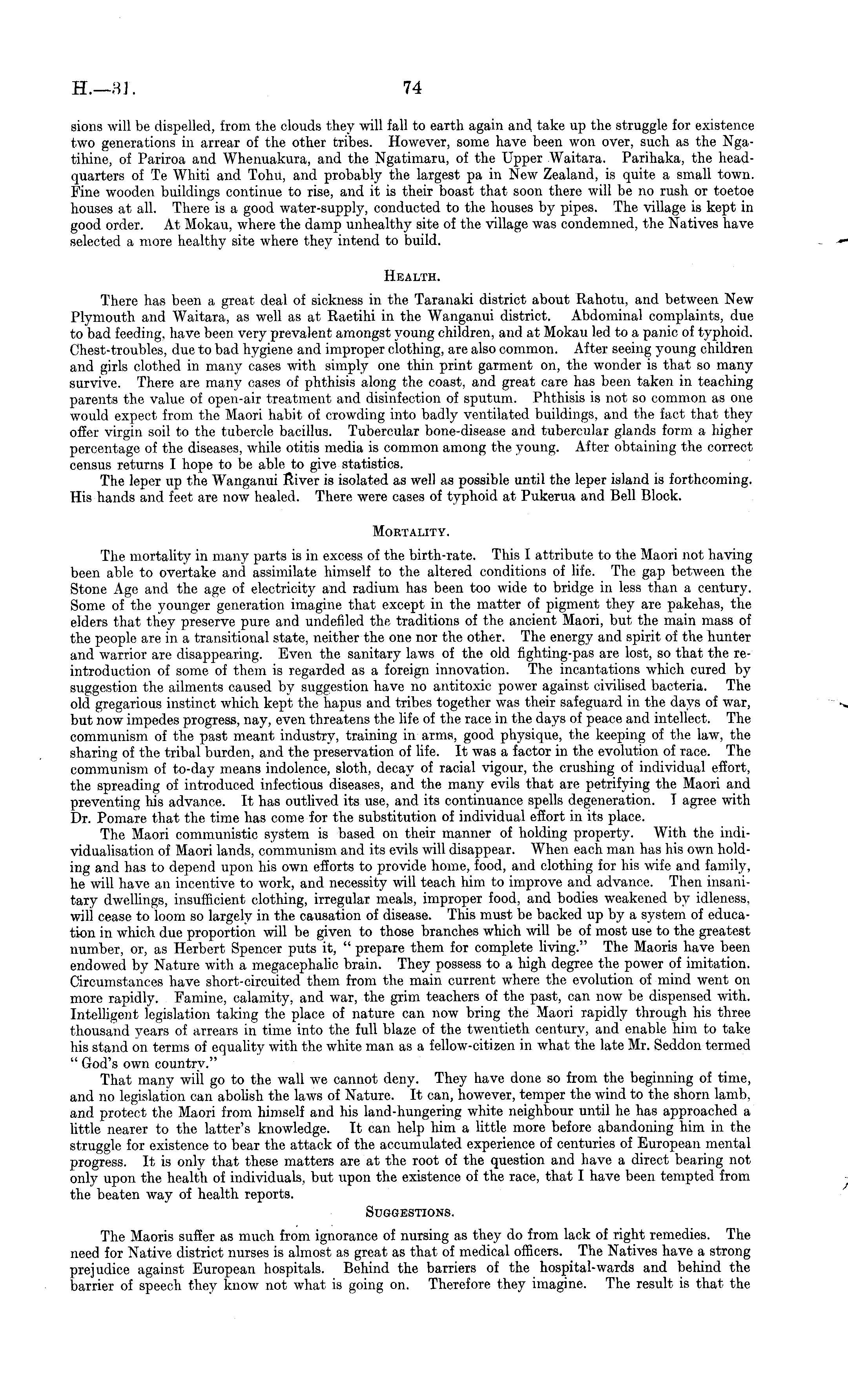 sions will be dispelled, from the clouds they will fall to earth again and take up the struggle for existence two generations in arrear of the other tribes. However, some have been won over, such as the Ngatihinc, of Pariroa and Whenuakura, and the Ngatimaru, of the Upper Waitara. Parihaka, the headquarters of Te Whiti and Tohu, and probably the largest pa in New Zealand, is quite a small town. Fine wooden buildings continue to rise, and it is their boast that soon there will be no rush or toetoe houses at all. There is a good water-supply, conducted to the houses by pipes. The village is kept in good order. At Mokau, where the damp unhealthy site of the village was condemned, the Natives have selected a more healthy site where they intend to build. Health. There has been a great deal of sickness in the Taranaki district about Rahotu, and between New Plymouth and Waitara, as well as at Raetihi in the Wanganui district. Abdominal complaints, due to bad feeding, have been very prevalent amongst young children, and at Mokau led to a panic of typhoid. Chest-troubles, due to bad hygiene and improper clothing, are also common. After seeing young children and girls clothed in many cases with simply one thin print garment on, the wonder is that so many survive. There are many cases of phthisis along the coast, and great care has been taken in teaching parents the value of open-air treatment and disinfection of sputum. Phthisis is not so common as one would expect from the Maori habit of crowding into badly ventilated buildings, and the fact that they offer virgin soil to the tubercle bacillus. Tubercular bone-disease and tubercular glands form a higher percentage of the diseases, while otitis media is common among the young. After obtaining the correct census returns I hope to be able to give statistics. The leper up the Wanganui River is isolated as well as possible until the leper island is forthcoming. His hands and feet are now healed. There were cases of typhoid at Pukerua and Bell Block. Mortality. The mortality in many parts is in excess of the birth-rate. This I attribute to the Maori not having been able to overtake and assimilate himself to the altered conditions of life. The gap between the Stone Age and the age of electricity and radium has been too wide to bridge in less than a century. Some of the younger generation imagine that except in the matter of pigment they are pakehas, the elders that they preserve pure and undefiled the traditions of the ancient Maori, but the main mass of the people are in a transitional state, neither the one nor the other. The energy and spirit of the hunter and warrior are disappearing. Even the sanitary laws of the old fighting-pas are lost, so that the reintroduction of some of them is regarded as a foreign innovation. The incantations which cured by suggestion the ailments caused by suggestion have no antitoxic power against civilised bacteria. The old gregarious instinct which kept the hapus and tribes together was their safeguard in the days of war, but now impedes progress, nay, even threatens the life of the race in the days of peace and intellect. The communism of the past meant industry, training in arms, good physique, the keeping of the law, the sharing of the tribal burden, and the preservation of life. It was a factor in the evolution of race. The communism of to-day means indolence, sloth, decay of racial vigour, the crushing of individual effort, the spreading of introduced infectious diseases, and the many evils that are petrifying the Maori and preventing his advance. It has outlived its use, and its continuance spells degeneration. T agree with Dr. Pomare that the time has come for the substitution of individual effort in its place. The Maori communistic system is based on their manner of holding property. With the individualisation of Maori lands, communism and its evils will disappear. When each man has his own holding and has to depend upon his own efforts to provide home, food, and clothing for his wife and family, he will have an incentive to work, and necessity will teach him to improve and advance. Then insanitary dwellings, insufficient clothing, irregular meals, improper food, and bodies weakened by idleness, will cease to loom so largely in the causation of disease. This must be backed up by a system of education in which due proportion will be given to those branches which will be of most use to the greatest number, or, as Herbert Spencer puts it, " prepare them for complete living." The Maoris have been endowed by Nature with a megacephalic brain. They possess to a high degree the power of imitation. Circumstances have short-circuited them from the main current where the evolution of mind went on more rapidly. Famine, calamity, and war, the grim teachers of the past, can now be dispensed with. Intelligent legislation taking the place of nature can now bring the Maori rapidly through his three thousand years of arrears in time into the full blaze of the twentieth century, and enable him to take his stand on terms of equality with the white man as a fellow-citizen in what the late Mr. Seddon termed " God's own country." That many will go to the wall we cannot deny. They have done so from the beginning of time, and no legislation can abolish the laws of Nature. It can, however, temper the wind to the shorn lamb, and protect the Maori from himself and his land-hungering white neighbour until he has approached a little nearer to the latter's knowledge. It can help him a little more before abandoning him in the struggle for existence to bear the attack of the accumulated experience of centuries of European mental progress. It is only that these matters are at the root of the question and have a direct bearing not only upon the health of individuals, but upon the existence of the race, that I have been tempted from the beaten way of health reports. Suggestions. The Maoris suffer as much from ignorance of nursing as they do from 