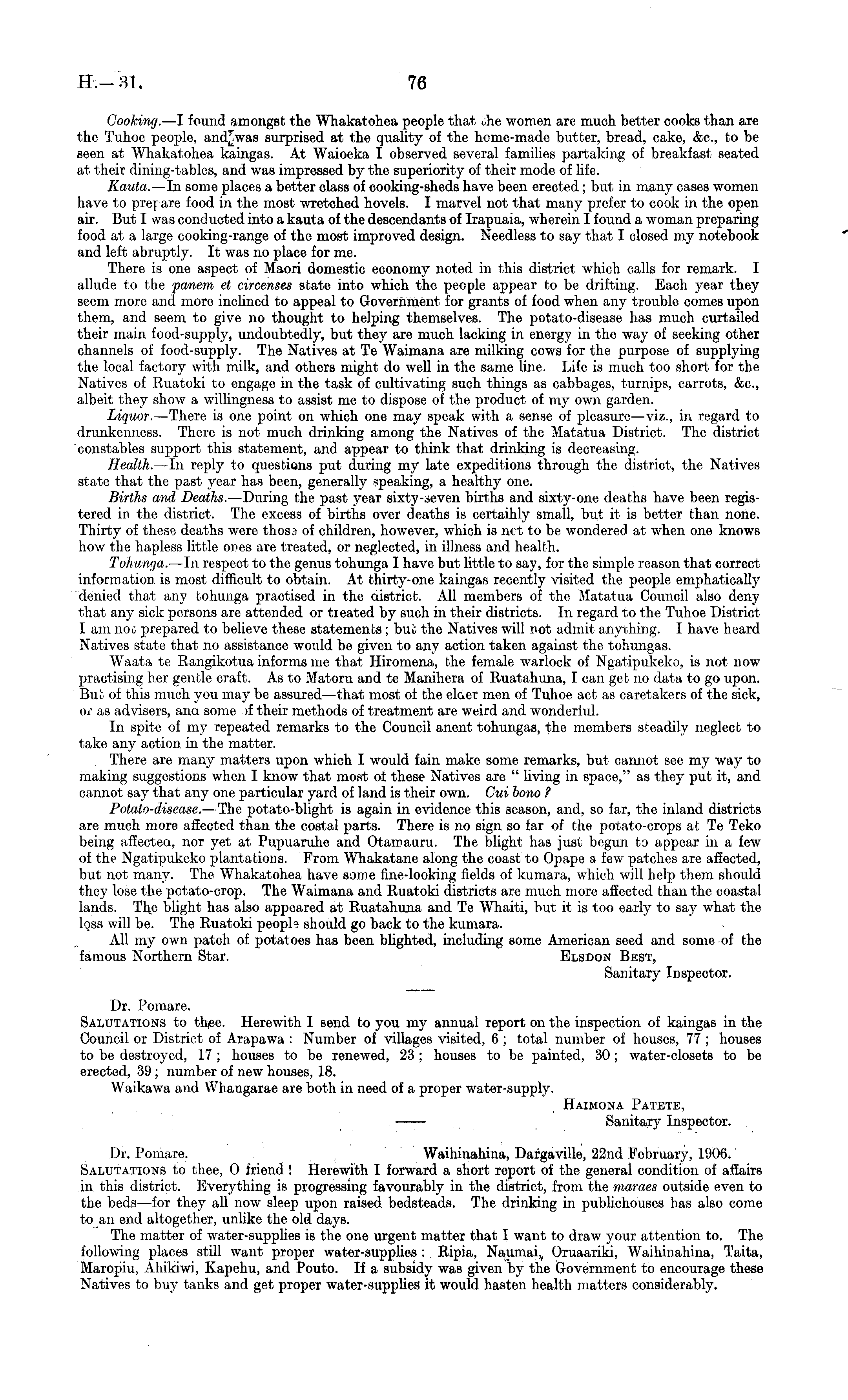 Cooking. —l found amongst the Whakatohea people that uhe women are much better cooks than are the Tuhoe people, surprised at the quality of the home-made butter, bread, cake, &c, to be seen at Whakatohea kaingas. At Waioeka I observed several families partaking of breakfast seated at their dim'ng-tables, and was impressed by the superiority of their mode of life. Kauta. —ln some places a better class of cooking-sheds have been erected; but in many cases women have to prepare food in the most wretched hovels. I marvel not that many prefer to cook in the open air. But I was conducted into a kauta of the descendants of Irapuaia, wherein I found a woman preparing food at a large cooking-range of the most improved design. Needless to say that I closed my notebook and left abruptly. It was no place for me. There is one aspect of Maori domestic economy noted in this district which calls for remark. I allude to the panem et circenses state into which the people appear to be drifting. Each year they seem more and more inclined to appeal to Government for grants of food when any trouble comes upon them, and seem to give no thought to helping themselves. The potato-disease has much curtailed their main food-supply, undoubtedly, but they are much lacking in energy in the way of seeking other channels of food-supply. The Natives at Te Waimana are milking cows for the purpose of supplying the local factory with milk, and others might do well in the same line. Life is much too short for the Natives of Ruatoki to engage in the task of cultivating such things as cabbages, turnips, carrots, &c, albeit they show a willingness to assist me to dispose of the product of my own garden. Liquor. —There is one point on which one may speak with a sense of pleasure—viz., in regard to drunkenness. There is not much drinking among the Natives of the Matatua District. The district constables support this statement, and appear to think that drinking is decreasing. Health. —ln reply to questions put during my late expeditions through the district, the. Natives state that the past year has been, generally speaking, a healthy one. Births and Deaths. —During the past year sixty-seven births and sixty-one deaths have been registered in the district. The excess of births over deaths is certaihly small, but it is better than none. Thirty of these deaths were thoss of children, however, which is net to be wondered at when one knows how the hapless little ones are treated, or neglected, in illness and health. Tohunga. —In respect to the genus tohunga I have but little to say, for the simple reason that correct information is most difficult to obtain. At thirty-one kaingas recently visited the people emphatically denied that any tohunga practised in the district. All members of the Matatua Council also deny that any sick persons are attended or tieated by such in their districts. In regard to the Tuhoe District lam noc prepared to believe these statements; buo the Natives will r>ot admit anything. I have heard Natives state that no assistance would be given to any action taken against the tohungas. Waata te Rangikotua informs me that Hiromena, the female warlock of Ngatipukeko, is not now practising her gentle craft. As to Matoru and te Manihera of Ruatahuna, I can get no data to go upon. But of this much you may be assured—that most ot the elder men of Tuhoe act as caretakers of the sick, or as advisers, ana some >f their methods of treatment are weird and wonderlul. In spite of my repeated remarks to the Council anent tohungas, the members steadily neglect to take any action in the matter. There are many matters upon which I would fain make some remarks, but cannot see my way to making suggestions when I know that most ot these Natives are " living in space," as they put it, and oannot say that any one particular yard of land is their own. Cvi bono ? Potato-disease. —The potato-blight is again in evidence this season, and, so far, the inland districts are much more affected than the costal parts. There is no sign so tar of the potato-crops at Te Teko being affected, nor yet at Pupuaruhe and Otamauru. The blight has just begun to appear in a few of the Ngatipukeko plantations. From Whakatane along the coast to Opape a few patches are affected, but not many. The Whakatohea have some fine-looking fields of kumara, which will help them should they lose the potato-crop. The Waimana and Ruatoki districts are much more affected than the coastal lands. The blight has also appeared at Ruatahuna and Te Whaiti, but it is too early to say what the loss will be. The Ruatoki peoph should go back to the kumara. All my own patch of potatoes has been blighted, including some American seed and some of the famous Northern Star. Elsdon Best, Sanitary Inspector. Dr. Pomare. Salutations to thjee. Herewith I send to you my annual report on the inspection of kaingas in the Council or District of Arapawa : Number of villages visited, 6 ; total number of houses, 77 ; houses to be destroyed, 17 ; houses to be renewed, 23; houses to be painted, 30; water-closets to be erected, 39 ; number of new houses, 18. Waikawa and Whangarae are both in need of a proper water-supply. Haimona Patete, Sanitary Inspector. Dr. Pomare. Waihinahina, Dargaville, 22nd February, 1906. Salutations to thee, 0 friend ! Herewith I forward a short report of the general condition of affairs in this district. Everything is progressing favourably in the district, from the maraes outside even to the beds—for they all now sleep upon raised bedsteads. The drinking in publichouses has also come to an end altogether, unlike the old days. The matter of water-supplies is the one urgent matter that I want to draw your attention to. The following places still want proper water-supplies : Ripia, Naumai,, Oruaariki, Waihinahina, Taita, Maropiu, Ahikiwi, Kapehu, and Pouto. If a subsidy was given by the Government to encourage these Natives to buy tanks and get proper water-su