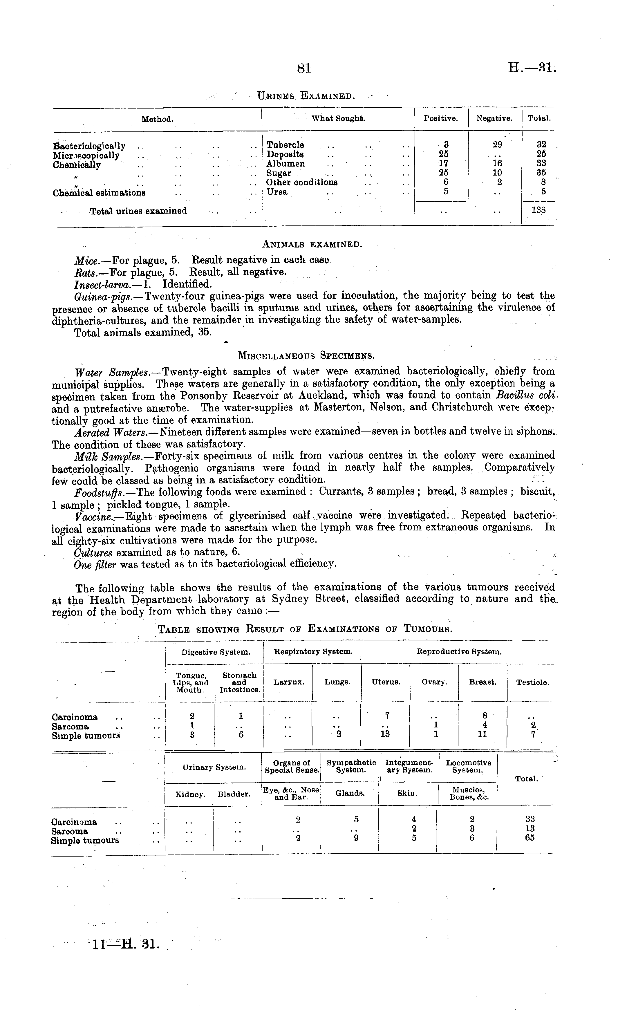 Animals examined. Mice. —For plague, 5. Result negative in each case Rats.— For plague, 5. Result, all negative. Insect-larva. —1. Identified. Guinea-figs. —Twenty-four guinea-pigs were used for inoculation, the majority being to test the presence or absence of tubercle bacilli in sputums and urines, others for ascertaining the virulence of diphtheria-cultures, and the remainder in investigating the safety of water-samples. Total animals examined, 35. Miscellaneous Specimens. Water Samples. —Twenty-eight samples of water were examined bacteriologically, chiefly from municipal supplies. These waters are generally in a satisfactory condition, the only exception being a specimen taken from the Ponsonby Reservoir at Auckland, which was found to contain Bacillus coli and a putrefactive aneerobe. The water-supplies at Masterton, Nelson, and Christchurch were exceptionally good at the time of examination. Aerated Waters. —Nineteen different samples were examined —seven in bottles and twelve in siphons. The condition of these was satisfactory. Milk Samples. —Forty-six specimens of milk from various centres in the colony were examined bacteriologically. Pathogenic organisms were found in nearly half the samples. Comparatively few could be classed as being in a satisfactory condition. Foodstuffs. —The following foods were examined : Currants, 3 samples; bread, 3 samples ; biscuit, 1 sample ; pickled tongue, 1 sample. Vaccine. —Eight specimens of glycerinised oalf vaccine were investigated. Repeated bacteriological examinations were made to ascertain when the lymph was free from extraneous organisms. In all eighty-six cultivations were made for the purpose. Cultures examined as to nature, 6. One filter was tested as to its bacteriological efficiency. The following table shows the results of the examinations of the various tumours received at the Health Department laboratory at Sydney Street, classified according to nature and the. region of the body from which they came: —