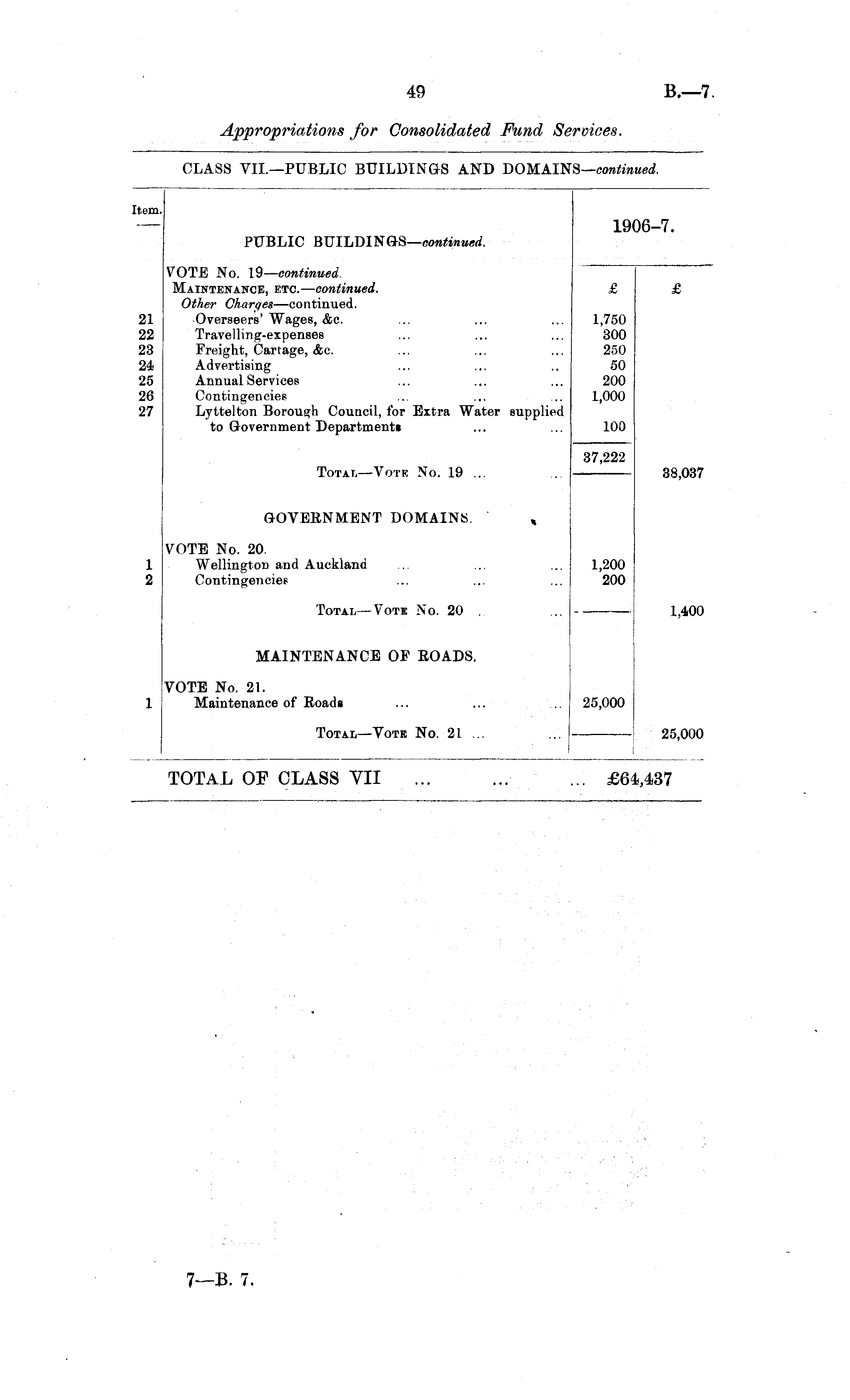 [tern. 19' i6-7. PUBLIC BUILDINGS— continued. 21 22 23 24 25 26 27 VOTE No. 19— continued. Maintenance, etc. — continued. Other Charges —continued. Overseers' Wages, &c. Travelling-expenses Freight, Cartage, &c. Advertising Annual Services Contingencies Lyttelton Borough Council, for Extra Water supplied to Government Departments £ 1,750 300 250 50 200 1,000 100 Total —Vote No. 19 ... 37,222 GOVERNMENT DOMAINS , 38,037 1 2 VOTE No. 20. Wellington and Auckland Contingencies 1,200 200 1,400 Total —Vote No. 20 MAINTENANCE OF ROADS. VOTE No. 21. Maintenance of Roads ... ... 25,000 25,000 Total—Vote No. 21 ... TOTAL OF CLASS VII £6 1,437