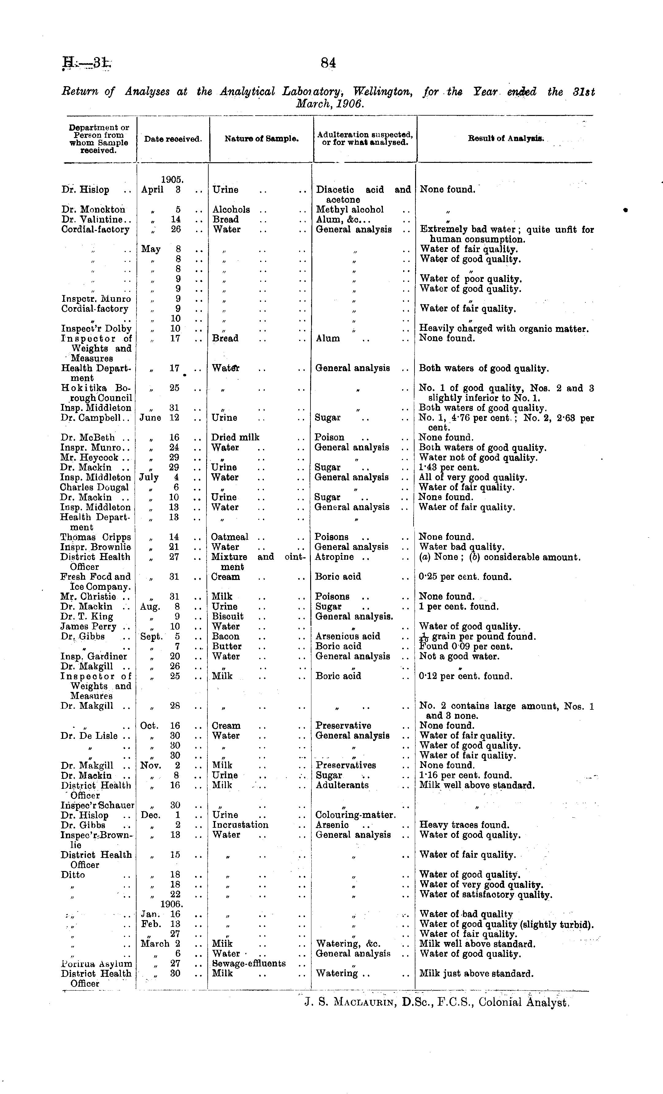 Return of Analyses at the Analytical Laboratory, Wellington, for the Year ended the 31st March, 1906.