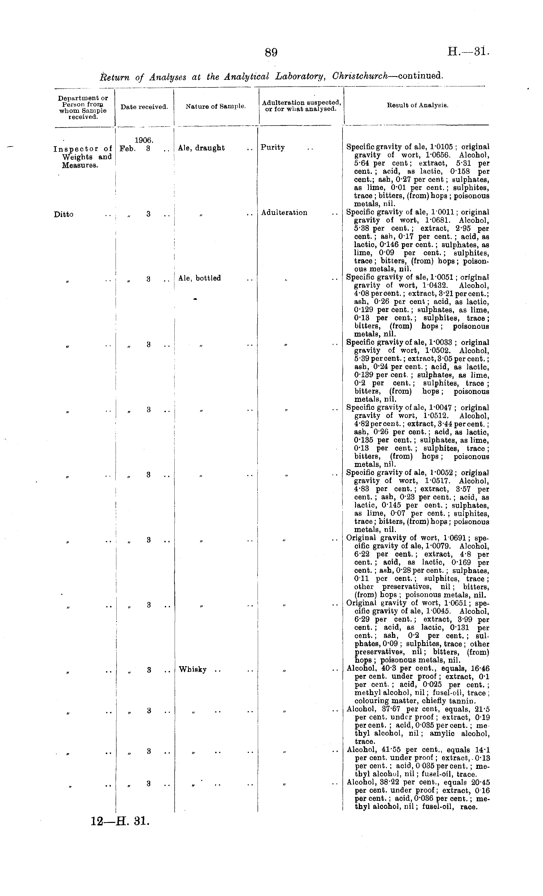 Department or Person from whom Sample received. Date received. Nature of Sample. Adulteration suspected, or for what analysed. Result of AnalyBie. nspector of Weights and Measures. 1906. Feb. 3 .. Ale, draught Purity Specific gravity of ale, 1-0105 ; original gravity of wort, 1-0656. Alcohol, 5-64 per cent; extraot, 5-31 per cent. ; acid, as lactic, 0-158 per cent.; ash, 0-27 per cent; sulphates, as lime, 0-01 per cent.; sulphites, trace ; bitters, (from) hops ; poisonous metals, nil. Specific gravity of ale, 10011; original gravity of wort, 1-0681. Alcohol, 5-38 per cent. ; extract, 2-95 per cent. ; ash, 0-17 per cent. ; acid, as lactic, 0-146 per cent.; sulphates, as lime, 0-09 per cent.; sulphites, trace; bitters, (from) hops; poisonous metals, nil. Specific gravity of ale, 1-0051; original gravity of wort, 10432. Alcohol, 4-08 percent.; extract, 3'21 percent.; ash, 0-26 per cent; acid, as lactic, 0-129 per cent.; sulphates, as lime, 0-13 per cent.; sulphites, traoe; bitters, (from) hops ; poisonous metals, nil. Specific gravity of ale, 1-0033 ; original gravity of wort, 1-0502. Alcohol, 5-39 percent.; extract, 3-05 per cent.; ash, 0-24 per cent.; acid, as lactic, 0-139 per cent. ; sulphates, as lime, 0-2 per oent. ; sulphites, trace ; bitters, (from) hops; poisonous metals, nil. Specific gravity of ale, 1-0047 ; original gravity of wort, 1-0512. Alcohol, 4-82 percent.; extract, 3-44 per cent.; ash, 026 per cent.; acid, as lactic, 0-135 per cent. ; sulphates, as lime, 0-13 per cent. ; sulphites, trace; bitters, (from) hops ; poisonous metals, nil. Specific gravity of ale, 1 -0052 ; original gravity of wort, 1-0517. Alcohol, 4-83 per cent.; extract, 3'57 per cent. ; asb, 0-23 per cent. ; acid, as lactic, 0-145 per oent. ; sulphates, as lime, 0-07 per cent. ; sulphites, trace ; bitters, (from) hops ; poisonous metals, nil. Original gravity of wort, 10691; specific gravity of ale, 1-0079. Alcohol, 6-22 per cent. ; extract, 4-8 per cent. ; acid, as lactic, 0-169 per cent. ; ash, 0-28 per cent. ; sulphates, 011 per cent,; sulphites, trace ; other preservatives, nil; bitters, (from) hops ; poisonous metals, nil. Original gravity of wort, 1-0051; specific gravity of ale, 10045. Alcohol, 6-29 per cent.; extract, 3-99 per cent. ; acid, as lactic, 0-131 per cent.; ash, 0-2 per cent. ; sulphates, 0-09 ; sulphites, trace ; other preservatives, nil; bitters, (from) hops ; poisonous metals, nil. Alcohol, 40-3 per cent., equals, 1646 per cent, under proof; extraot, 0-1 per cent. ; acid, 0025 per cent. ; methyl alcohol, nil; fusel-oil, trace ; colouring matter, chiefly tannin. Alcohol, 37'67 per cent, equals, 21-5 per cent, under proof; extract, 019 percent. ; acid, 0-035 percent. ; me thyl alcohol, nil; amylic alcohol, trace. Alcohol, 41-55 per cent., equals 14-1 per cent, under proof; extract,. 0-13 per cent.; acid, 0 035 percent.; methyl alcohol, nil; fusel-oil, trace. Alcohol, 38-22 per cent., equals 20-45 per cent, under proof; extract, 0 16 per cent.; acid, 0-036 per cent.; methyl alcohol, nil; fusel-oil, race. Jitto 3 Adulteration 3 .. Ale, bottled 3 i 3 3 3 3 it 3 Whisky .. 3 3 ti • • # 3 u • • . t 31.