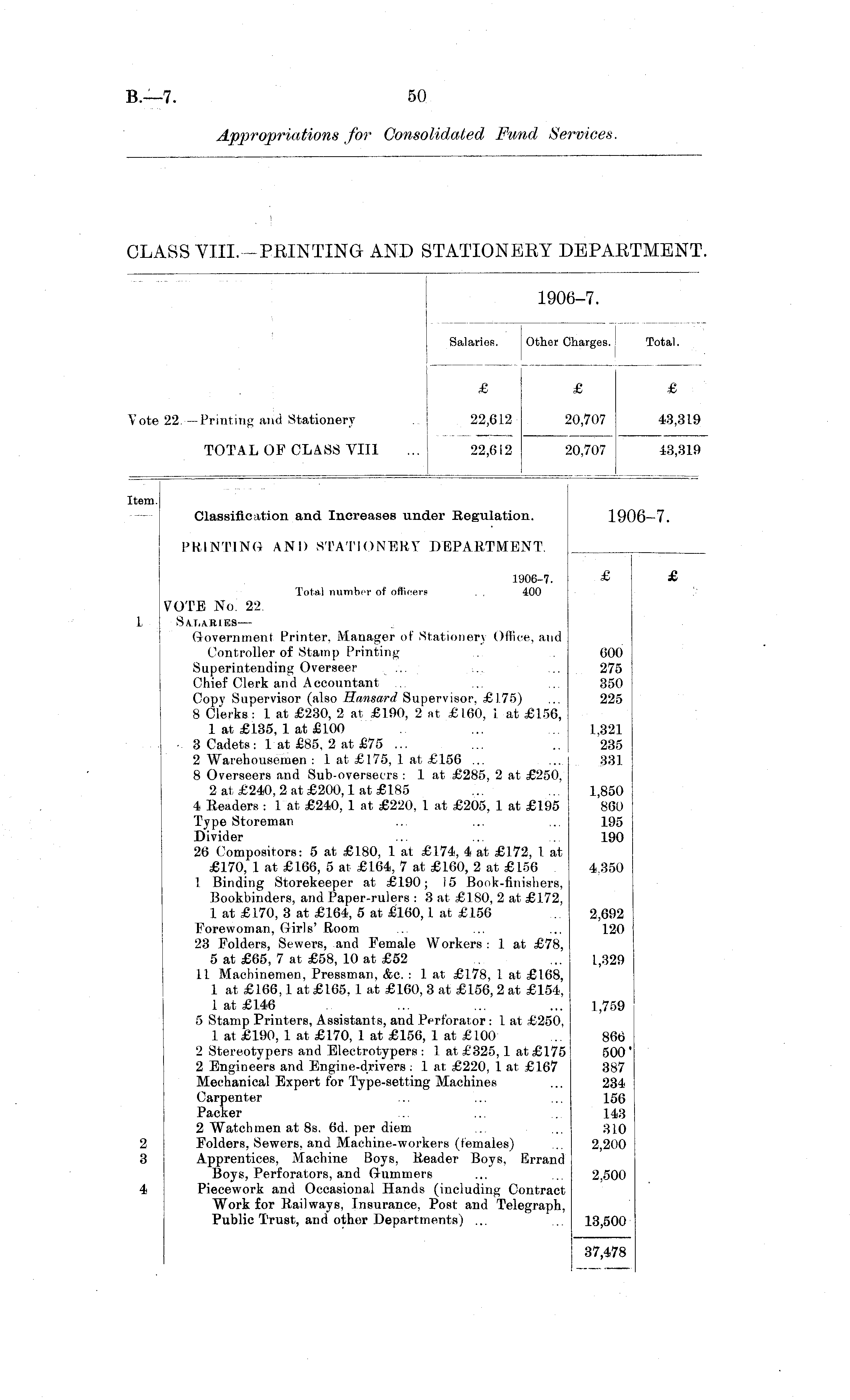 -l o\j\j — I . Salaries. Other Charges. Total. £ £ £ k 7 ote 22. — Printing and Stationery 22,612 20,707 43,319 TOTAL OF CLASS VIII 22,6 i2 !0,707 43,319 :tem. Classification and Increases under Regulation. 19 '6-7. PRINTING AND STATIONERY DEPARTMENT. 1906-7. Total number of officers . , 400 £ 1 VOTE No. 22 Salaries— Government Printer, Manager of Stationery Office, and Controller of Stamp Printing Superintending Overseer . Chief Clerk and Accountant ... Copy Supervisor (also Hansard Supervisor. £175) 8 Clerks : 1 at £230, 2 at £190, 2 at £160, 1 at £156, 1 at £135, 1 at £100 - 3 Cadets : 1 at £85, 2 at £75 ... 2 Warehousemen : 1 at £175, 1 at £156 ... 8 Overseers and Sub-overseers -. 1 at £285, 2 at £250, 2 at £240, 2 at £200,1 at £185 4 Readers : 1 at, £240, 1 at £220, 1 at £205, 1 at £195 Type Storeman Divider 26 Compositors: 5 at £180, 1 at £174, 4 at £172, 1 at £170, 1 at £166, 5 at £164, 7 at £160, 2 at £156 1 Binding Storekeeper at £190; 15 Book-finishers, Bookbinders, and Paper-rulers : 3 at £180, 2 at £172, 1 at £170, 3 at £164, 5 at £160,1 at £156 F'orewoman, Girls' Room 23 Folders, Sewers, and Female Workers : 1 at £78, 5 at £65, 7 at £58, 10 at £52 11 Machinemen, Pressman, &c. : 1 at £178, 1 at £168, 1 at £166,1 at £165, 1 at £160, 3 at £156, 2 at £154, 1 at £146 5 Stamp Printers, Assistants, and Pprforator : 1 at £250, 1 at £190, 1 at £170, 1 at £156, 1 at £100 2 Stereotypers and Electrotypers : 1 at £325, 1 at £175 2 Engineers and Engine-drivers : 1 at £220, 1 at £167 Mechanical Expert for Type-setting Machines Carpenter Packer 2 Watchmen at 8s. 6d. per diem Folders, Sewers, and Machine-workers (females) Apprentices, Machine Boys, Reader Boys, Errand Boys, Perforators, and Gummers Piecework and Occasional Hands (including Contract Work for Railways, Insurance, Post and Telegraph, Public Trust, and other Departments) ... 600 275 350 225 1,321 235 331 1,850 860 195 190 4,350 2,692 120 1,329 1,759 866 500' 387 234 156 143 310 2,200 2 3 4 2,500 13,500 37,478
