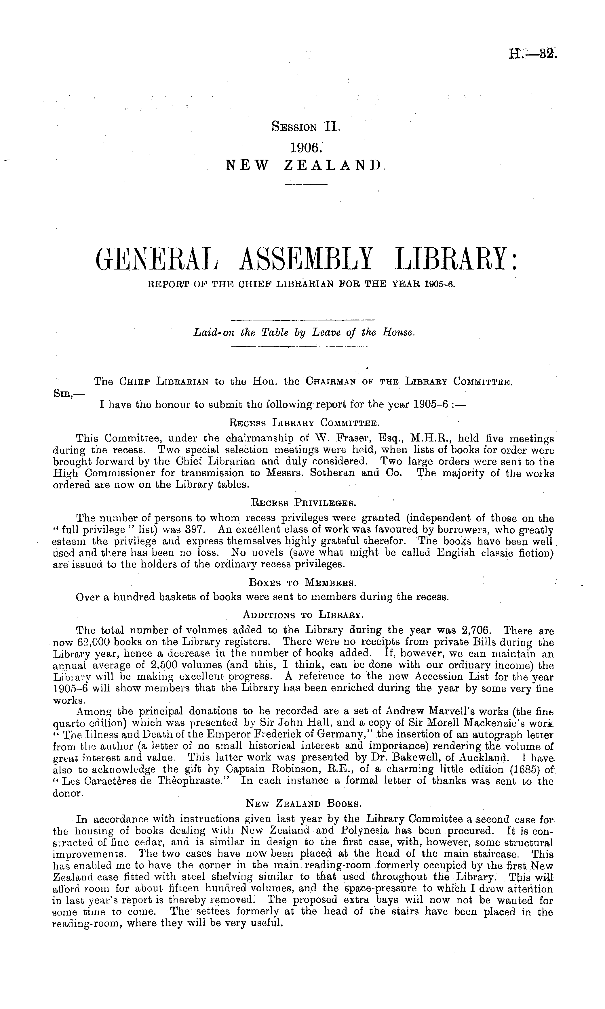 The Chief Librarian to the Hon. the Chairman of the Library Committee. Sir, — I have the honour to submit the following report for the year 1905-6 :— Recess Library Committee. This Committee, under the chairmanship of W. Fraser, Esq., M.H.R., held five meetings during the recess. Two special selection meetings were held, when lists of books for order were brought forward by the Chief Librarian and duly considered. Two large orders were sent to the High Commissioner for transmission to Messrs. Sotheran and Co. The majority of the works ordered are now on the Library tables. Recess Privileges. The number of persons to whom recess privileges were granted (independent of those on the " full privilege " list) was 397. An excellent class of work was favoured by borrowers, who greatly esteem the privilege and express themselves highly grateful therefor. The books have been well used and there has been no loss. No novels (save what might be called English classic fiction) are issued to the holders of the ordinary recess privileges. Boxes to Members. Over a hundred baskets of books were sent to members during the recess. Additions to Library. The total number of volumes added to the Library during the year was 2,706. There are now 62,000 books on the Library registers. There were no receipts from private Bills during the Library year, hence a decrease in the number of books added. If, however, we can maintain an annual average of 2,500 volumes (and this, I think, can be done with our ordinary income) the Library will be making excellent progress. A reference to the new Accession List for the year 1905-6 will show members that the Library has been enriched during the year by some very fine works. Among the principal donations to be recorded are a set of Andrew Marvell's works (the firm quarto edition) which was presented by Sir John Hall, and a copy of Sir Morell Mackenzie's wort " The Illness and Death of the Emperor Frederick of Germany," the insertion of an autograph letter from the author (a letter of no small historical interest and importance) rendering the volume of great interest and value. This latter work was presented by Dr. Bakewell, of Auckland. I have also to acknowledge the gift by Captain Robinson, R.E., of a charming little edition (1685) of " Les Caracteres de Theophraste." In each instance a formal letter of thanks was sent to the donor. New Zealand Books. In accordance with instructions given last year by the Library Committee a second case for the housing of books dealing with New Zealand and Polynesia has been procured. It is constructed of fine cedar, and is similar in design to the first case, with, however, some structural improvements. The two cases have now been placed at the head of the main staircase. This has enabled me to have the corner in the main reading-room formerly occupied by the first New Zealand case fitted with steel shelving similar to that used throughout the Library. This will afford room for about fifteen hundred volumes, and the space-pressure to which I drew attention in last year's report is thereby removed. The proposed extra bays will now not be wanted for some time to come. The settees formerly at the head of the stairs have been placed in the reading-room, where they will be very useful.