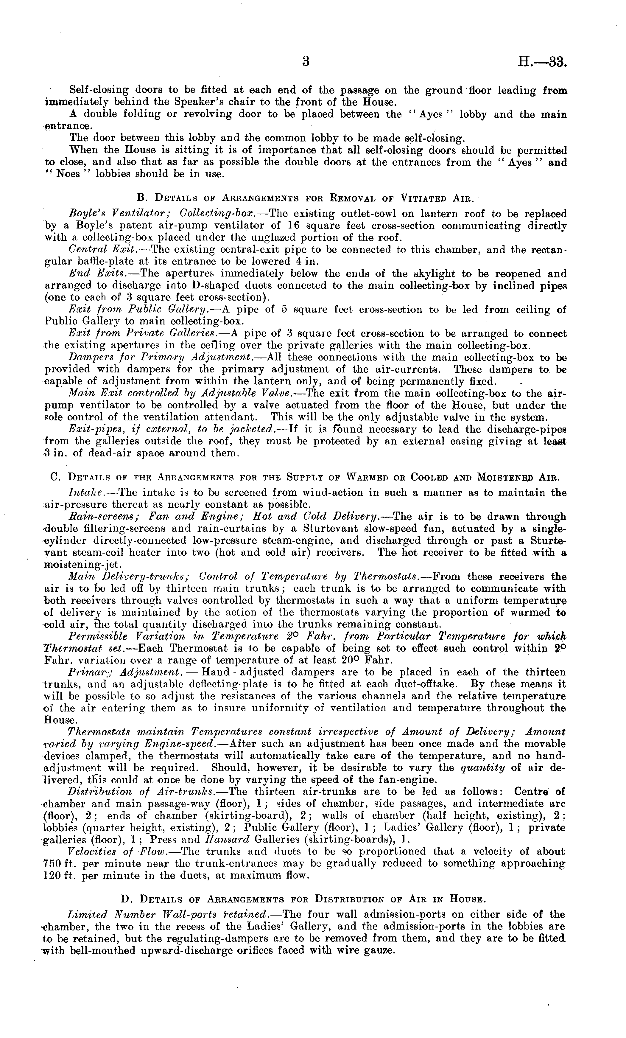 Self-closing doors to be fitted at each end of the passage on the ground floor leading from immediately behind the Speaker's chair to the front of the House. A double folding or revolving door to be placed between the "Ayes" lobby and the main entrance. The door between this lobby and the common lobby to be made self-closing. When the House is sitting it is of importance that all self-closing doors should be permitted to close, and also that as far as possible the double doors at the entrances from the " Ayes " and " Noes " lobbies should be in use. B. Details op Arrangements for Removal of Vitiated Am. Boyle's Ventilator; Collecting-box. —The existing outlet-cowl on lantern roof to be replaced by a Boyle's patent air-pump ventilator of 16 square feet cross-section communicating directly with a collecting-box placed under the unglazed portion of the roof. Central Exit. —The existing central-exit pipe to be connected to this chamber, and the rectangular baffle-plate at its entrance to be lowered 4 in. End, Exits. —The apertures immediately below the ends of the skylight to be reopened and arranged to discharge into D-shaped ducts connected to the main collecting-box by inclined pipes (one to each of 3 square feet cross-section). Exit from Public Gallery. —A pipe of 5 square feet cross-section to be led from ceiling of Public Gallery to main collecting-box. Exit from Private Galleries. —A pipe of 3 square feet cross-section to be arranged to connect the existing apertures in the ceiling over the private galleries with the main oollecting-box. Dampers for Primary Adjustment. —All these connections with the main collecting-box to be provided with dampers for the primary adjustment of the air-currents. These dampers to be capable of adjustment from within the lantern only, and of being permanently fixed. Main Exit controlled by Adjustable Valve. —The exit from the main collecting-box to the airpump ventilator to be controlled by a valve actuated from the floor of the House, but under the sole control of the ventilation attendant. This will be the only adjustable valve in the system. Exit-pipes, if external, to be jacketed. —lf it is found necessary to lead the discharge-pipes from the galleries outside the roof, they must be protected by an external casing giving at least 3 in. of dead-air space around them. C. Details of the Arrangements for the Supply of Warmed or Cooled and Moistenep Air. Intake. —The intake is to be screened from wind-action in such a manner as to maintain the air-pressure thereat as nearly constant as possible. Rain-screens; Fan and, Engine; Hot and Cold Delivery. —The air is to be drawn through double filtering-screens and rain-curtains by a Sturtevant slow-speed fan, actuated by a singlec}dinder directly-connected low-pressure steam-engine, and discharged through or past a Sturtevant steam-coil heater into two (hot and cold air) receivers. The hot receiver to be fitted with a moistening-jet. Main Delivery-trunks; Control of Temperature by Thermostats. —From these receivers the air is to be led off by thirteen main trunks ; each trunk is to be arranged to communicate with both receivers through valves controlled by thermostats in such a way that a uniform temperature of delivery is maintained by the action of the thermostats varying the proportion of warmed to cold air, the total quantity discharged into the trunks remaining constant. Permissible Variation in Temperature 2° Fahr. from Particular Temperature for which Thermostat set. —Each Thermostat is to be capable of being set to effect such control within 2° Fahr. variation over a range of temperature of at least 20° Fahr. Primar-; Adjustment. — Hand - adjusted dampers are to be placed in each of the thirteen trunks, and an adjustable deflecting-plate is to be fitted at each duct-offtake. By these means it will be possible to so adjust the resistances of the various channels and the relative temperature of the air entering them as to insure uniformity of ventilation and temperature throughout the House. Thermostats maintain Temperatures constant irrespective of Amount of Delivery; Amount varied by varying Engine-speed. —After such an adjustment has been once made and the movable devices clamped, the thermostats will automatically take care of the temperature, and no handadjustment will be required. Should, however, it be desirable to vary the quantity of air delivered, this could at once be done by varying the speed of the fan-engine. Distribution of Air-trunks. —The thirteen air-trunks are to be led as follows: Centre of chamber and main passage-way (floor), 1; sides of chamber, side passages, and intermediate arc (floor), 2 ; ends of chamber (skirting-board), 2; walls of chamber (half height, existing), 2; lobbies (quarter height, existing), 2; Public Gallery (floor), 1 ; Ladies' Gallery (floor), 1 ; private galleries (floor), 1; Press and Hansard Galleries (skirting-boards), 1. Velocities of Flow. —The trunks and ducts to be so proportioned that a velocity of about 750 ft. per minute near the trunk-entrances may be gradually reduced to something approaching 120 ft. per minute in the ducts, at maximum flow. D. Details of Arrangements for Distribution of Air in House. Limited Number Wall-ports retained. —The four wall admission-ports on either side of the -chamber, the two in the recess of the Ladies' Gallery, and the admission-ports in the lobbies are to be retained, but the regulating-dampers are to be removed from them, and they are to be fitted .nth bell-mouthed upward-discharge orifices faced with wire gauze.