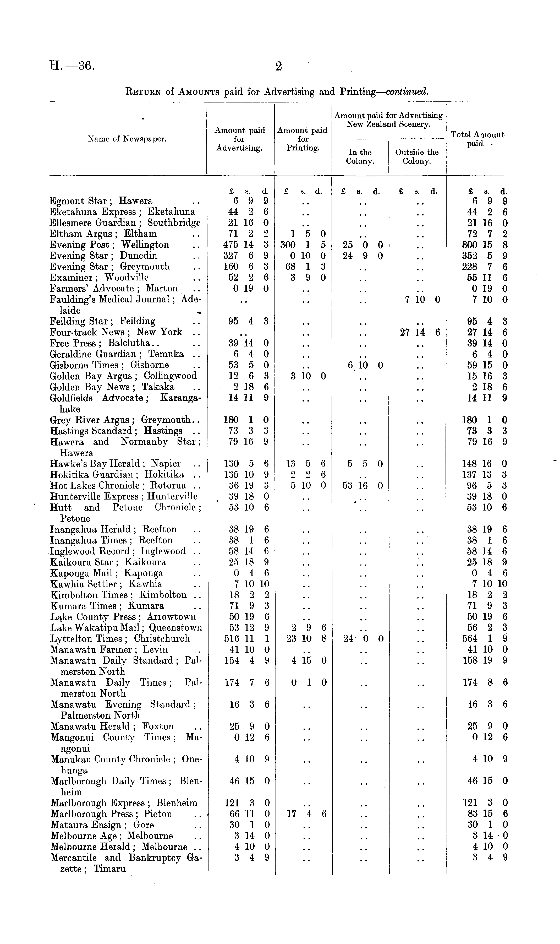 Amount paid Amount paid for Advertising New Zealand Scenery. Name of Newspaper. Amount paid for Advertising. Total Amount paid • Printing. In the Colony. Outside the Colony. £ s. d. 6 9 9 44 2 6 21 16 0 71 2 2 475 14 3 327 6 9 160 6 3 52 2 6 0 19 0 £ s. d. £ s. d. £ s. d. £ a. d. 6 9 9 44 2 6 21 16 0 72 7 2 800 15 8 352 5 9 228 7 6 55 11 6 0 19 0 7 10 0 Egmont Star ; Hawera Eketahuna Express ; Eketaliuna Ellesmere Guardian ; Southbridge Eltham Argus ; Eltham Evening Post; Wellington Evening Star; Dunedin Evening Star ; Greymouth Examiner ; Woodville Farmers' Advocate ; Marton Faulding's Medical Journal; Adelaide Feilding Star; Feilding Four-track News ; New York .. Free Press ; Balclutha Geraldine Guardian ; Temuka .. Gisborne Times ; Gisborne Golden Bay Argus ; Collingwood Golden Bay News ; Takaka Goldfields Advocate; Karangahake Grey Kiver Argus ; Greymouth.. Hastings Standard ; Hastings .. Hawera and Normanby Star; Hawera Hawke's Bay Herald ; Napier Hokitika Guardian ; Hokitika .. Hot Lakes Chronicle ; Rotorua .. Hunterville Express ; Hunterville Hutt and Petone Chronicle; Petone Inangahua Herald ; Reef ton Inangahua Times ; Reefton Inglewood Record ; Inglewood .. Kaikoura Star ; Kaikoura Kaponga Mail; Kaponga Kawhia Settler ; Kawhia Kimbolton Times ; Kimbolton .. Kumara Times ; Kumara La.ke County Press ; Arrowtown Lake Wakatipu Mail; Queenstown Lyttelton Times ; Christchurch Manawatu Farmer ; Levin Manawatu Daily Standard; Palmerston North Manawatu Daily Times; Palmerston North Manawatu Evening Standard; Palmerston North Manawatu Herald ; Foxton Mangonui County Times; Mangonui Manukau County Chronicle ; Onehunga Marlborough Daily Times ; Blenheim Marlborough Express ; Blenheim Marlborough Press ; Picton Mataura Ensign ; Gore Melbourne Age ; Melbourne Melbourne Herald ; Melbourne . . Mercantile and Bankruptcy Gazette : Timaru 95 4 3 39 14 0 6 4 0 53 5 0 12 6 3 2 18 6 14 11 9 180 1 0 73 3 3 79 16 9 130 5 6 135 10 9 36 19 3 39 18 0 53 10 6 38 19 6 38 1 6 58 14 6 25 18 9 0 4 6 7 10 10 18 2 2 71 9 3 50 19 6 53 12 9 516 11 1 41 10 0 154 4 9 1 5 0 300 1 5 0 10 0 68 1 3 3 9 0 3 io o 13 5 6 2 2 6 5 10 0 25 0 24 9 6 10 5 5 53 16 0 0 0 0 0 7 10 27 14 0 6 95 4 3 27 14 6 39 14 0 6 4 0 59 15 0 15 16 3 2 18 6 14 11 9 180 1 0 73 3 3 79 16 9 148 16 0 137 13 3 96 5 3 39 18 0 53 10 6 38 19 6 38 1 6 58 14 6 25 18 9 0 4 6 7 10 10 18 2 2 71 9 3 50 19 6 56 2 3 564 1 9 41 10 0 158 19 9 2 9 6 23 10 8 24 0 0 4 15 0 174 7 6 0 1 0 174 8 6 16 3 6 16 3 6 25 9 0 0 12 6 25 9 0 0 12 6 4 10 9 4 10 9 46 15 0 46 15 0 121 3 0 66 11 0 30 1 0 3 14 0 4 10 0 3 4 9 17 4 6 121 3 0 83 15 6 30 1 0 3 14 0 4 10 0 3 4 9