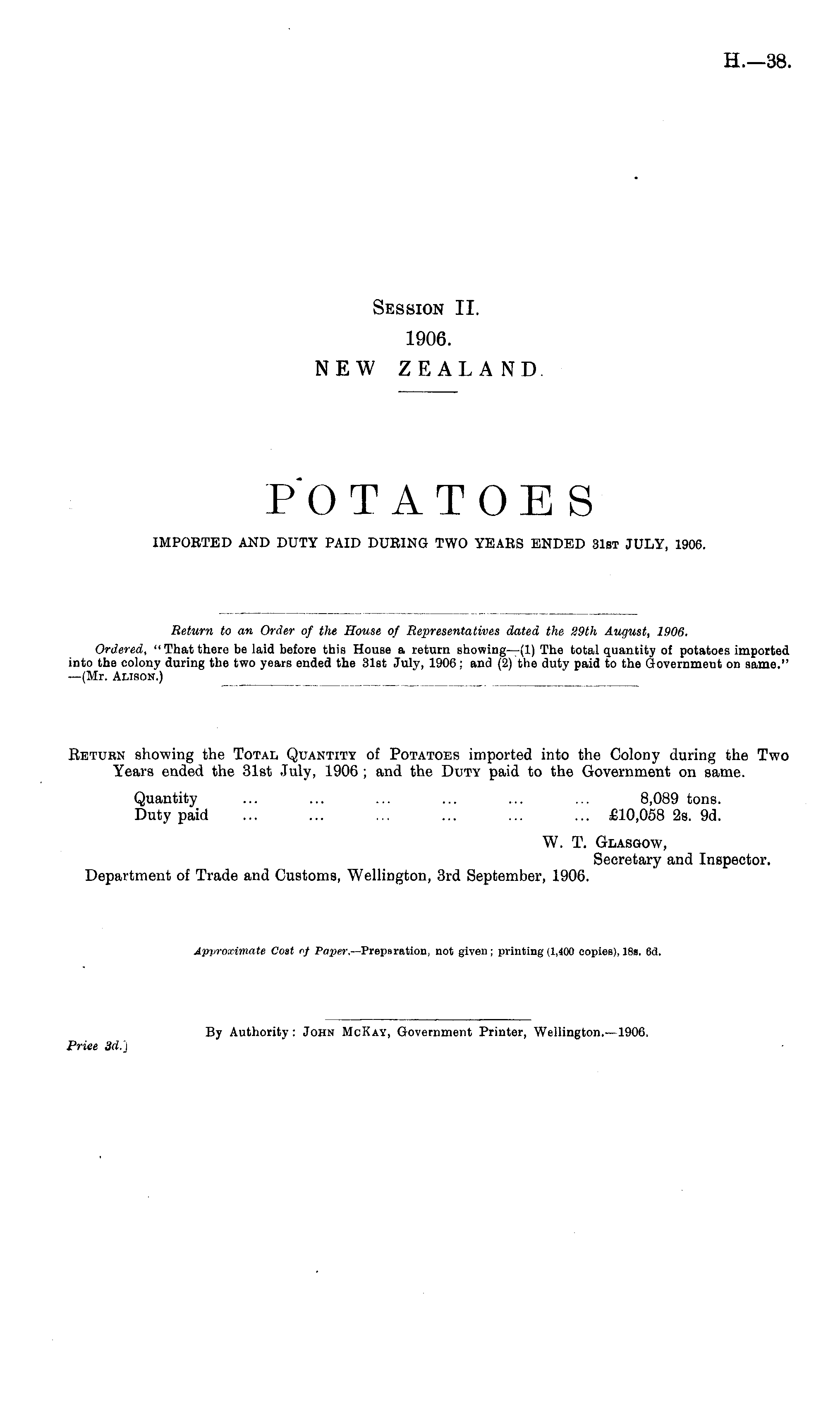 Return to an Order of the House of Representatives dated the 29th August, 1906. Ordered, " That there be laid before this House a return showing—(l) The total quantity of potatoes imported into the colony during the two years ended the 31st July, 1906; and (2) the duty paid to the Government on same." —(Mr. Alison.) Return showing the Total Quantity of Potatoes imported into the Colony during the Two Years ended the 31st July, 1906 ; and the Duty paid to the Government on same. Quantity ... ... ... ... ... ... 8,089 tons. Duty paid ... ... ... ... ... ... £10,058 2s. 9d. W. T. Glasgow, Secretary and Inspector. Department of Trade and Customs, Wellington, 3rd September, 1906.