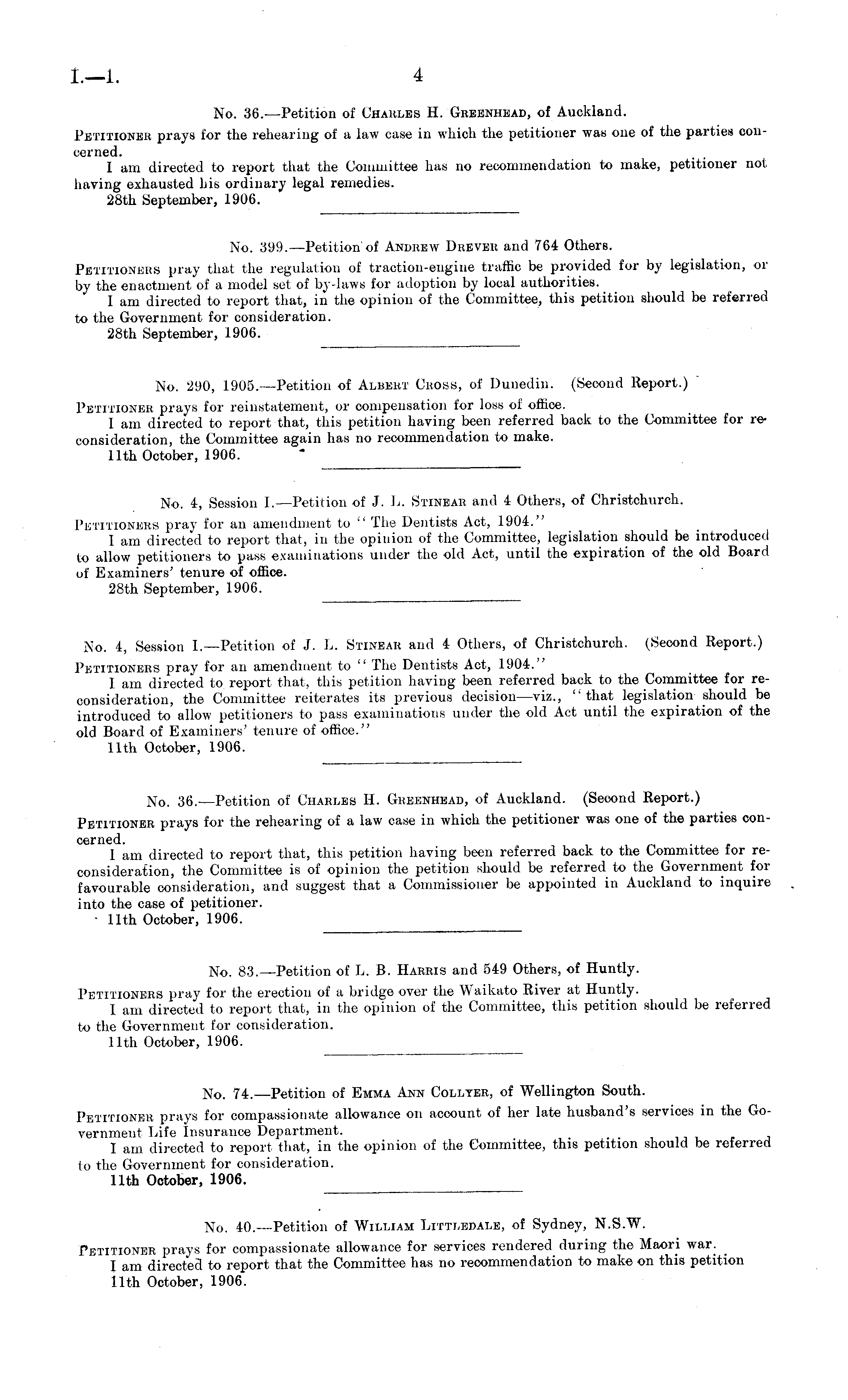 No. 399.—Petition of Andrew Drever and 764 Others. Petitioners pray that the regulation of traction-engine traffic be provided for by legislation, or by the enactment of a model set of by-laws for adoption by local authorities. I am directed to report that, in the opinion of the Committee, this petition should be referred to the Government for consideration. 28th September, 1906. No. 290, 1905.—Petition of Albert Cross, of Dunedin. (Second Report.) Petitioner prays for reinstatement, or compensation for loss of office. I am directed to report that, this petition having been referred back to the Committee for reconsideration, the Committee again has no recommendation to make. 11th October, 1906. No. 4, Session I.—Petition of J. L. Stinear and 4 Others, of Christchurch. Petitioners pray for an amendment to " The Dentists Act, 1904." I am directed to report that, in the opinion of the Committee, legislation should be introduced to allow petitioners to pass examinations under the old Act, until the expiration of the old Board of Examiners' tenure of office. 28th September, 1906. No. 4, Session I.—Petition of J. h. Stinear and 4 Others, of Christchurch. (Second Report.) Petitioners pray for an amendment to " The Dentists Act, 1904." I am directed to report that, this petition having been referred back to the Committee for reconsideration, the Committee reiterates its previous decision—viz., "that legislation should be introduced to allow petitioners to pass examinations under the old Act until the expiration of the old Board of Examiners' tenure of office." 11th October, 1906. No, 36.—Petition of Charles H. Greenhead, of Auckland. (Second Report.) Petitioner prays for the rehearing of a law case in which the petitioner was one of the parties concerned. I am directed to report that, this petition having been referred back to the Committee for reconsideration, the Committee is of opinion the petition should be referred to the Government for favourable consideration, and suggest that a Commissioner be appointed in Auckland to inquire into the case of petitioner. • 11th October, 1906. No. 83.—Petition of h. B. Harris and 549 Others, of Huntly. Petitioners pray for the erection of a bridge over the Waikato River at Huntly. I am directed to report that, in the opinion of the Committee, this petition should be referred to the Government for consideration. 11th October, 1906. No. 74.—Petition of Emma Ann Collyer, of Wellington South. Petitioner prays for compassionate allowance on account of her late husband's services in the Government Life Insurance Department. I am directed to report that, in the opinion of the Committee, this petition should be referred to the Government for consideration. 11th October, 1906. No. 40.—Petition of William Littledale, of Sydney, N.S.W. Petitioner prays for compassionate allowance for services rendered during the Maori war. I am directed to report that the Committee has no recommendation to make on this petition 11th October, 1906.