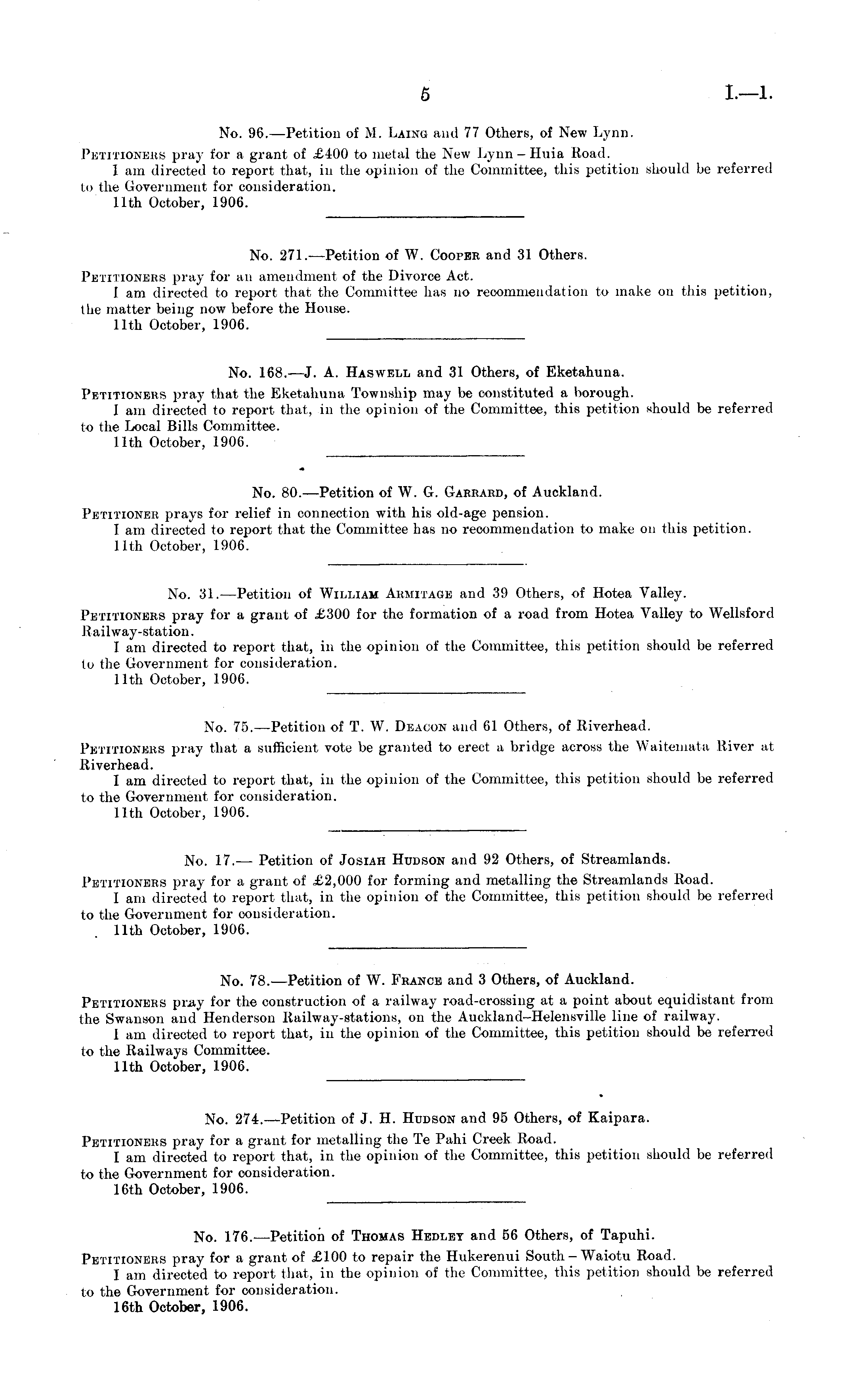 No. 96.—Petition of M. Laing and 77 Others, of New hynn. Petitioners pray for a grant of £400 to metal the New hynn - Huia Road. 1 am directed to report that, in the opinion of the Committee, this petition should be referred to the Government for consideration. 11th October, 1906.