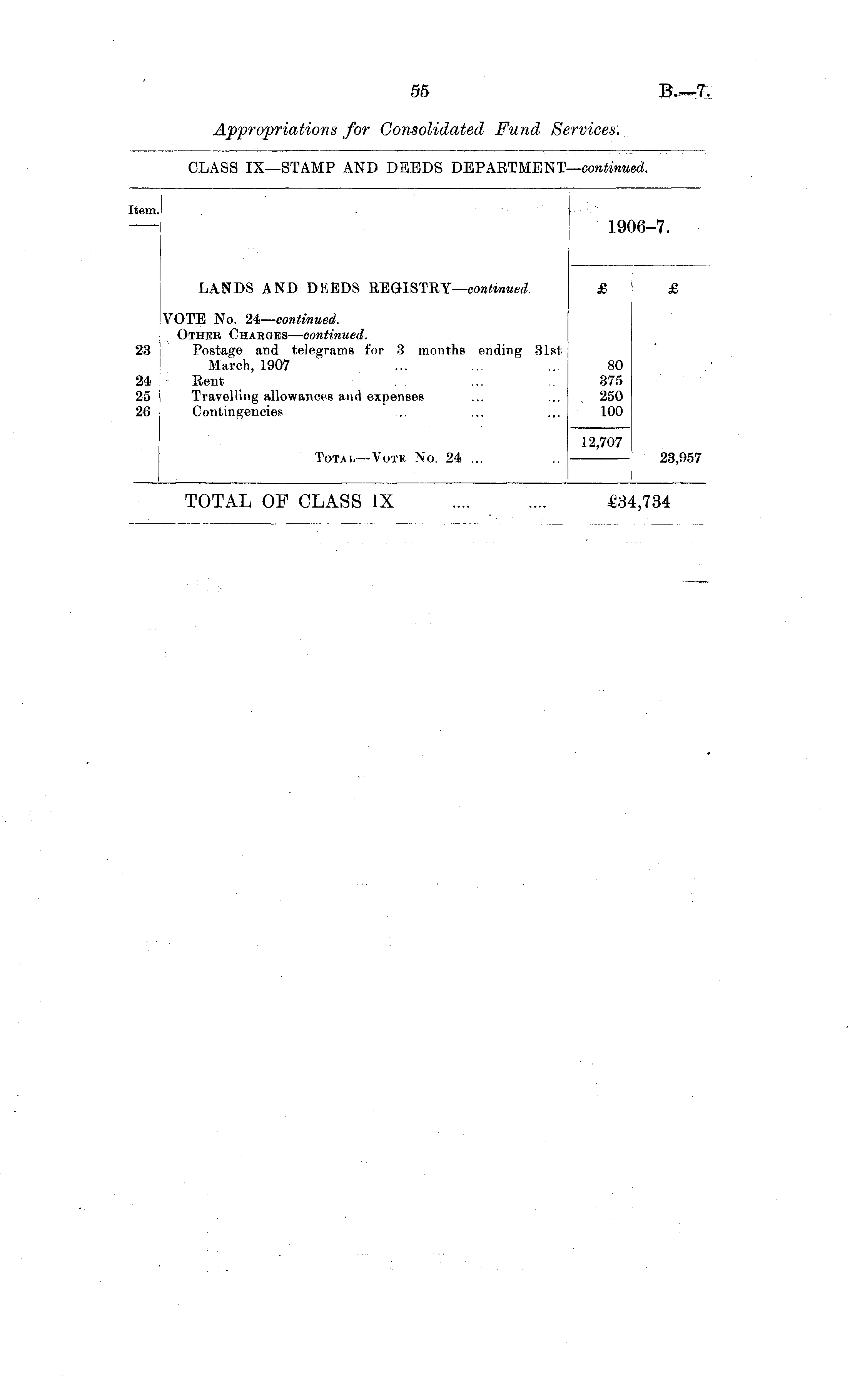 Item. 19 '6-7. LANDS AND DEEDS REGISTRY— continued. £ 23 24 25 26 VOTE No. 24— continued. Other Charges— continued. Postage and telegrams for 3 months ending 31st March, 1907 Rent Travelling allowances and expenses Contingencies 80 375 250 100 23,957 Total—Vote No. 24 ... 12,707 TOTAL OF CLASS JX m 734